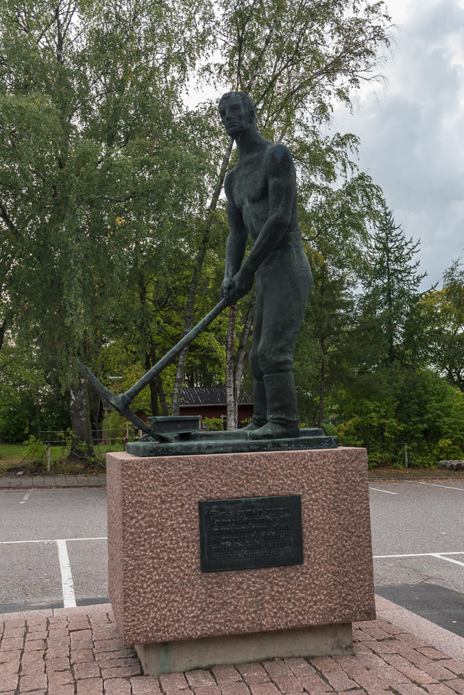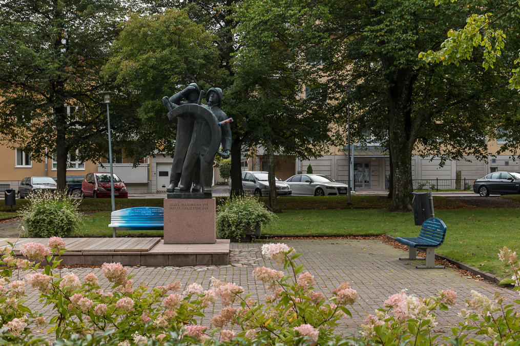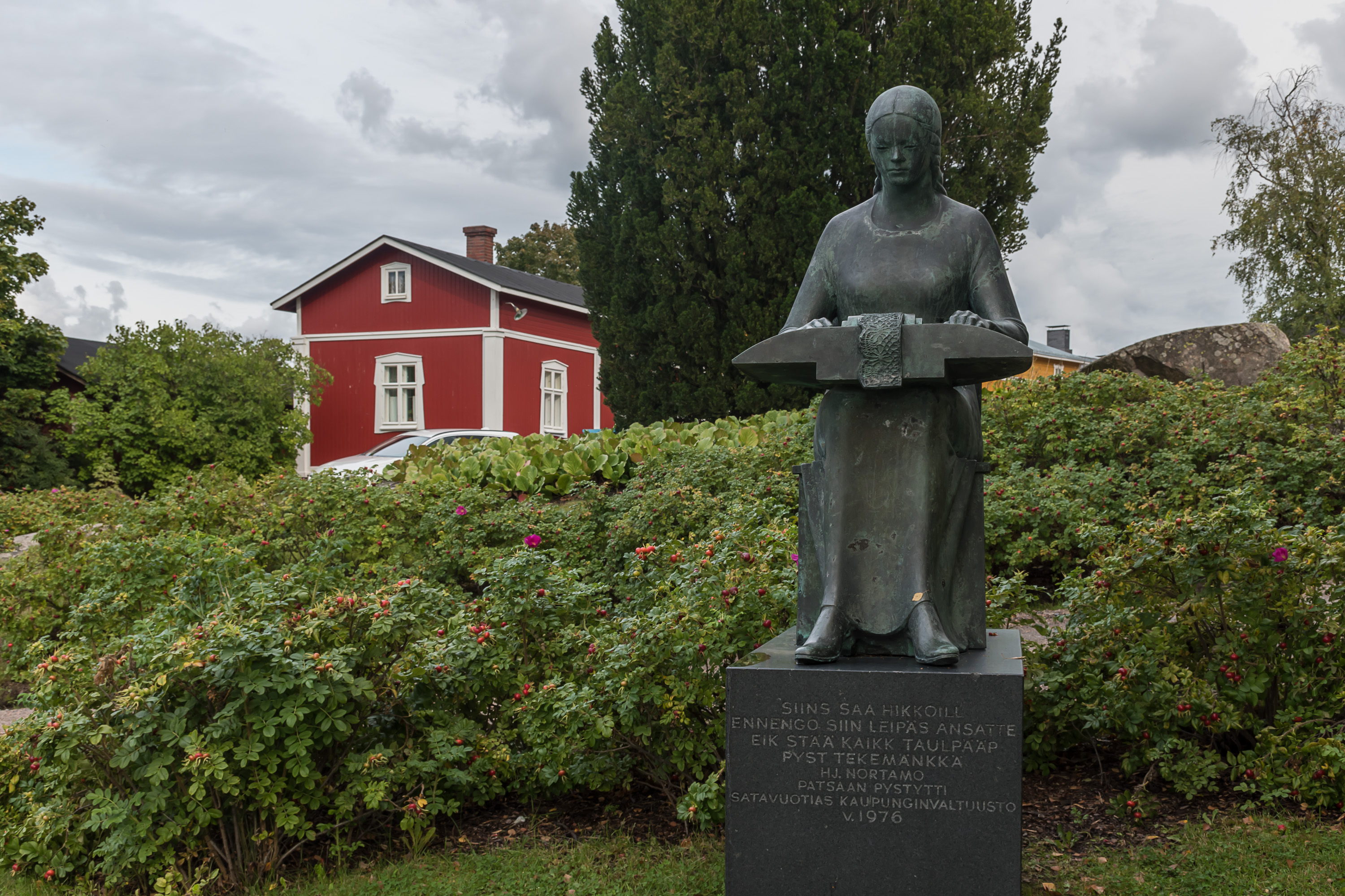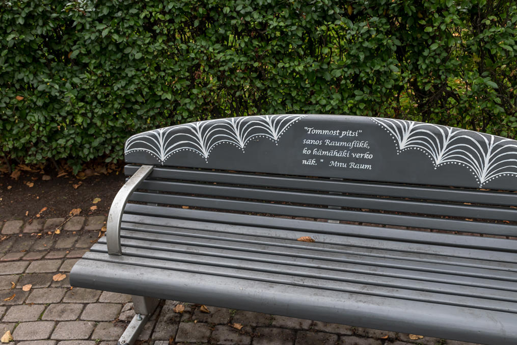 6. На памятнике плетельщице кружев (как уже упоминалось, это традиционное для Раумы ремесло) цитата Ялмара Нортамо (Hjalmar Nortamo, 1860-1931), самого известного писавшего непосредственно на раумском диалекте писателя. На литературном финском фраза, если я ее правильно перевел, будет звучать как Siinä saa hikoilla ennen kuin sinun leipäsi ansaitset, eivätkä sitä kaikki taulapäät pysty tekemäänkään. — "Там придется попотеть, пока не заработаешь себе на хлеб, да и это-то не все дурни осилят".