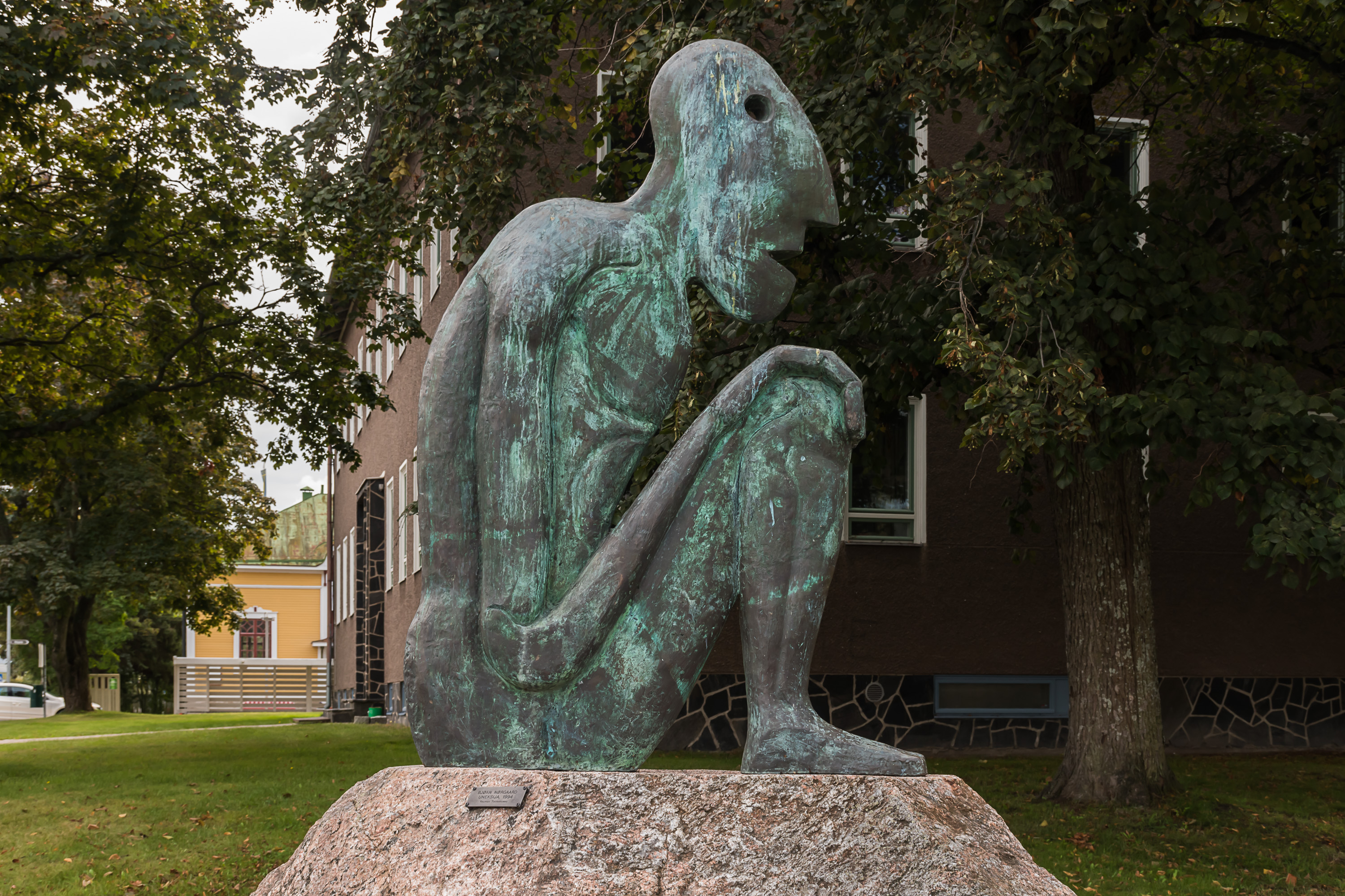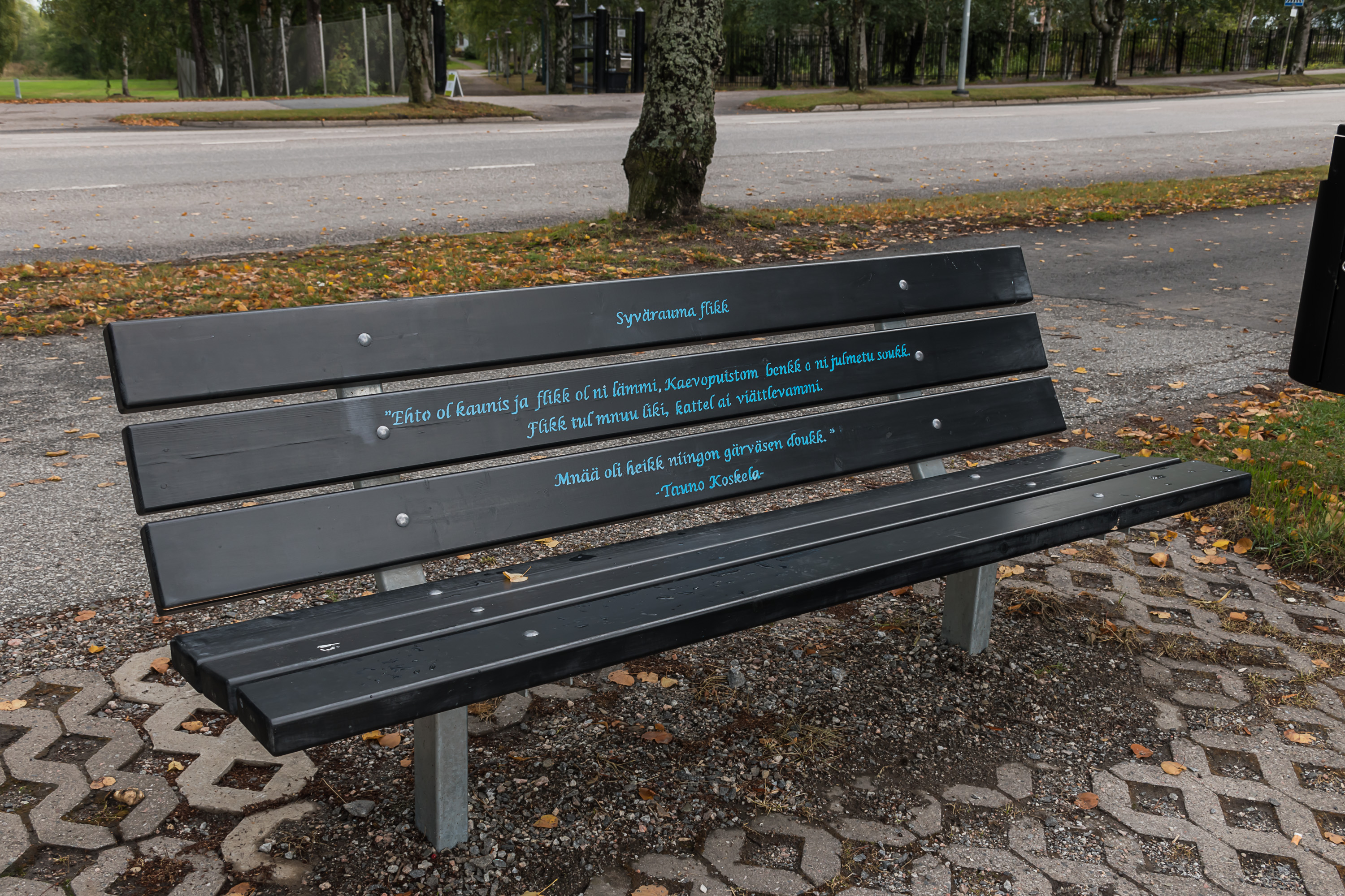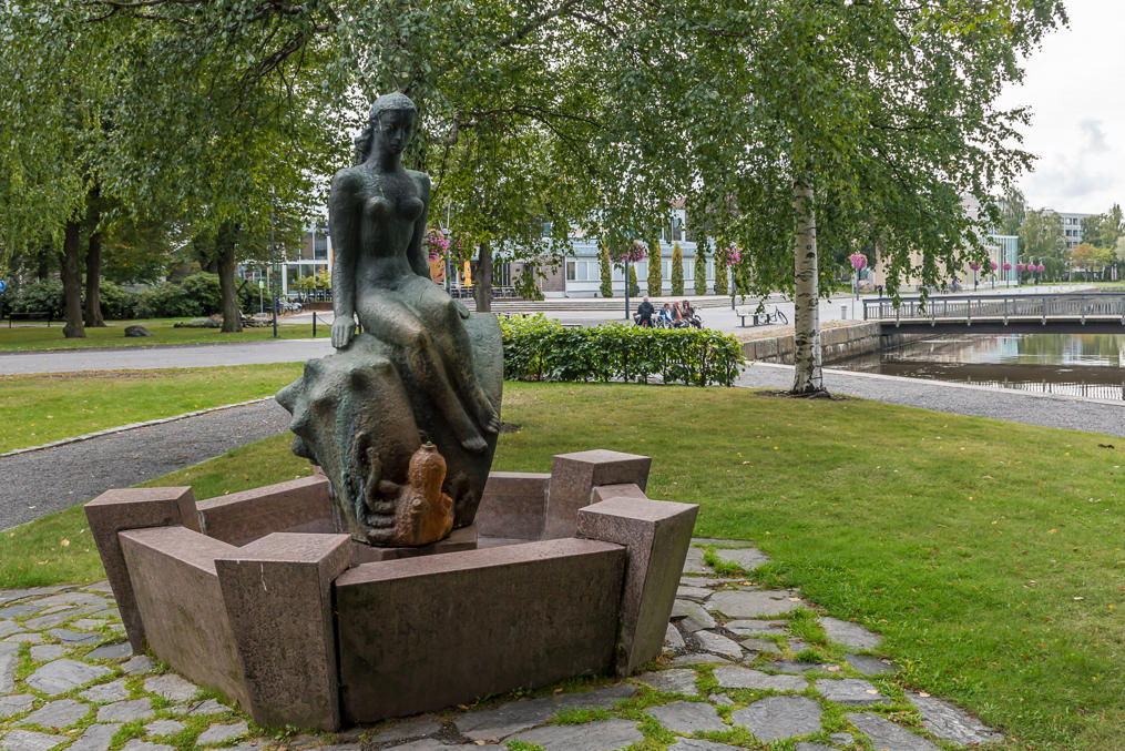 6. На памятнике плетельщице кружев (как уже упоминалось, это традиционное для Раумы ремесло) цитата Ялмара Нортамо (Hjalmar Nortamo, 1860-1931), самого известного писавшего непосредственно на раумском диалекте писателя. На литературном финском фраза, если я ее правильно перевел, будет звучать как Siinä saa hikoilla ennen kuin sinun leipäsi ansaitset, eivätkä sitä kaikki taulapäät pysty tekemäänkään. — "Там придется попотеть, пока не заработаешь себе на хлеб, да и это-то не все дурни осилят".