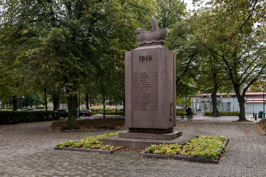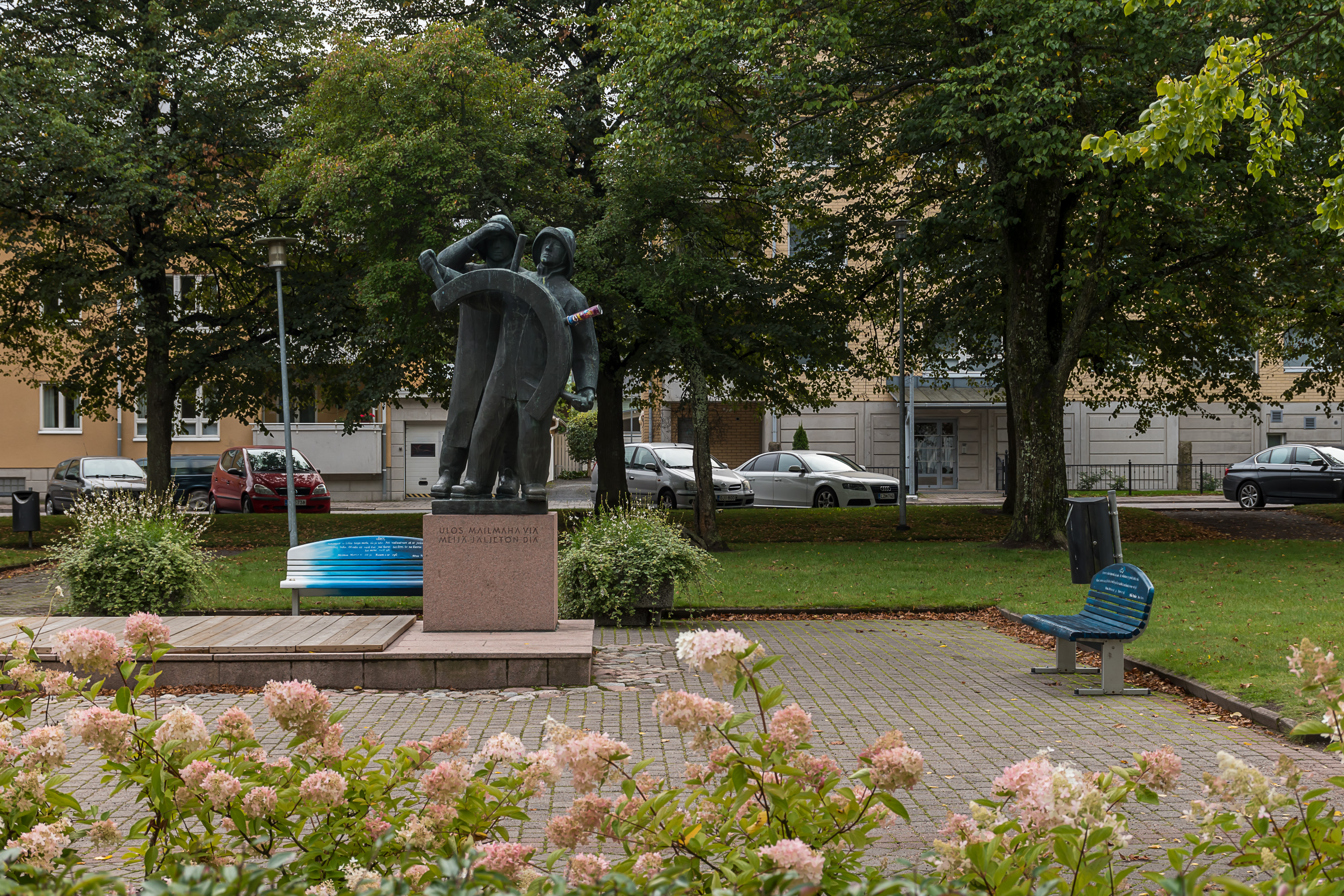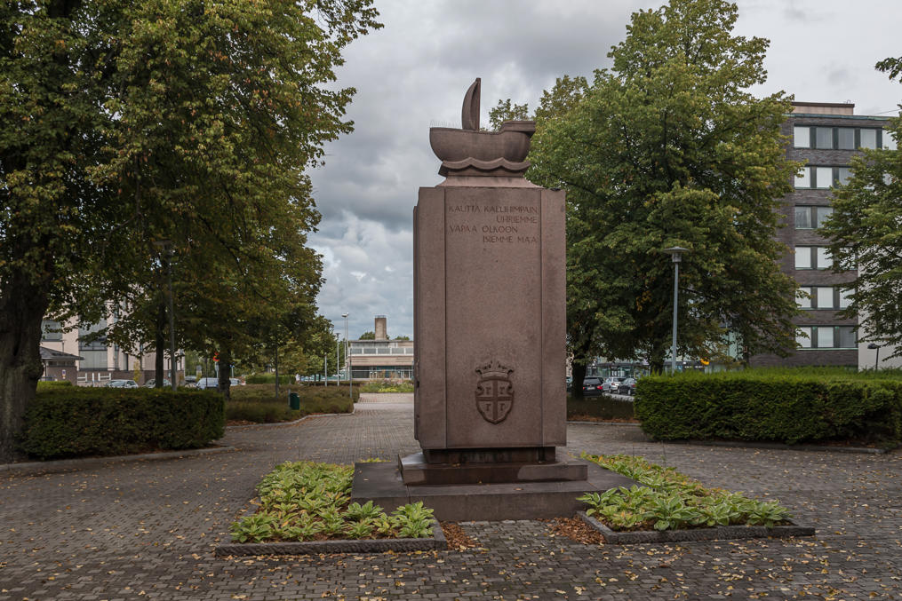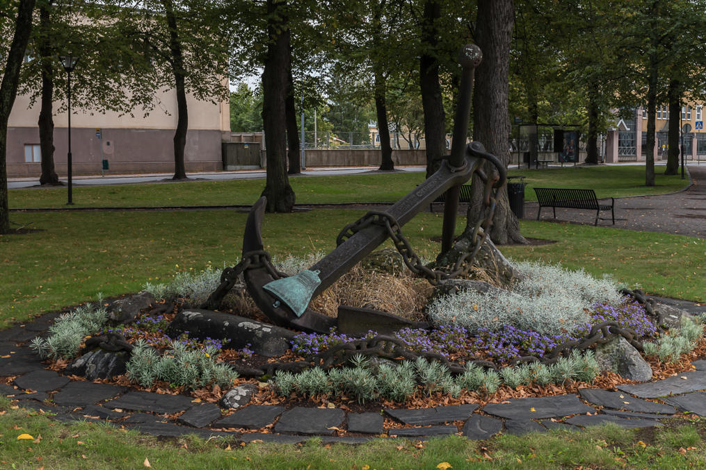 26. Главная улица, Valtakatu. Памятник парусной эпохе со словами песни моряков авторства уже упоминавшегося Нортамо, опять на раумском говоре ("В мир нас ведет дорога без следов").