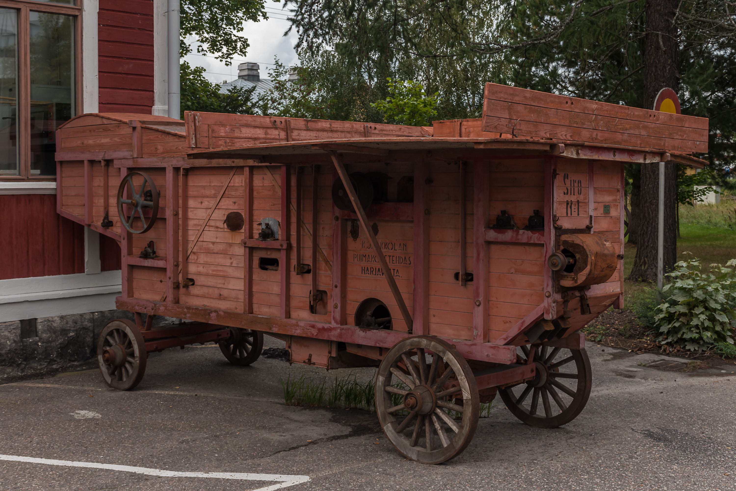 42. И, зачем-то, старенькая молотилка с завода Харьявалты. Вики говорит, что окончательно такие молотилки были заменены комбайнами только к 1980-м, но почему она у станции припаркована — сказать сложно.