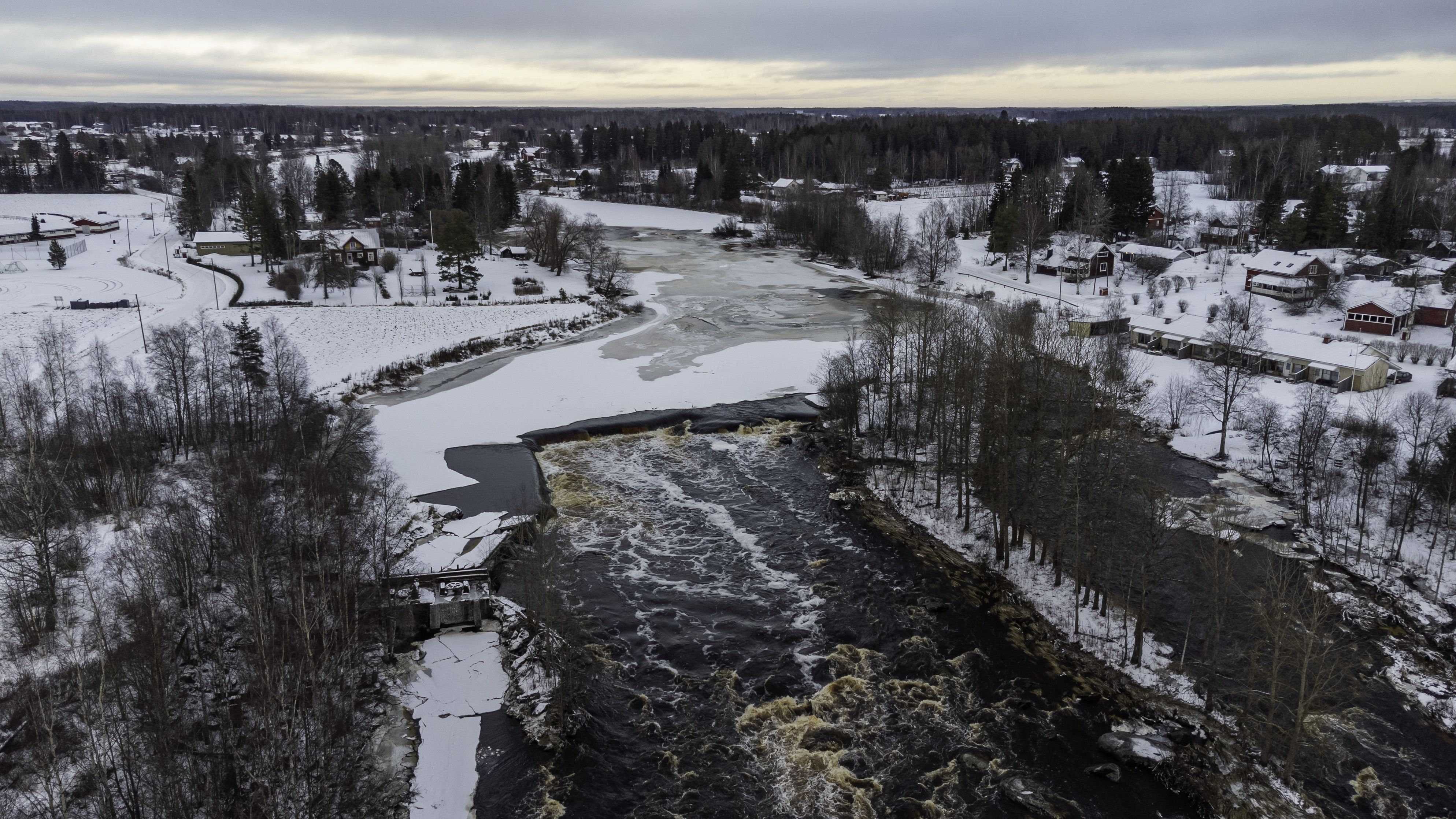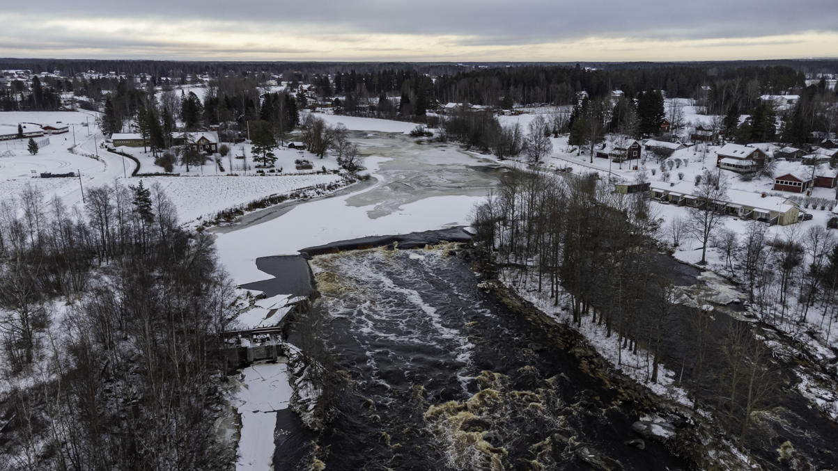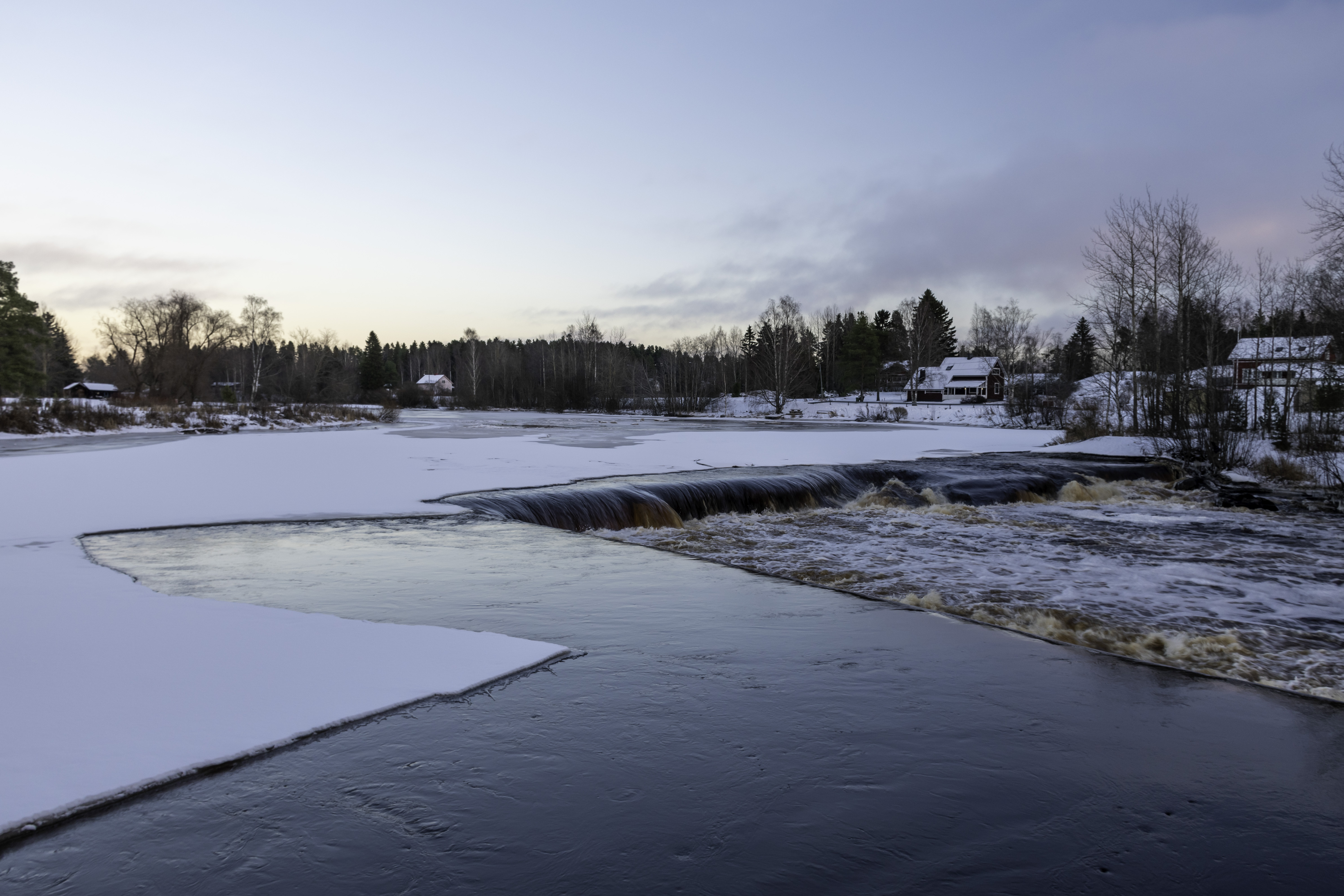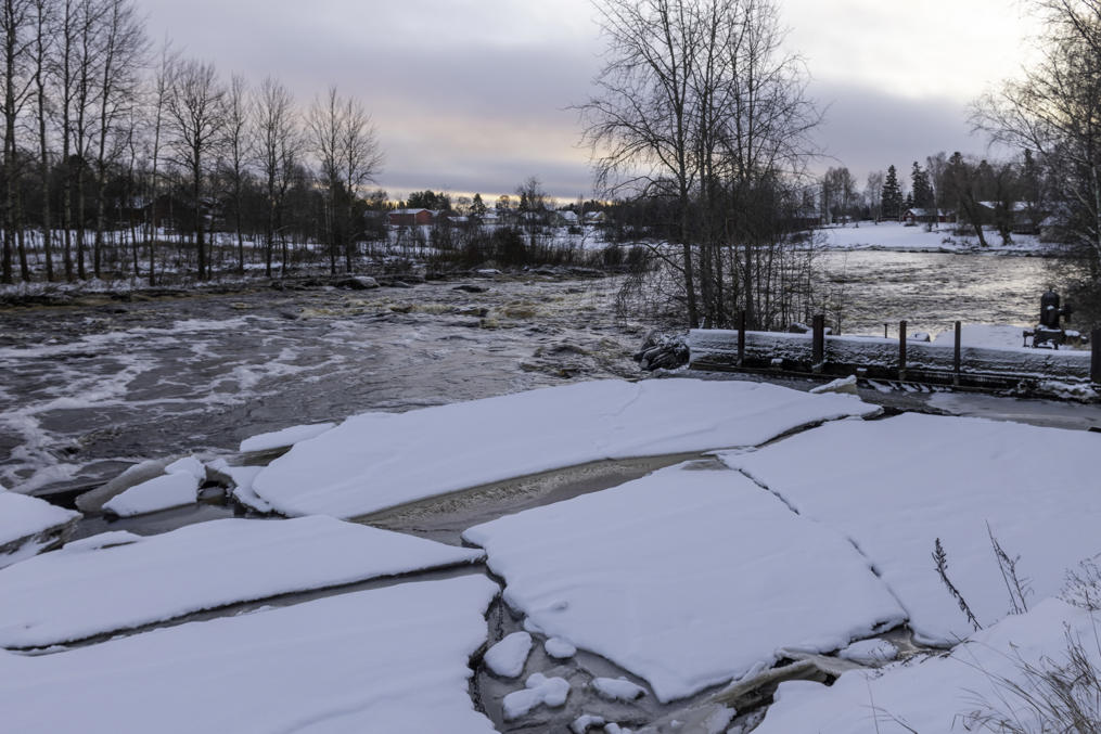 16. Деревня Кюлянпяя (Kylänpää, фин. Конец деревни), до которой я дошел. Тут тоже пороги, Кюлянпяянкоски (Kylänpäänkoski). Несмотря на сильную оттепель в январе, большая часть Кюрёнйоки все-таки осталась под ровным льдом, в отличие от некоторых других местных рек.