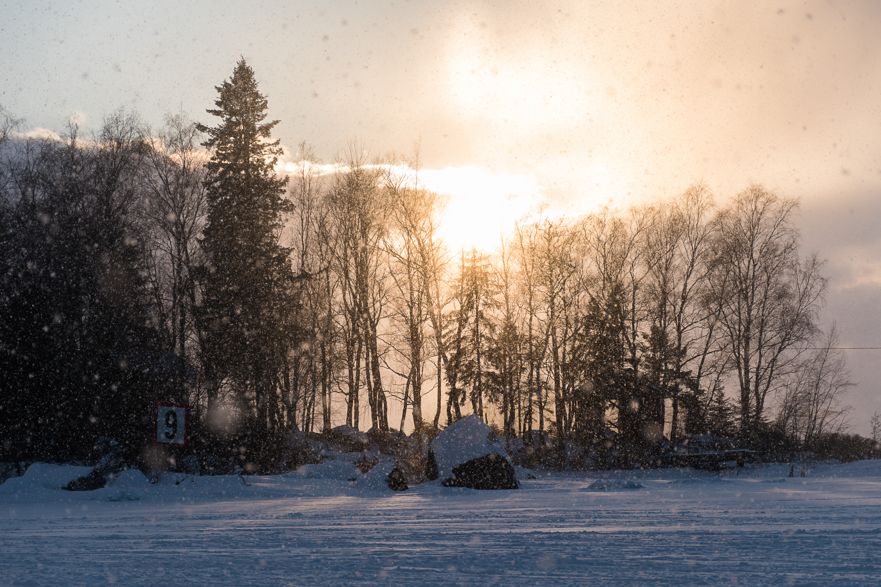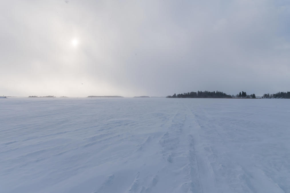 Дорога идет не кратчайшим путем, а наиболее безопасным. В узких проливах между островами может быть сильное течение и непрочный лед, например, в коварной Сосисочной дыре — так и называется пролив, Korvhålet. Как видно из фото, погодные условия могут быстро меняться.