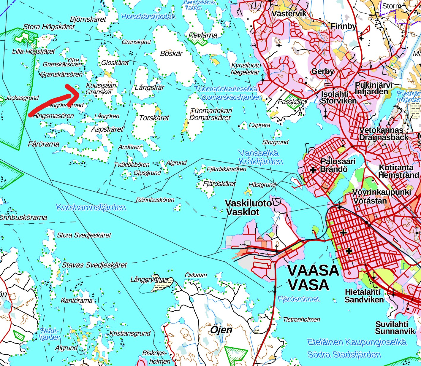 Ваасанский архипелаг (Vaasan saaristo) находится чуть к северо-западу от города Вааса, у пригородных районов Йербю и Вестервик (Gerby, Västervik). Застроен он исключительно дачами. В зимнее время года здесь по морю можно не только гулять, но даже и ездить на машине.