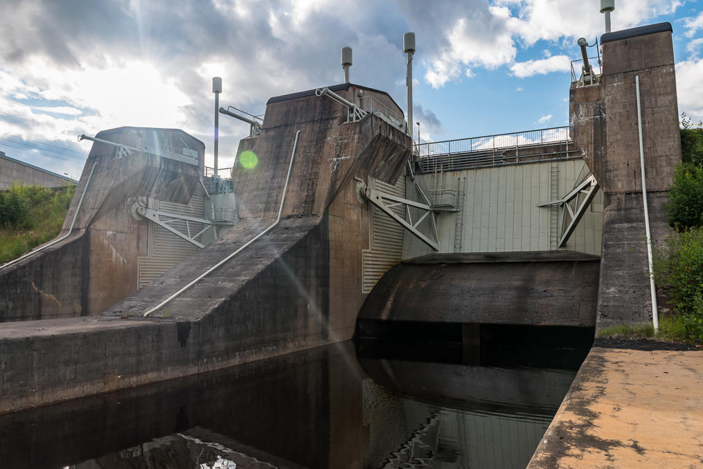 Желоб для лесосплава (производился до 1992), старое русло с плотиной водосброса, старая турбина.