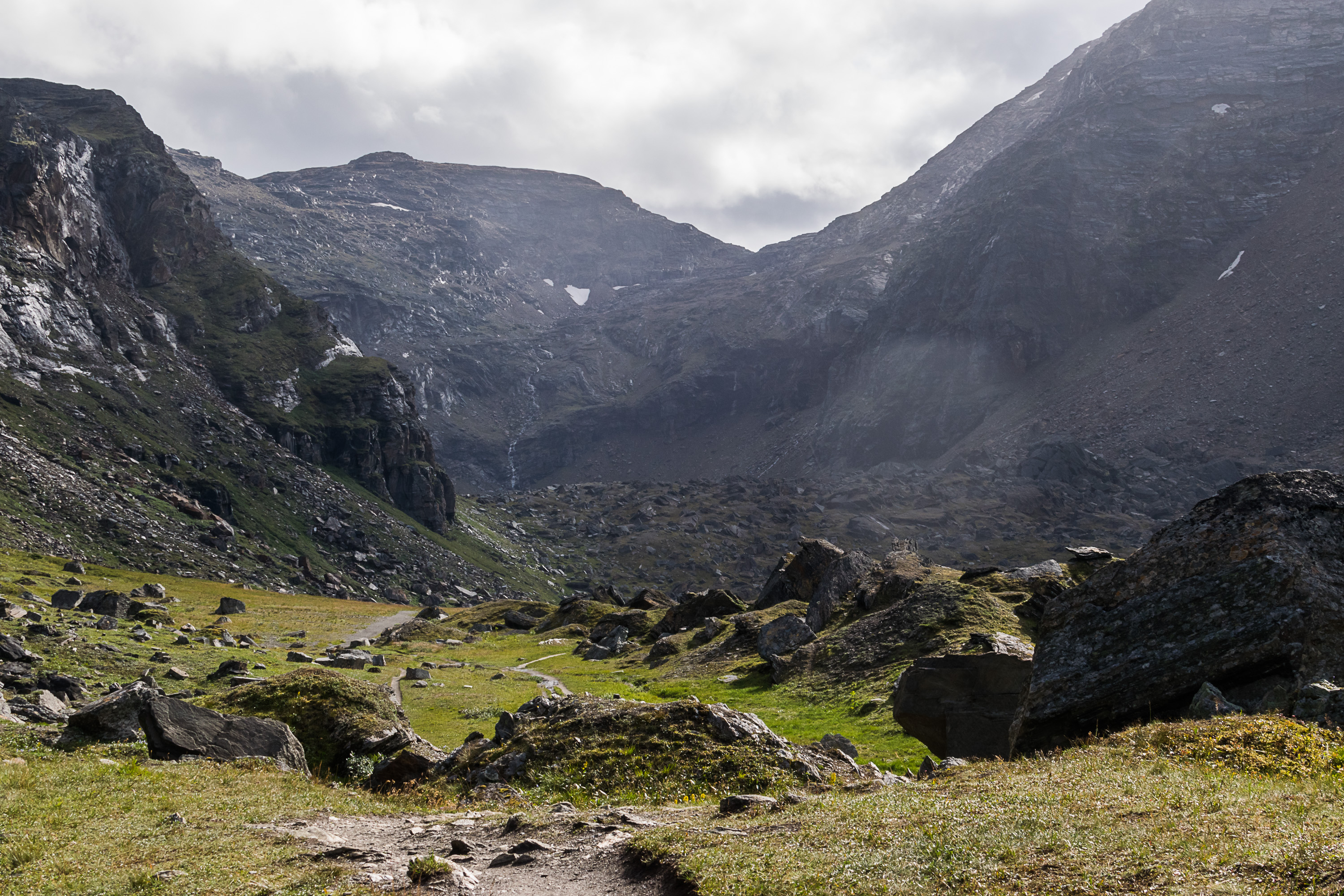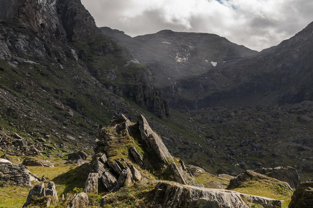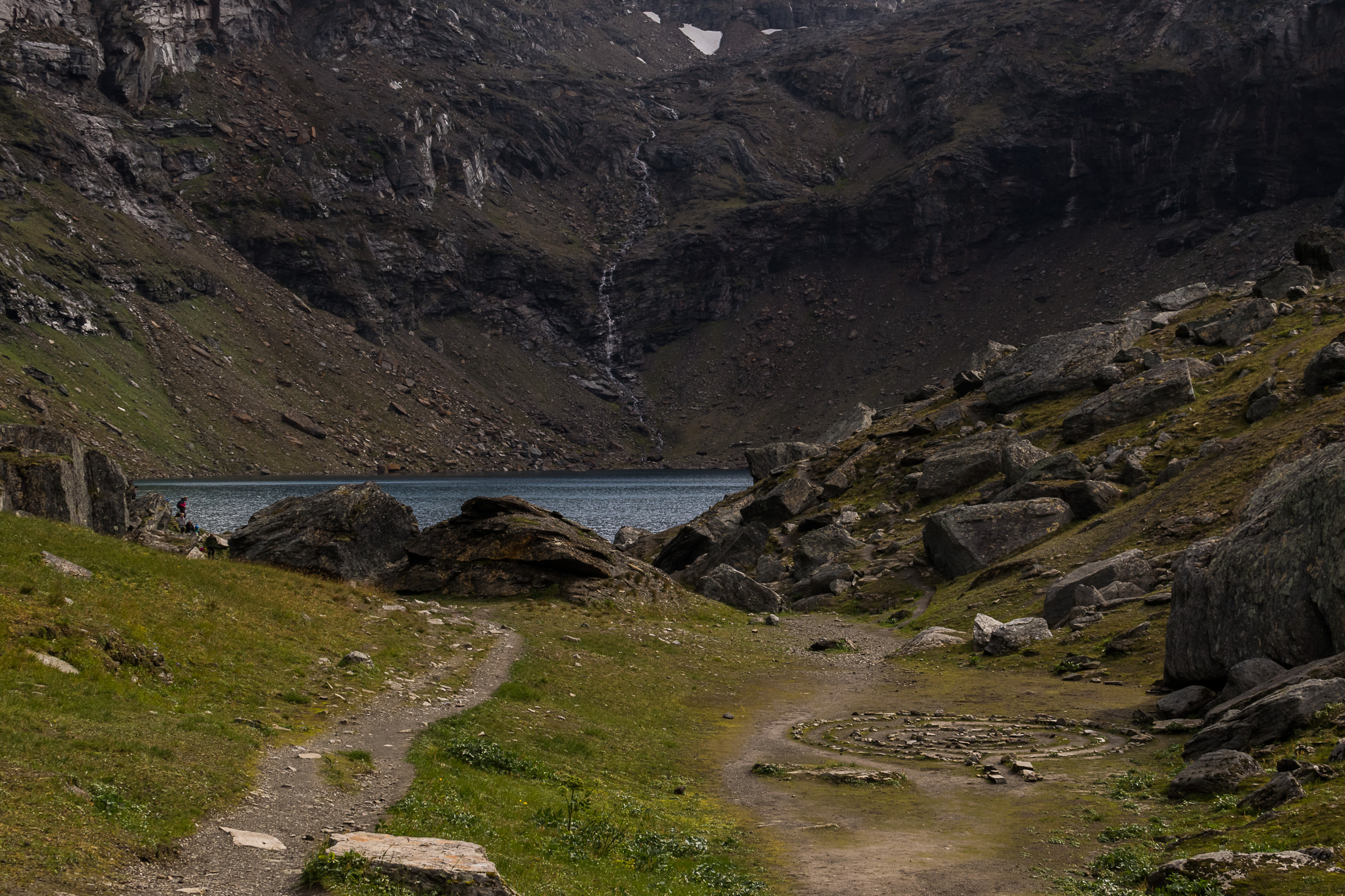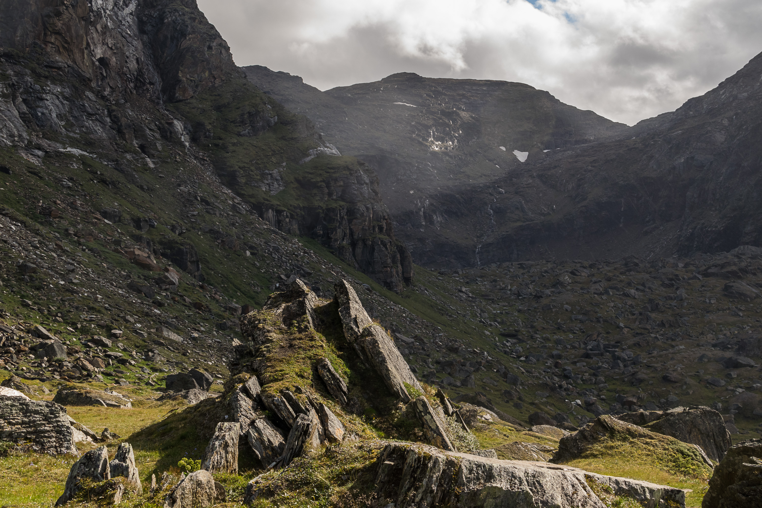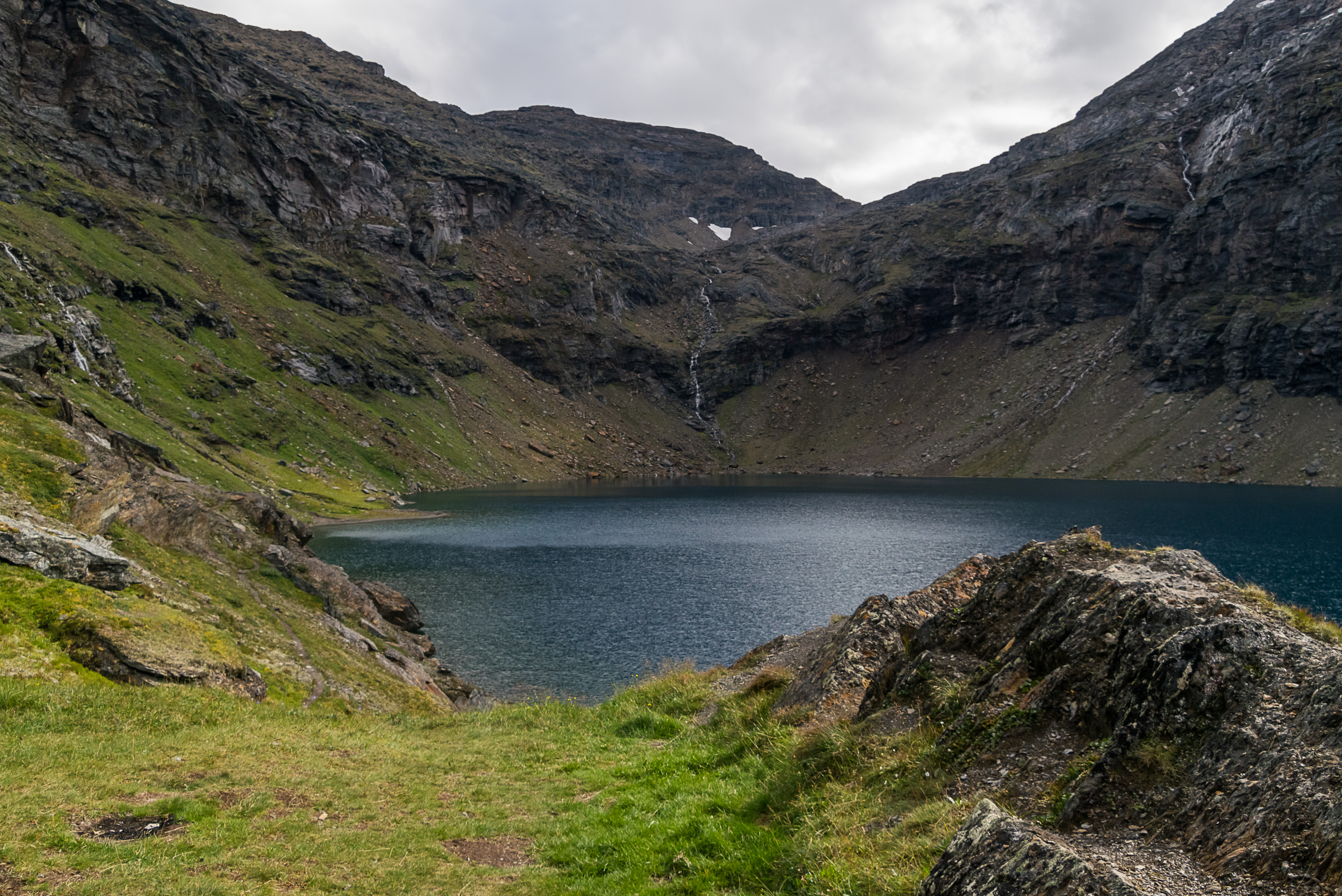 Долина упирается в почти отвесные стены гор высотой более 1500 м, на одной из которых есть ледник; он, впрочем, вроде бы не виден снизу, только мелкие снежники. С гор в озеро бегут небольшие водопадики.