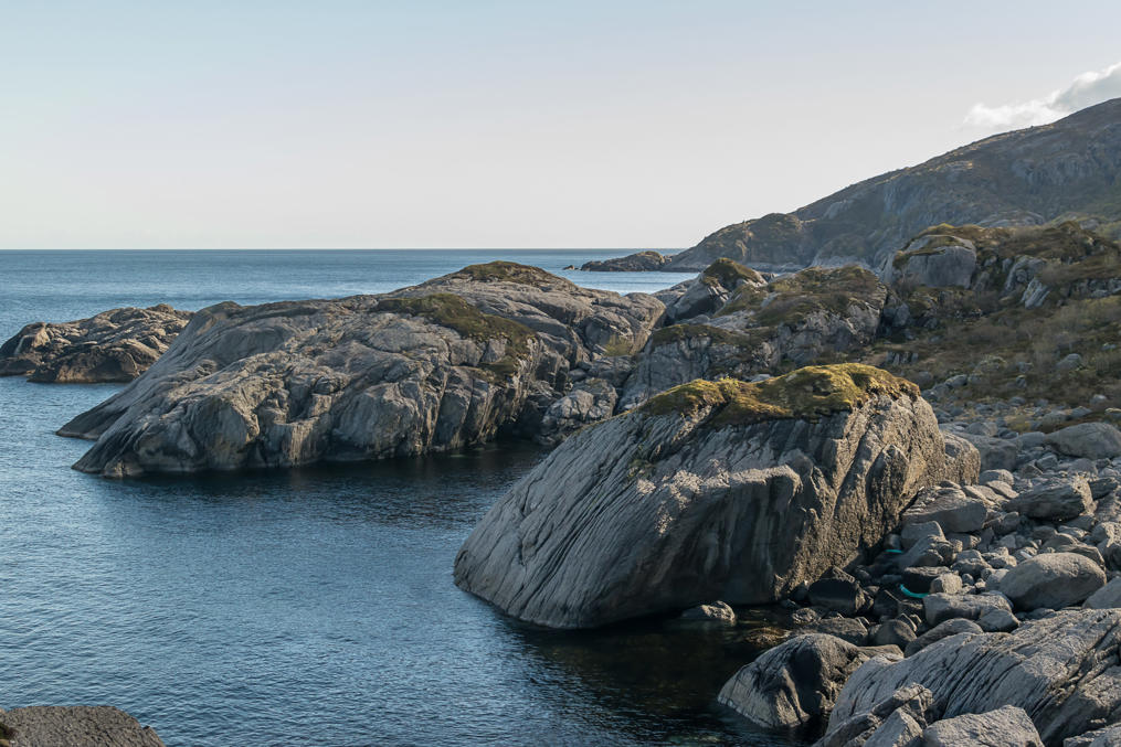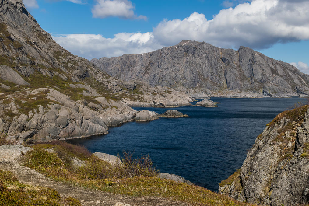 Именно эта тропа (3.5 км в одну сторону) идет не в горы, а вдоль берега моря, но все равно непростая — все равно есть участки по крутым склонам. Зато по ней можно прийти в Нусфьорд, одну из старых рыбацких деревень, которая тоже сейчас по-моему существует больше для туристов. Рекомендуют обычно идти имено из Несланна в Нусфьорд, в Нусфьорд потому что платный въезд. Но возвращаться в любом случае тем же ходом придется.