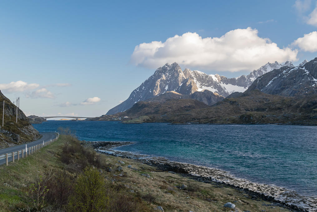 С другой, тут даже по норвежским меркам нереально красиво. Лофотены — протянувшаяся где-то на 200 км цепочка постепенно уменьшающихся островов, в основном занятых не самыми высокими (чуть за километр максимум), но очень острыми и живописными горами, разделенных мелкими фьордиками.