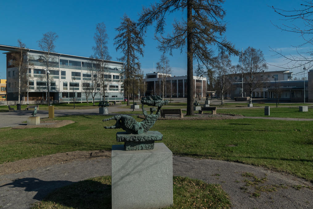 42. Скульптура в фонтане, который я оба раза не застал действующим, называется "Защитник" (Puolustaja) и имеет интересную историю. Она посвящена борьбе с русификацией Финляндии в начале 20 века — если присмотреться, мужчина не просто на коленях, а поднимает камень. Автор скульптуры, Йоханнес Хаапасало (Johannes Haapasalo, 1880-1965), сам был активистом и в 1903 был вынужден бежать за границу по поддельному паспорту. Эту скульптуру он изваял в 1908 году. В 1909 Хаапасало смог вернуться в Финляндию, но скульптура оставалась за границей еще очень долго, хоть и участвовала там даже в какой-то выставке в Брюсселе — видимо, в Финляндии была бы слишком провокационной даже в эпоху оттепели. На время Первой мировой ее спрятали, закопали в лесу, надежно, ничего с ней не случилось. Но лишь в 1932 году, благодаря спонсорству фабриканта из Раахе Йона Грундстрёма, удалось вернуть ее в Финляндию, и Грундстрём подарил ее городу. Хаапасало с тех пор изваял еще много умеренно известных памятников и скульптур, более всего в его родном Миккели.