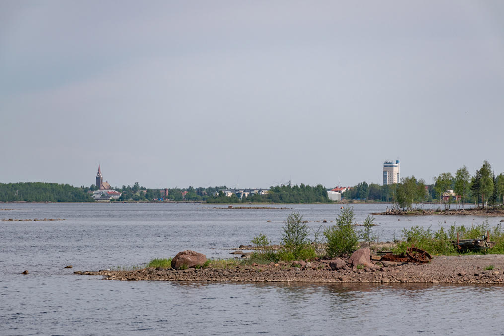 46. Раахе прикрывают от моря полуостров Питкякари и острова Маа- и Улко-Фантти (Pitkäkari, Maa-, Ulko-Fantti). Они заняты в основном дачами и леском. Вид с берега Питкякари, от городского пляжа, на центр города.