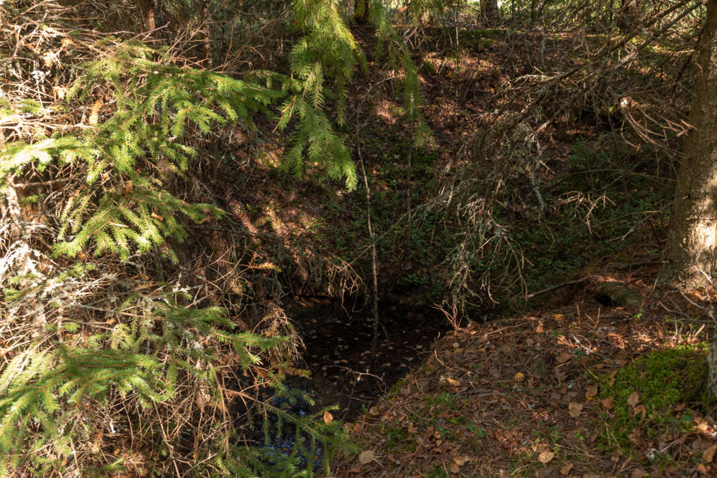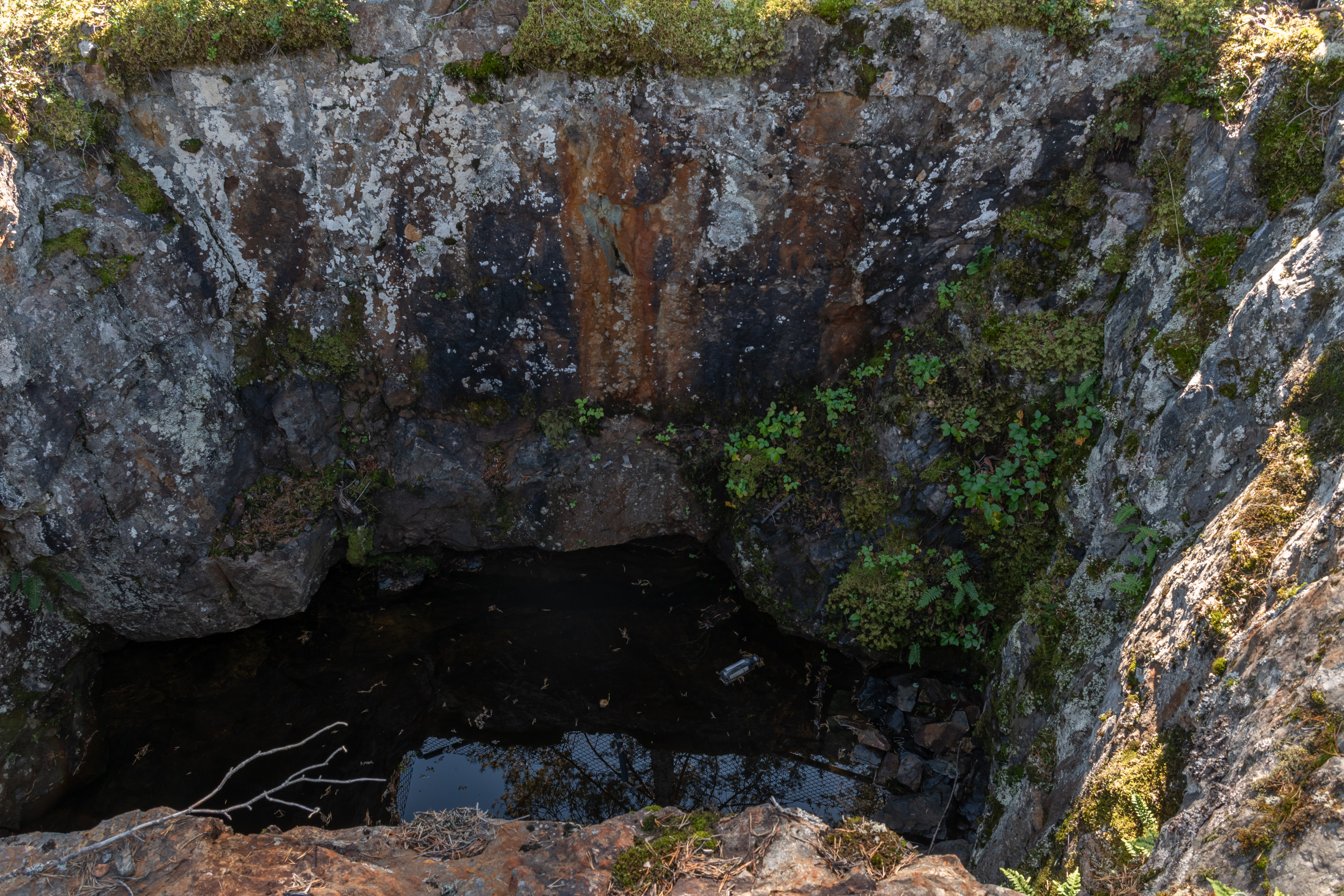 5. Первая пара родников предположительно самые новые, 19 века, где уже использовался динамит. Выглядят как большие затопленные ямы — из них воду не откачали. В одном из них вроде как тоже есть родонитовая жила, но сверху мне заметить не удалось.