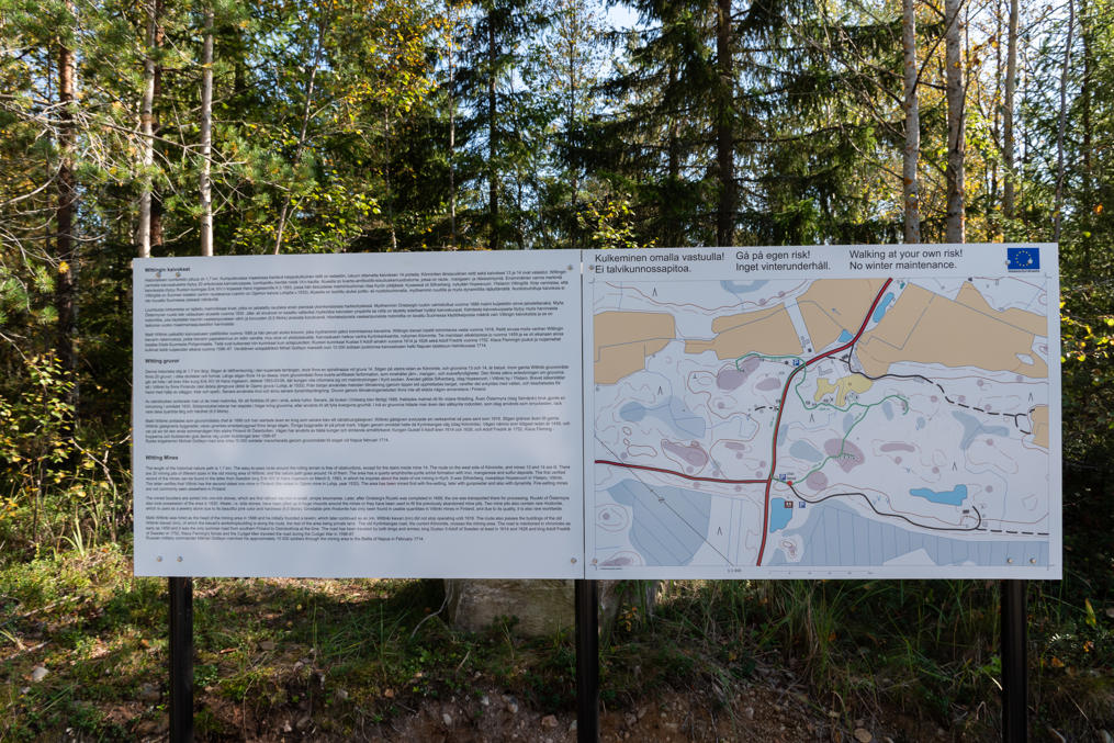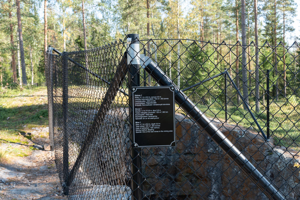 6. Все рудники приличных размеров обнесены заборчиком, и все снабжены информационными табличками на финском, шведском и английском. В целом уровень обустройства тропы необычно высокий. На тропу потратили 110 тыс. евро, в основном по программе развития сельской местности Континентальной Финляндии (Manner-Suomen maaseudun kehittämisohjelma 2014–2020, финансирование государства и ЕС), но также включая 17 тыс. от города Сейняйоки и труд добровольцев, в денежном эквиваленте исчисляемый в 28 тыс. Проект осуществлялся лет пять, видимо, включая все бюрократические этапы — небыстрое дело.