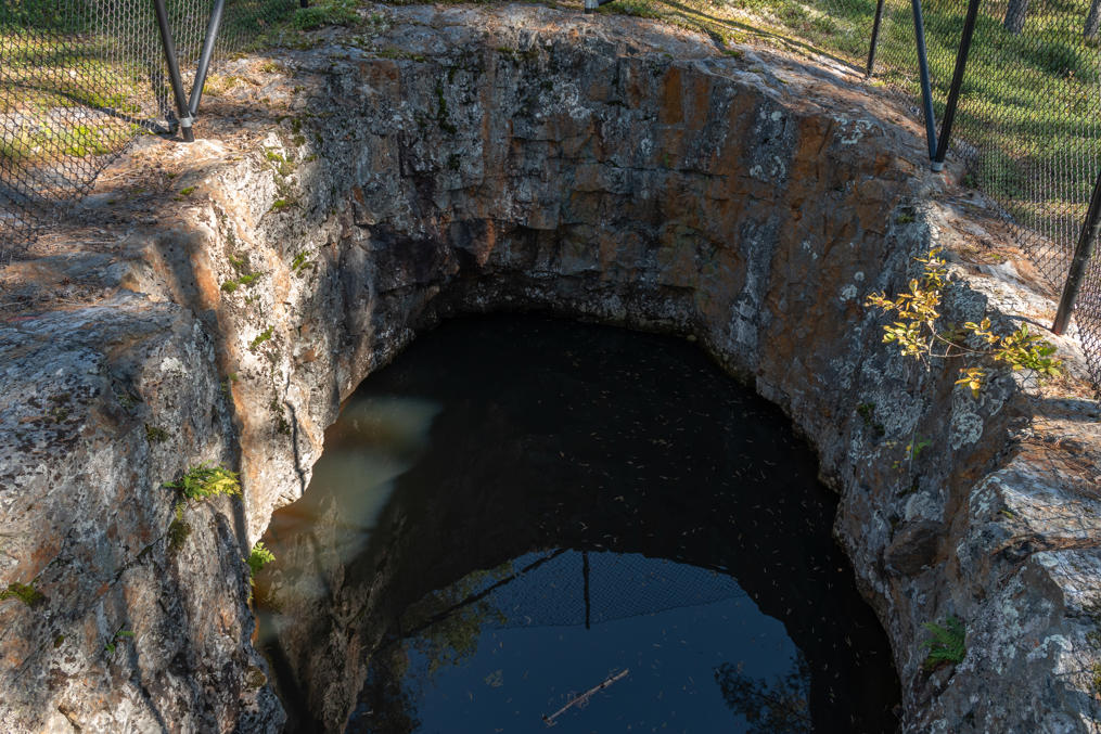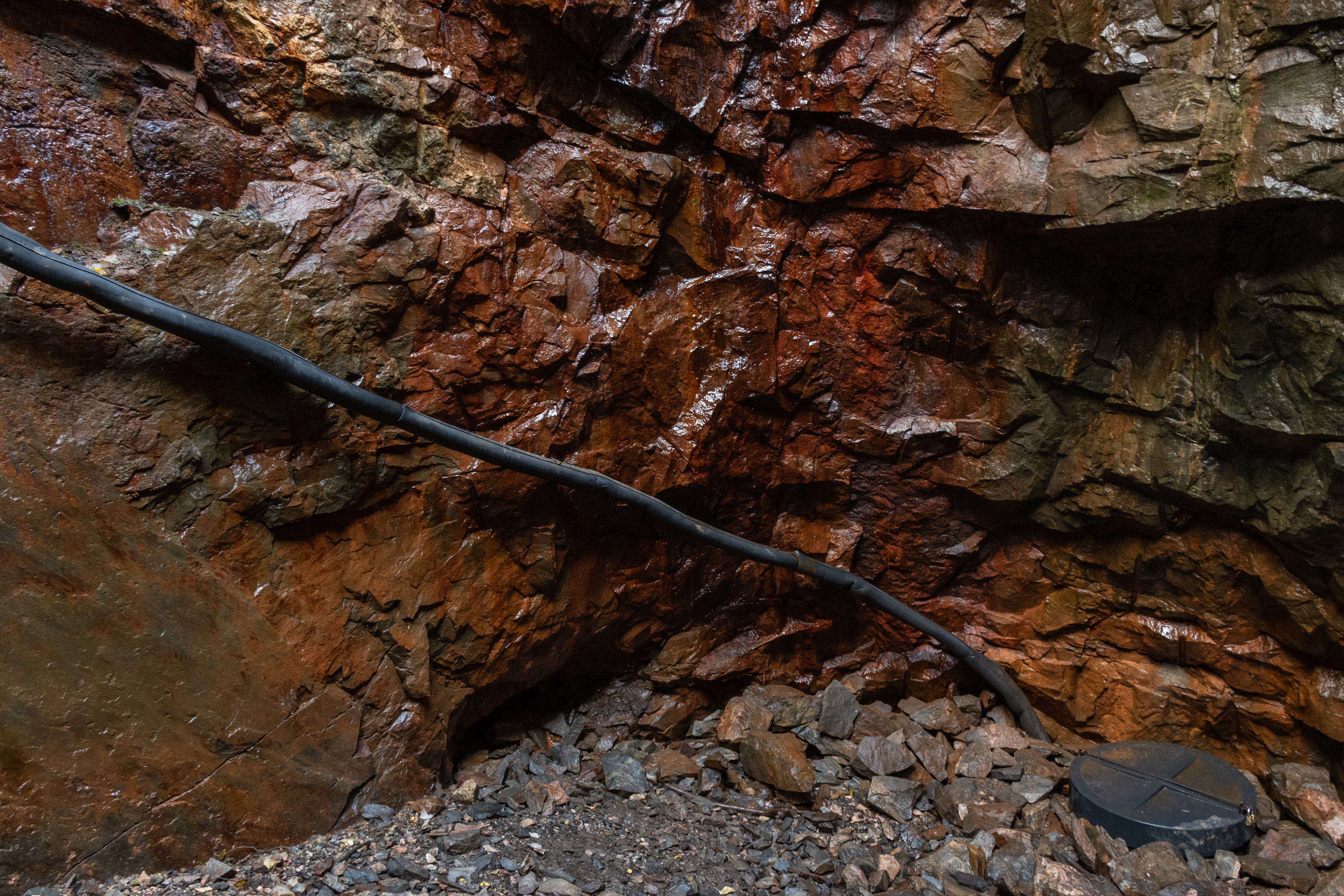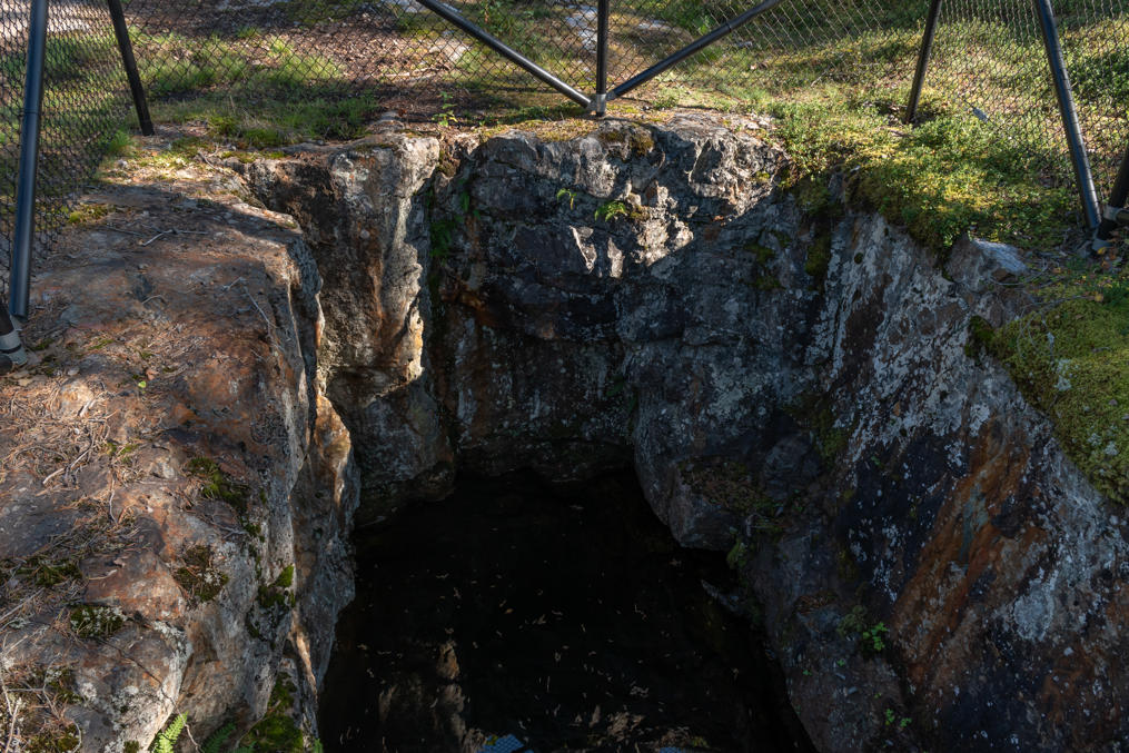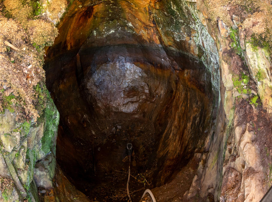 14. Этот рудник представляет собой округлую полость в 4.5 м диаметром, прикрытую навесом. Вода изнутри откачана — тут насос работает — виден ее старый уровень. Довольно необычного облика место. В этом и следующем руднике тоже проведено освещение внутрь.
