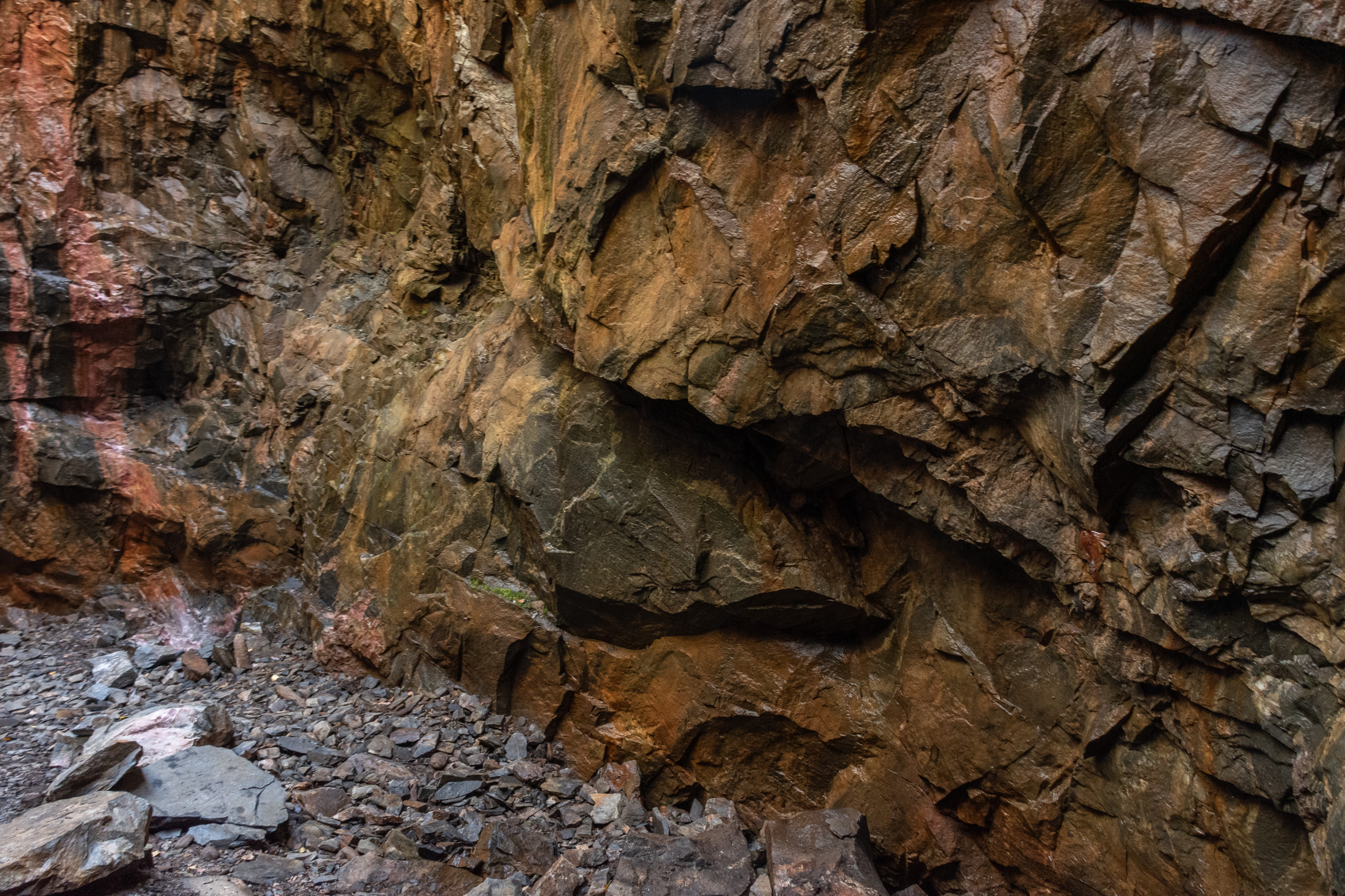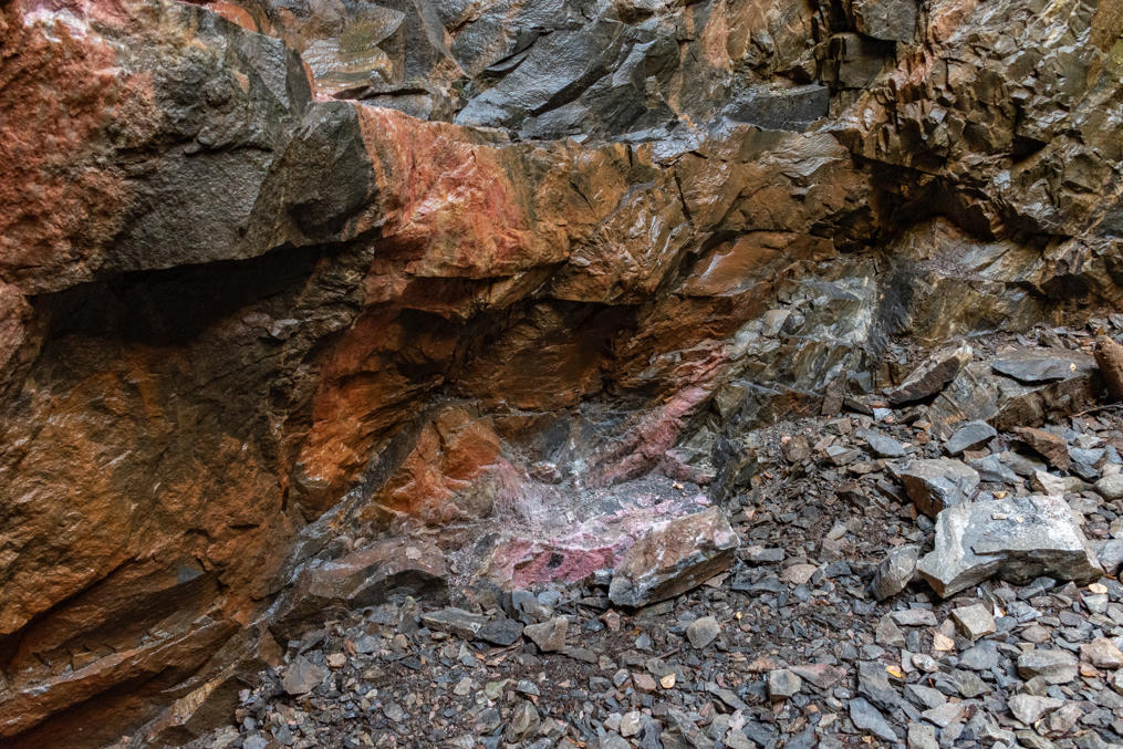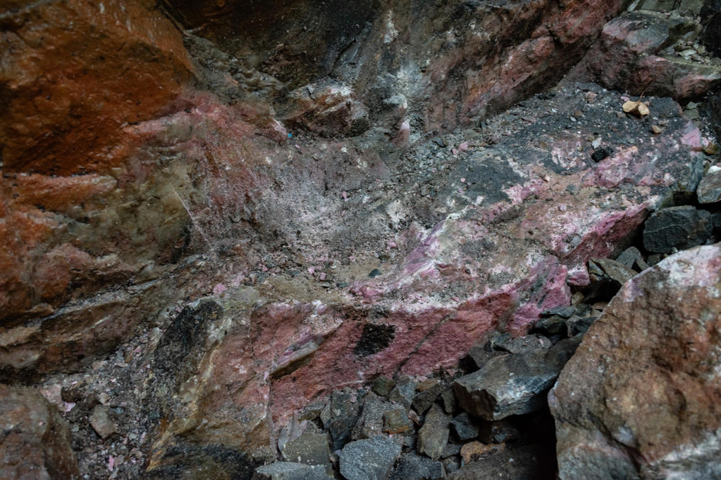 19. И розовым здесь выделяется родонит. Красиво. Не очень понял, откуда добывали родонит местные на поделки до того, как рудник осушили — из другого рудника? И интересно, много ли теперь будет любителей отколоть себе кусочек, никто ж не смотрит :) Хотя родонит довольно твердый камень, не так уж и просто что-то отколоть.