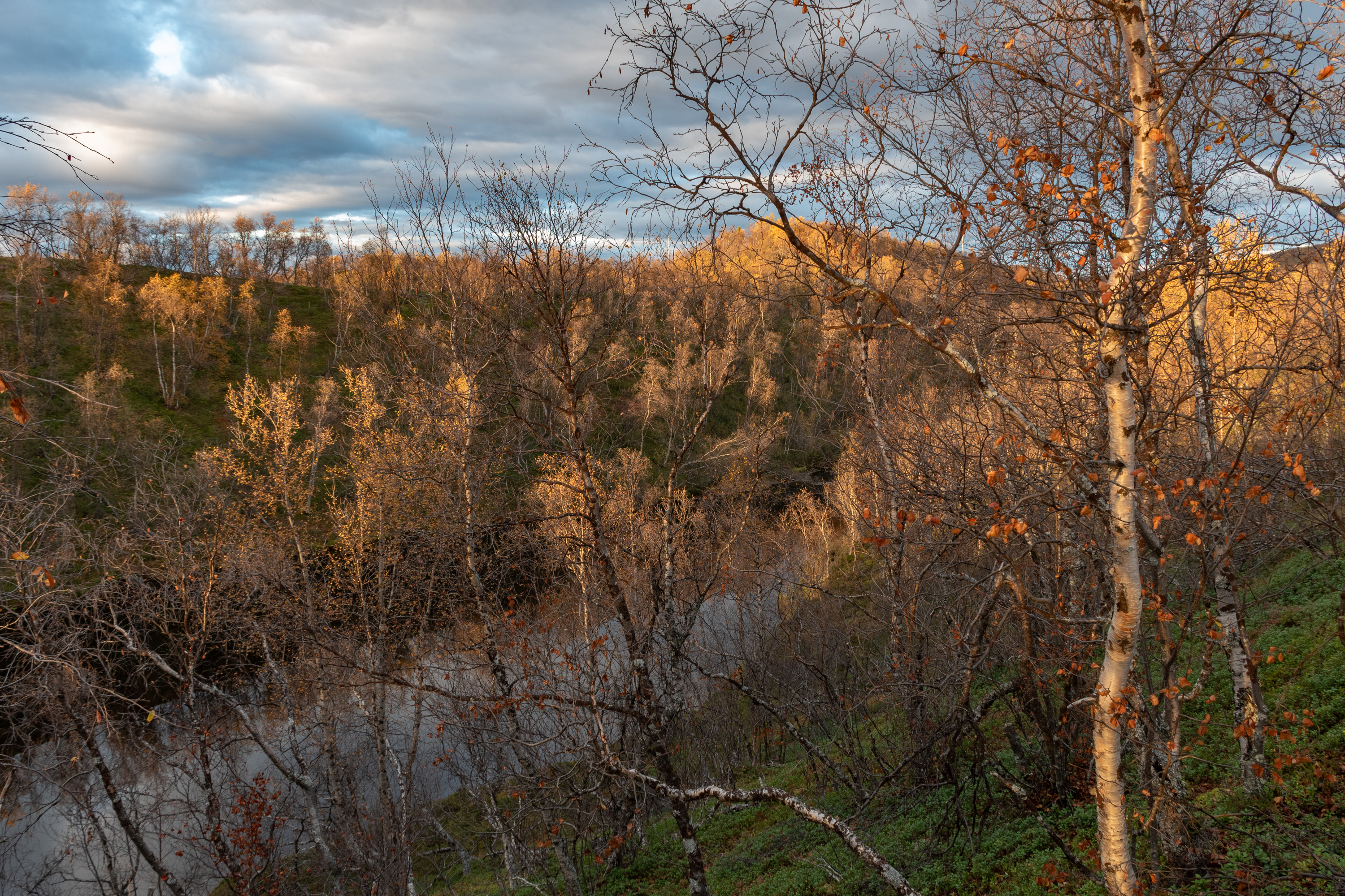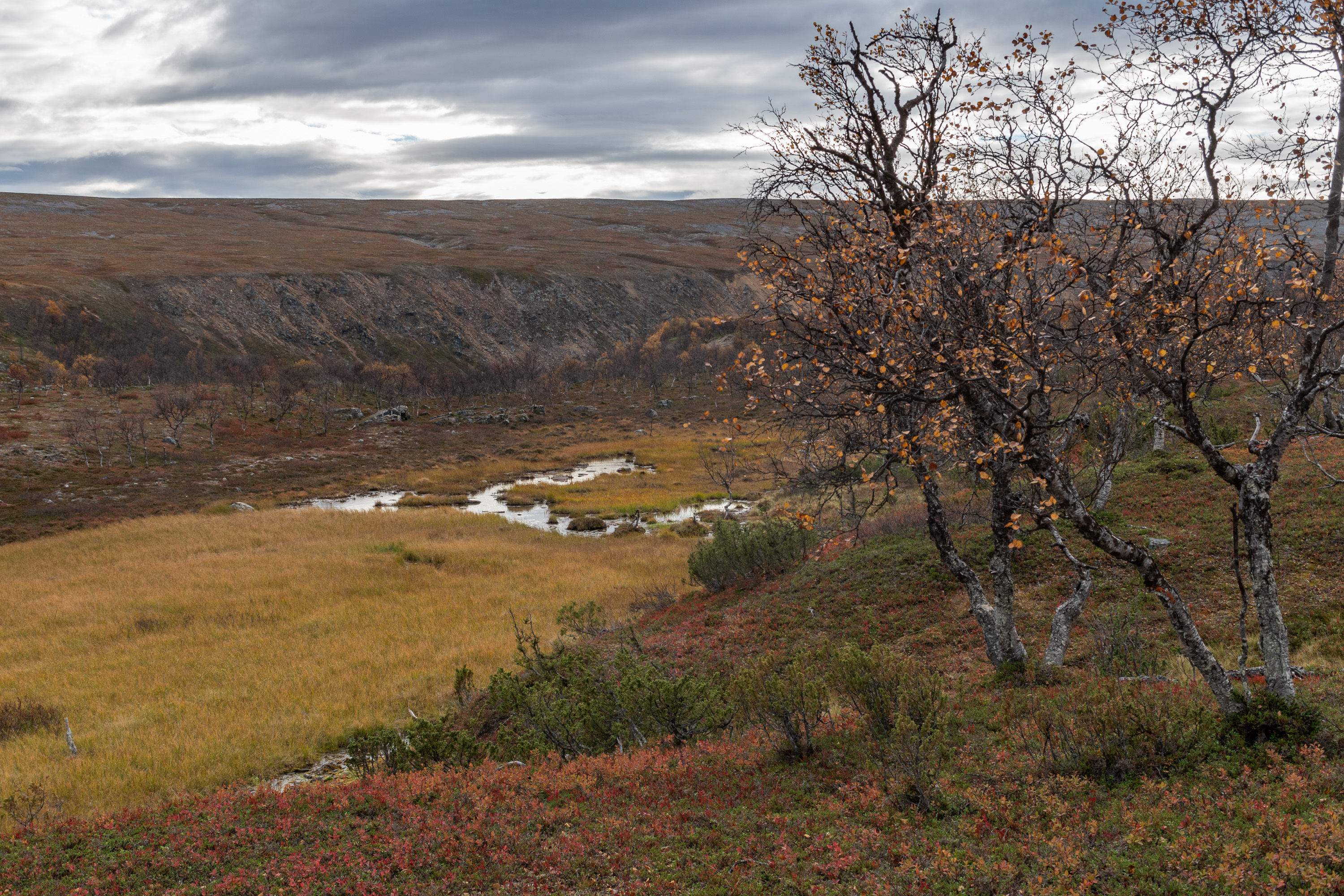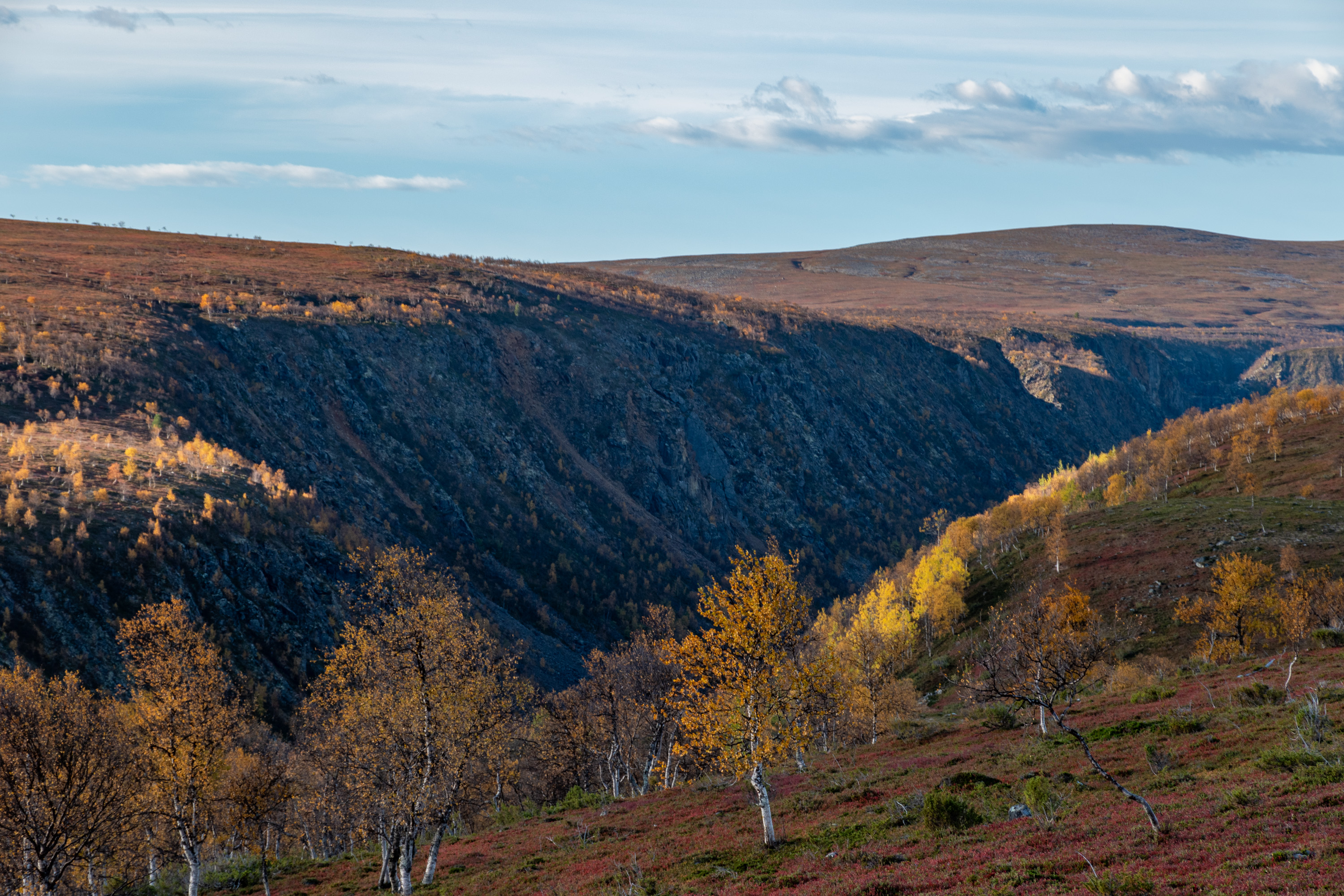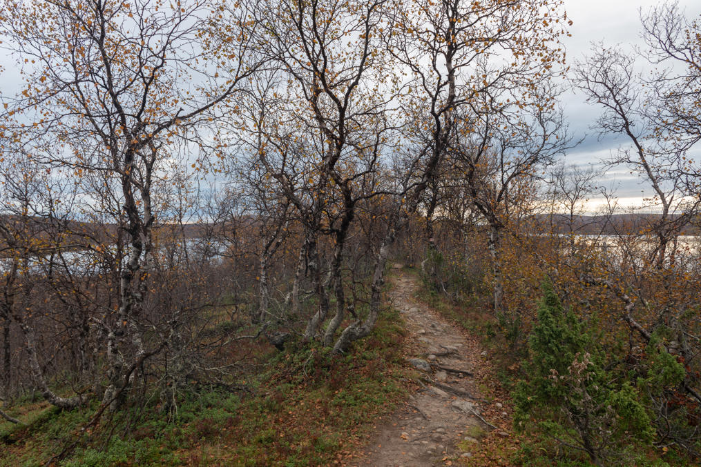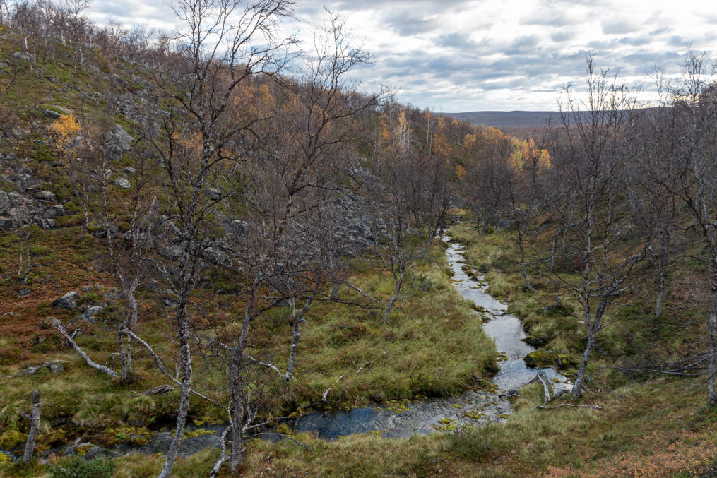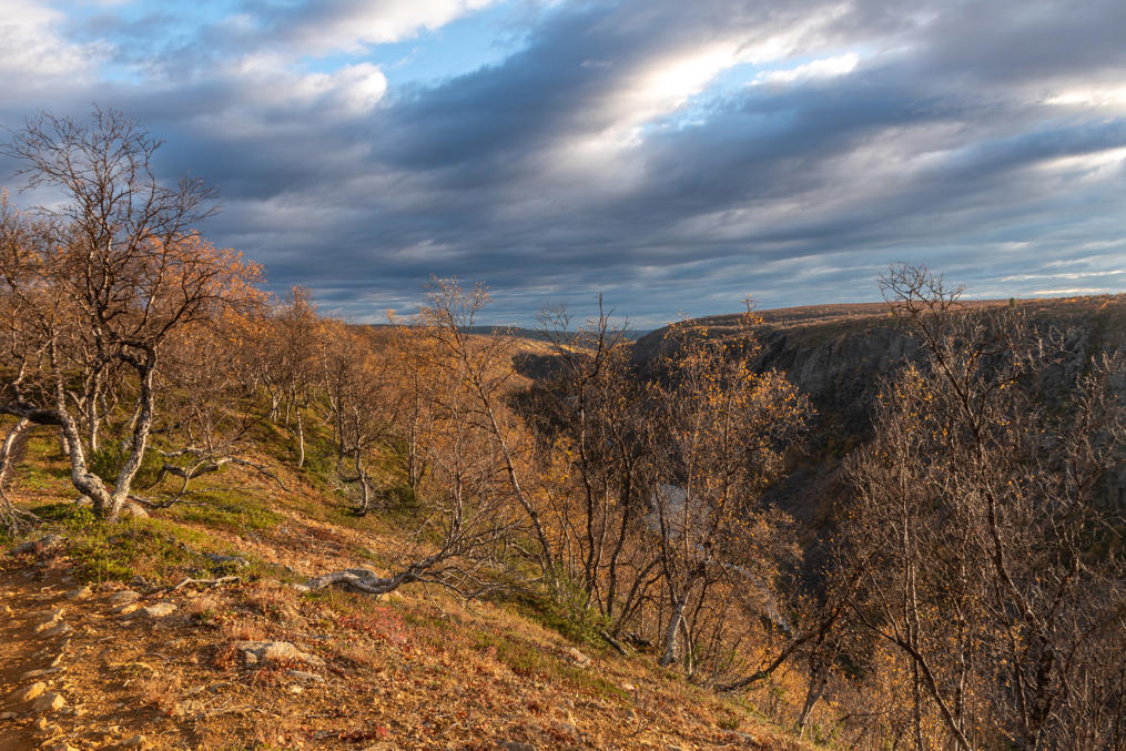 В этих местах, ближе к началу похода, как видно, многие березы уже были почти голыми, хотя уже ближе к середине маршрута на них еще оставались все листья. Не могу сказать, вызвано это тем, что ближе к началу климат суровее (в принципе, высоты тут 300-400 м над уровнем моря, дальше на склонах каньона уже 200-250 м, а на дне каньона менее 150 м), или другими факторами. Заповедник Кево известен тем, что в 1960-х годах в нем 90% березовых лесов было уничтожено мотыльком — ларенцией осенней, по-фински tunturimittari, "тундровый мерщик" — и с тех пор они так и стояли на корню сухие. С тех пор, конечно, много времени прошло и леса успели восстановиться, но в 2008 году еще довольно много, 356 кв. км, сожрал другой похожий мотылек, зимняя пяденица (hallamittari, "морозный мерщик"), который ранее на таких широтах не встречался.