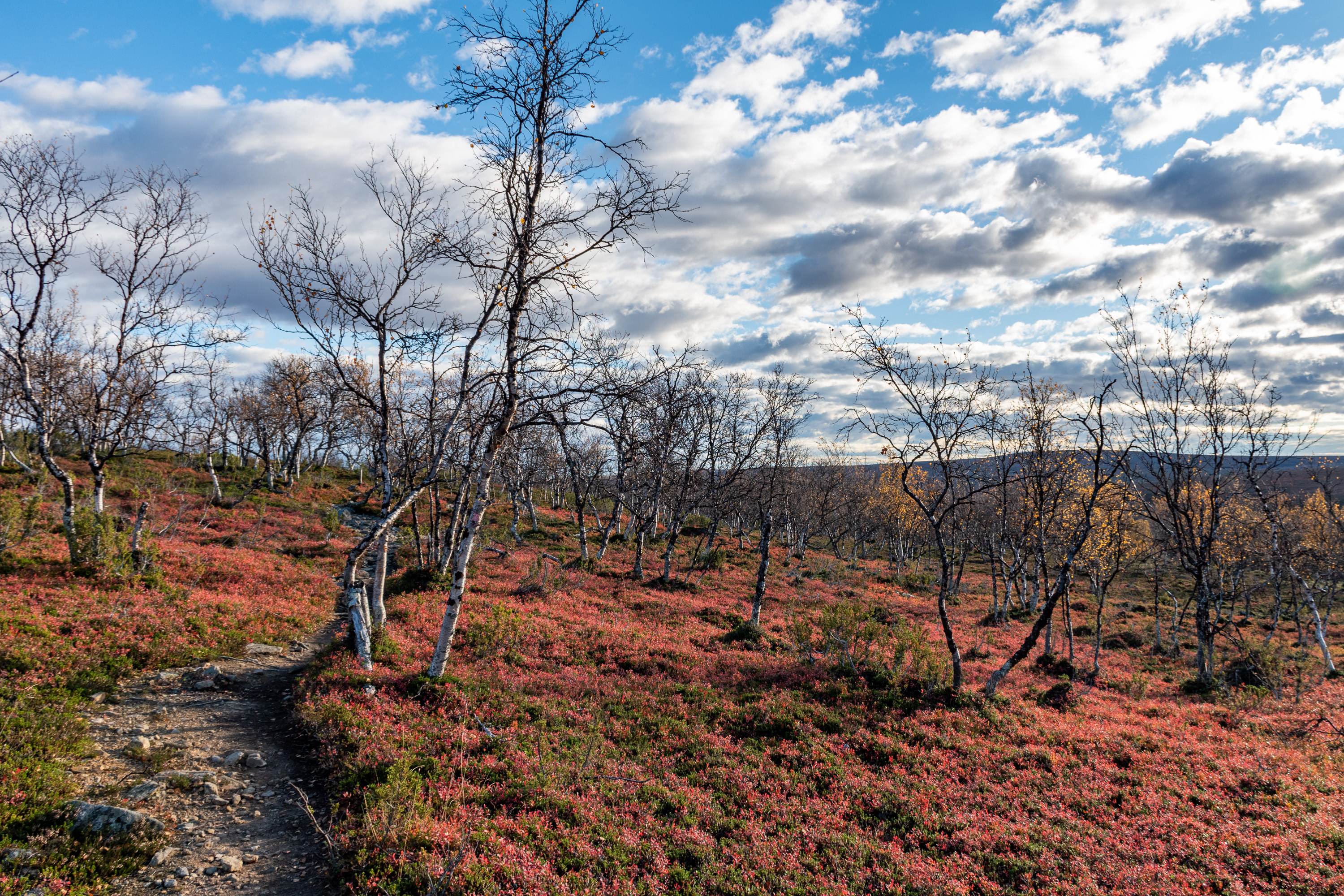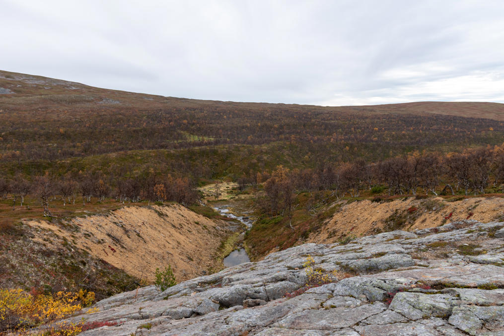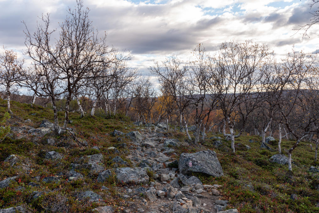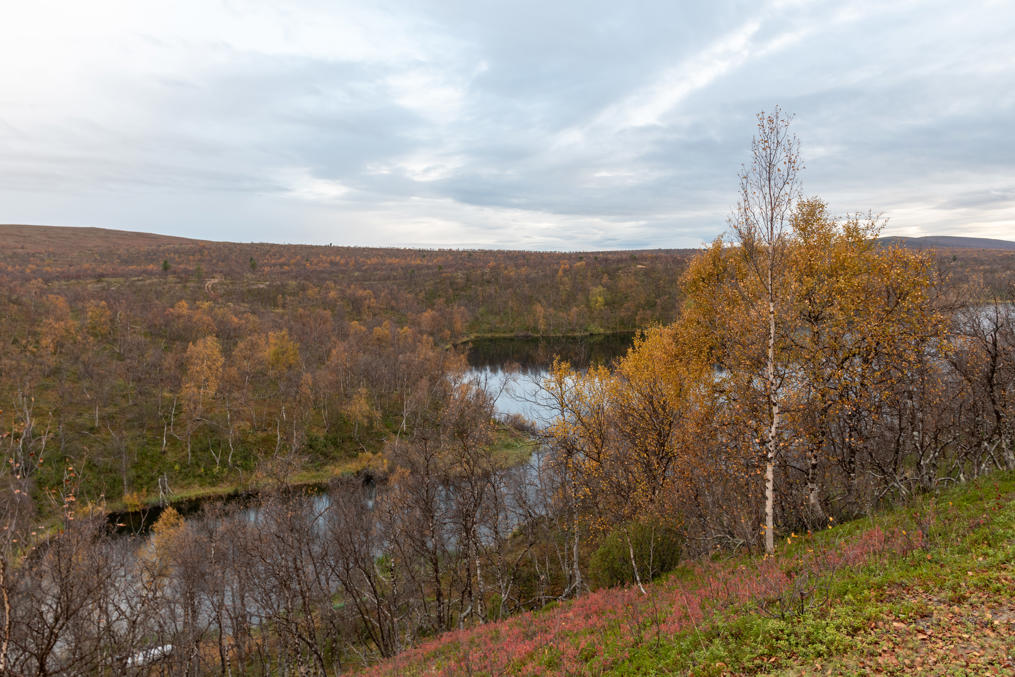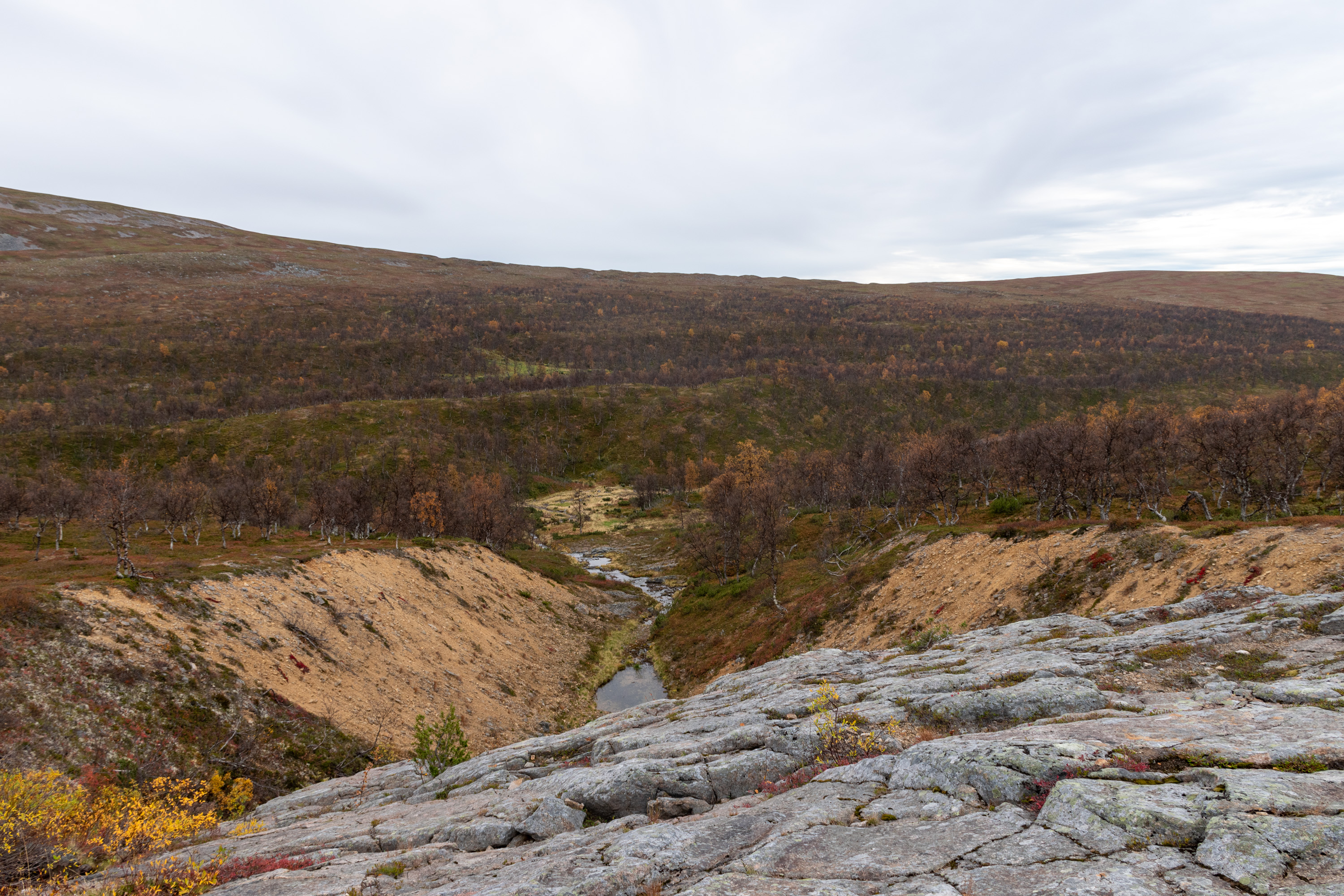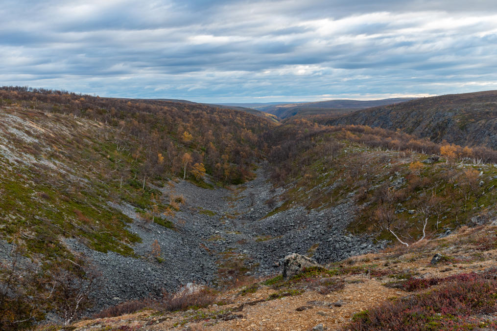 В этих местах, ближе к началу похода, как видно, многие березы уже были почти голыми, хотя уже ближе к середине маршрута на них еще оставались все листья. Не могу сказать, вызвано это тем, что ближе к началу климат суровее (в принципе, высоты тут 300-400 м над уровнем моря, дальше на склонах каньона уже 200-250 м, а на дне каньона менее 150 м), или другими факторами. Заповедник Кево известен тем, что в 1960-х годах в нем 90% березовых лесов было уничтожено мотыльком — ларенцией осенней, по-фински tunturimittari, "тундровый мерщик" — и с тех пор они так и стояли на корню сухие. С тех пор, конечно, много времени прошло и леса успели восстановиться, но в 2008 году еще довольно много, 356 кв. км, сожрал другой похожий мотылек, зимняя пяденица (hallamittari, "морозный мерщик"), который ранее на таких широтах не встречался.