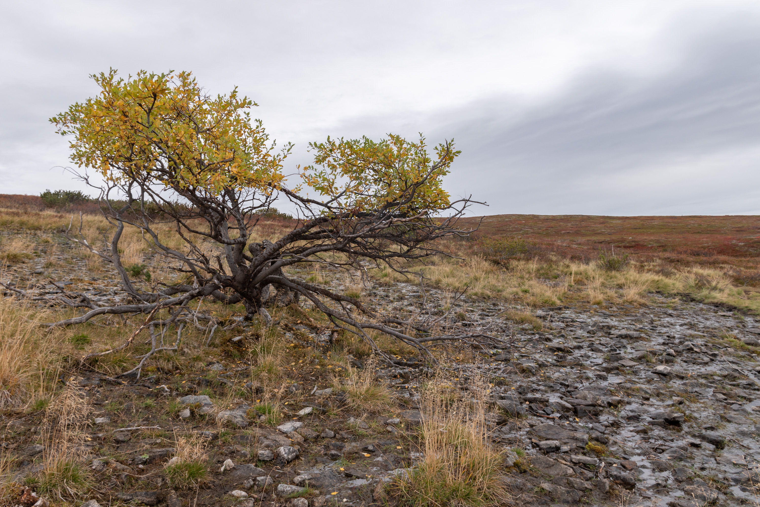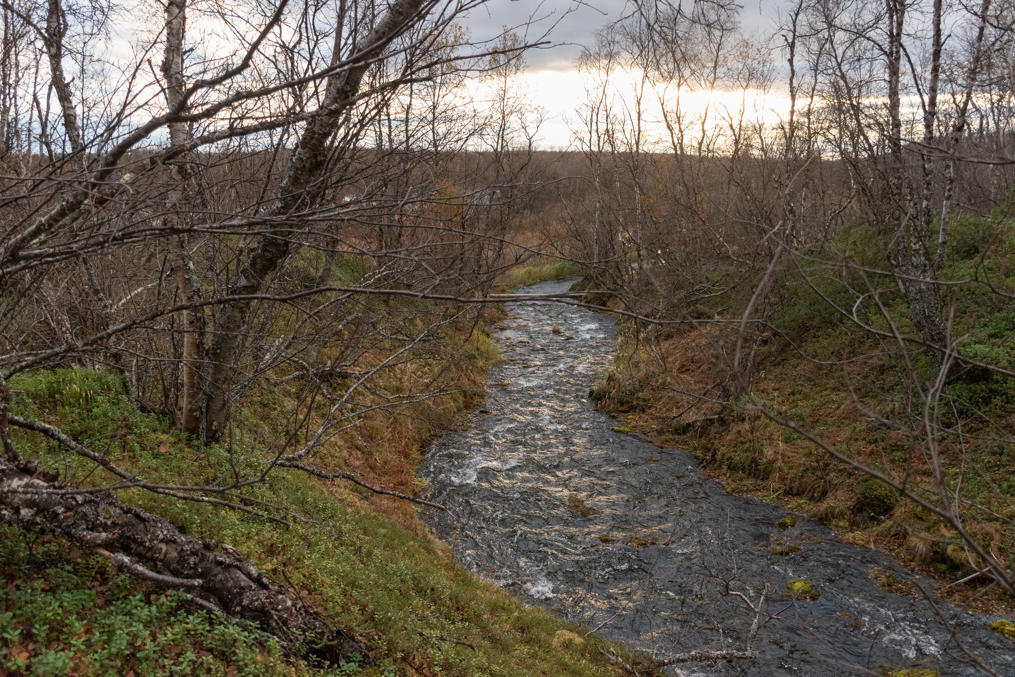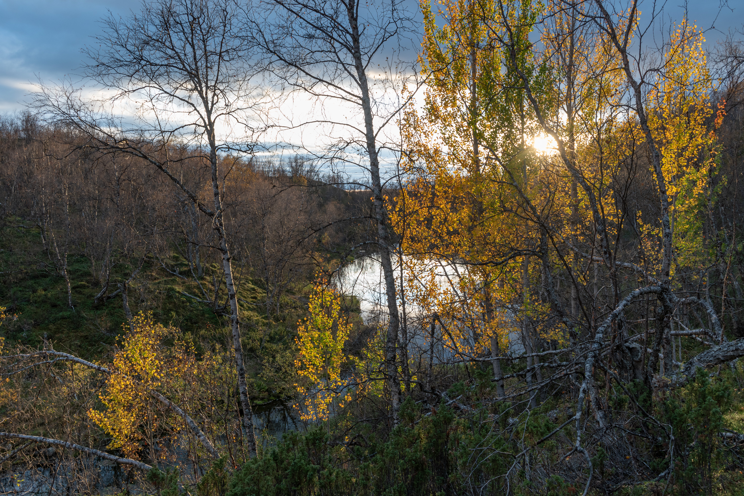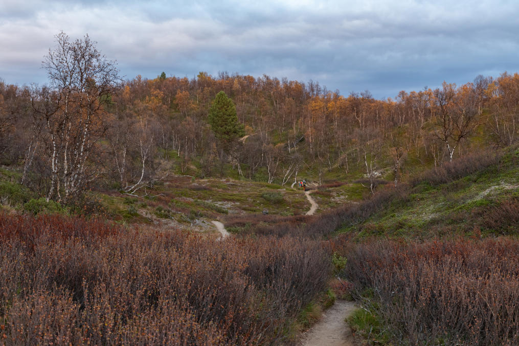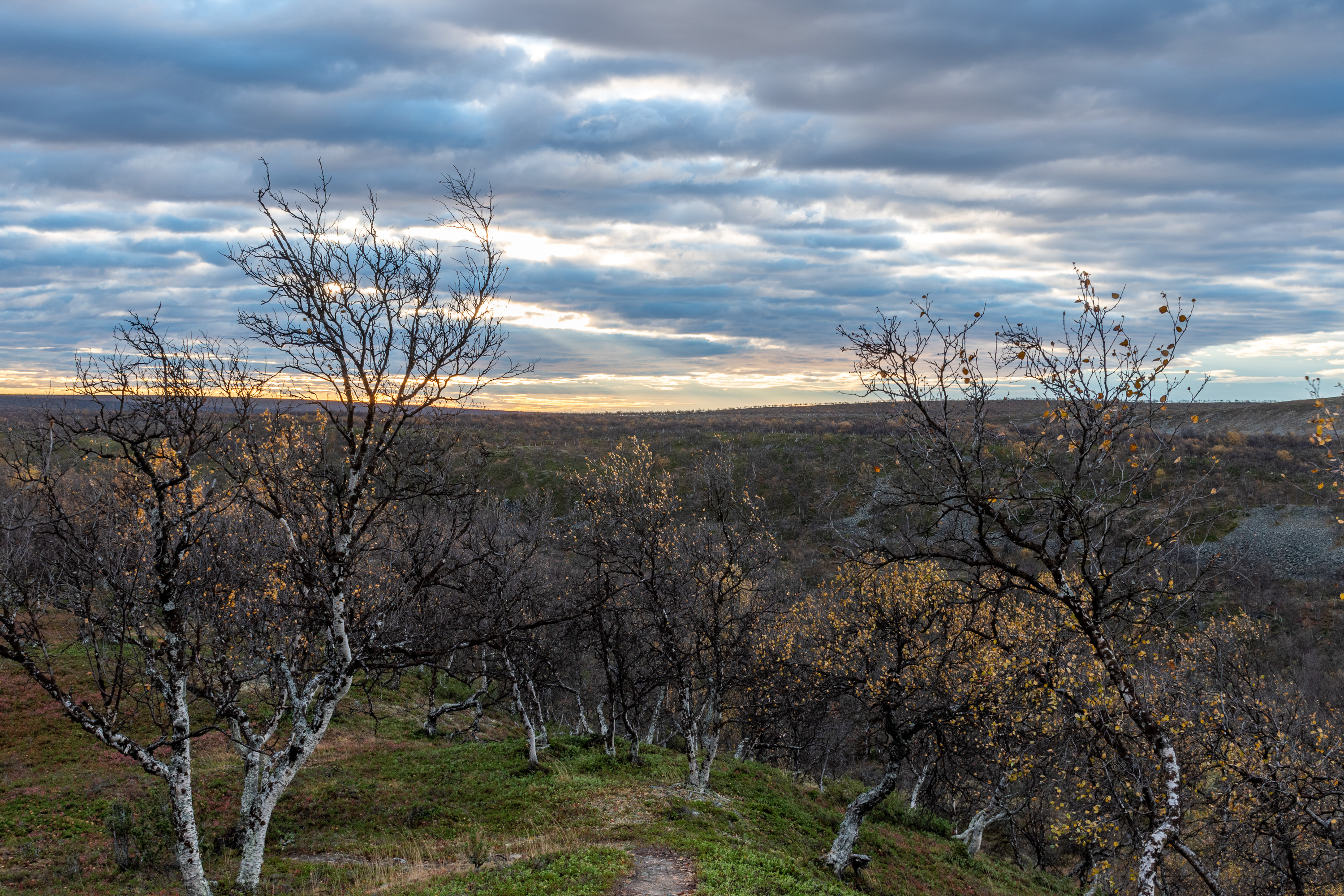 В этих местах, ближе к началу похода, как видно, многие березы уже были почти голыми, хотя уже ближе к середине маршрута на них еще оставались все листья. Не могу сказать, вызвано это тем, что ближе к началу климат суровее (в принципе, высоты тут 300-400 м над уровнем моря, дальше на склонах каньона уже 200-250 м, а на дне каньона менее 150 м), или другими факторами. Заповедник Кево известен тем, что в 1960-х годах в нем 90% березовых лесов было уничтожено мотыльком — ларенцией осенней, по-фински tunturimittari, "тундровый мерщик" — и с тех пор они так и стояли на корню сухие. С тех пор, конечно, много времени прошло и леса успели восстановиться, но в 2008 году еще довольно много, 356 кв. км, сожрал другой похожий мотылек, зимняя пяденица (hallamittari, "морозный мерщик"), который ранее на таких широтах не встречался.