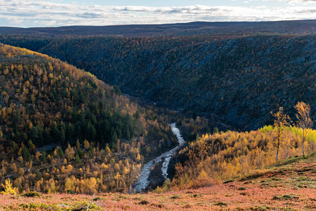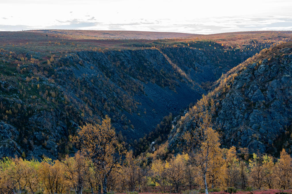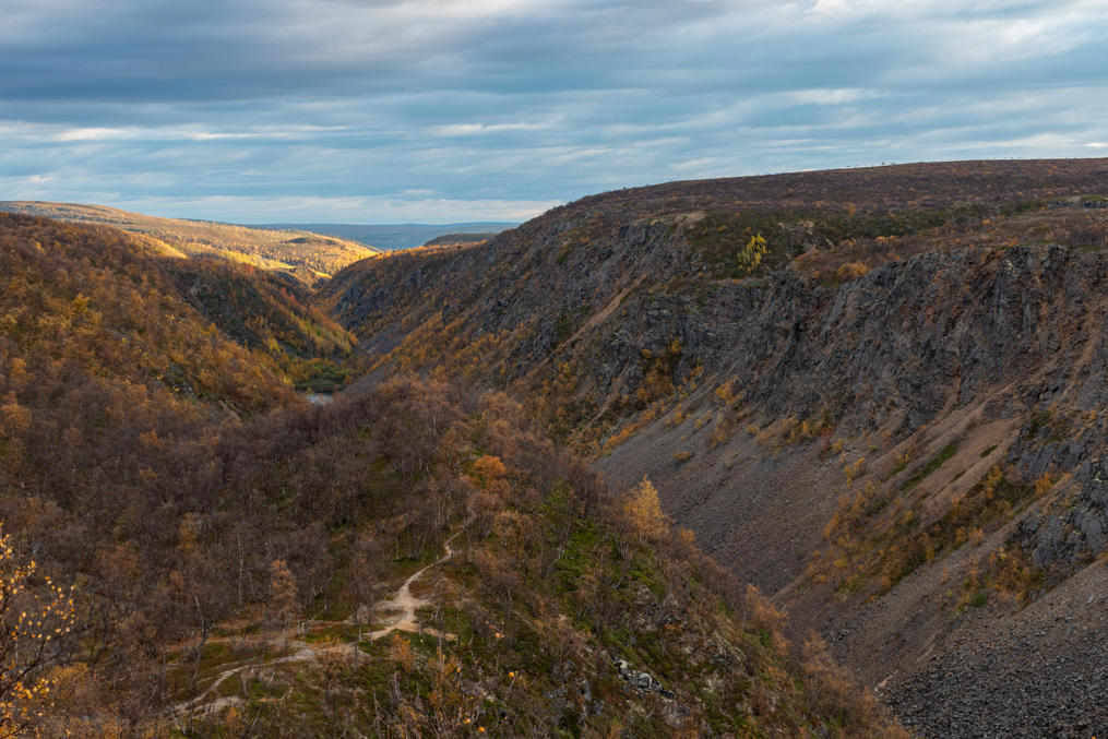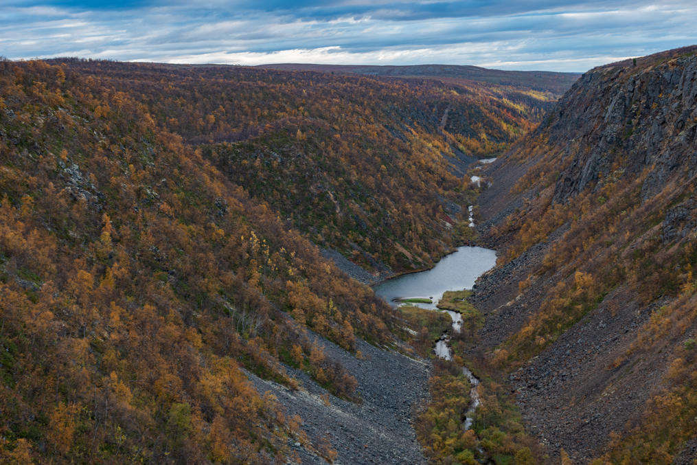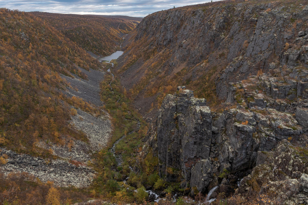 Каньон имеет в длину около 40 км, а в высоту местами до 80 м, и это, конечно, самый большой каньон во всей стране. Вот вдоль него-то и идет главный 63-километровый маршрут через заповедник — от одной дороги на Норвегию до другой, практически напрямую. Конечно, каньон начинается далеко не сразу, а лишь в 25 км от цивилизации.