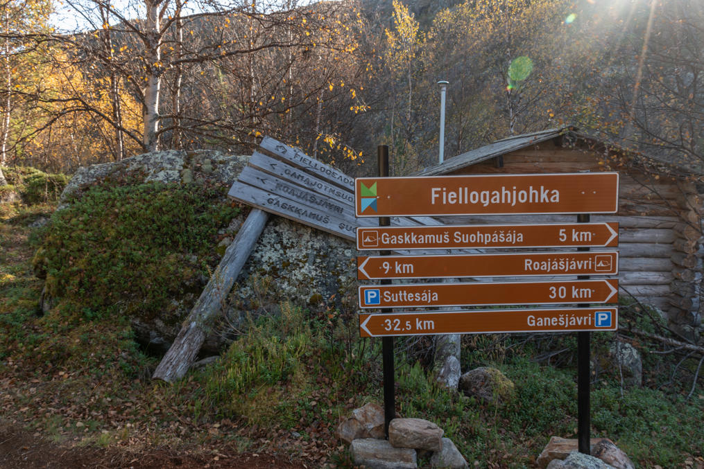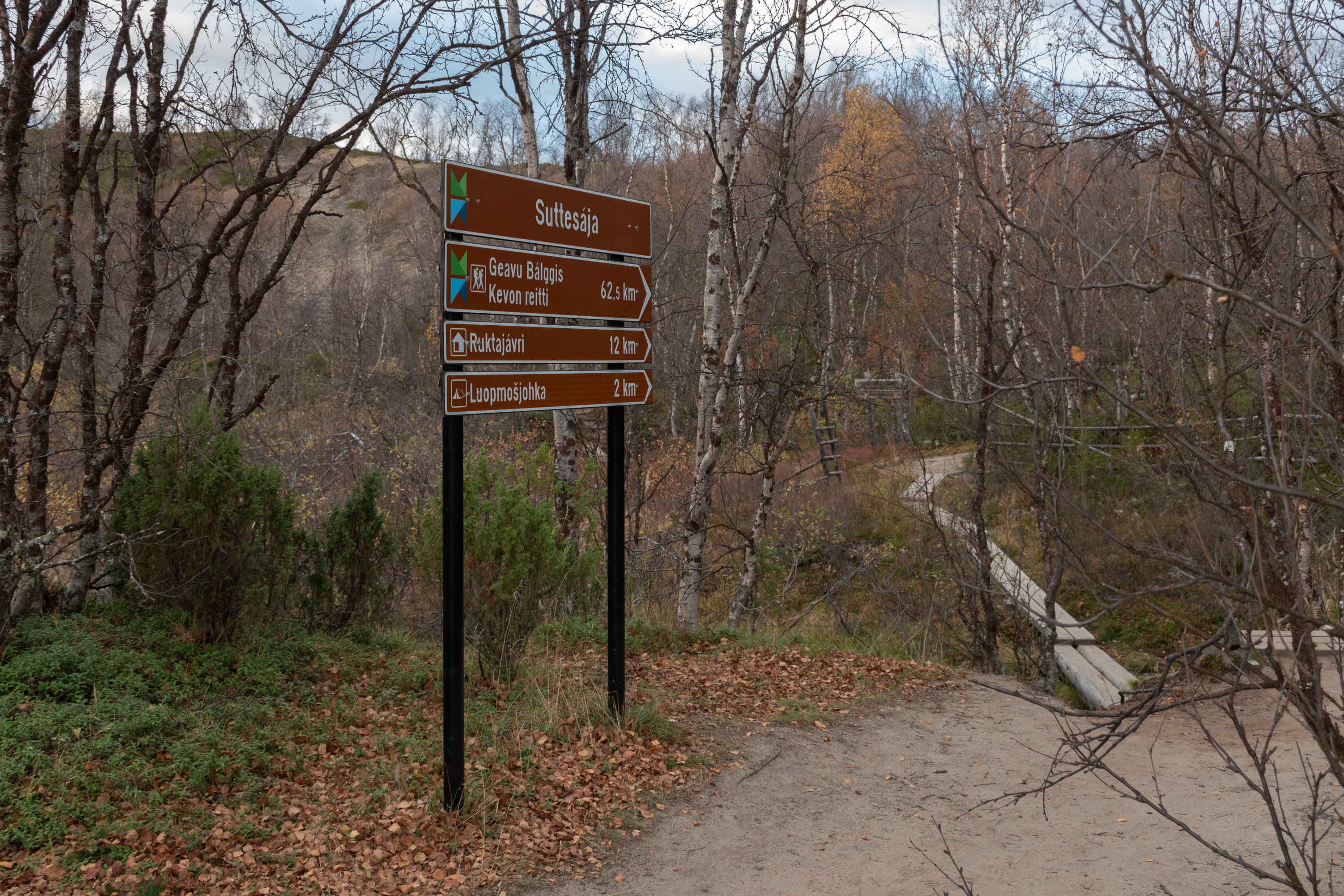 3. Вот он, вход, с новенькими табличками. Сулаойя (Sulaoja, фин. Талый ручей) по-саамски называется Suttesája. Вся топонимика, включая названия мест стоянок, на маршруте исключительно саамская — только конечные пункты Сулаойя и Кенесъярви да сам каньон Кево с рекой Кевойоки имеют устоявшиеся финские названия. Саамские названия даже у меня запоминались с порядочным трудом, тем более что большинство из них довольно однообразные.