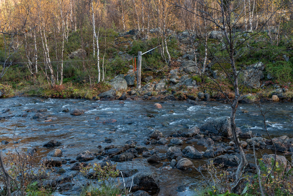 42. А Фиеллогахйохку нужно пересечь вброд — первый брод на маршруте. В этом месте все петли, за которые можно держаться, были на дальней стороне — вообще, конечно, в таких случаях лучше бы последнему, кто переходит, вернуться оттащить назад за собой несколько. Ну, с походными палками все равно удобнее, да и эта речка совсем неширокая.