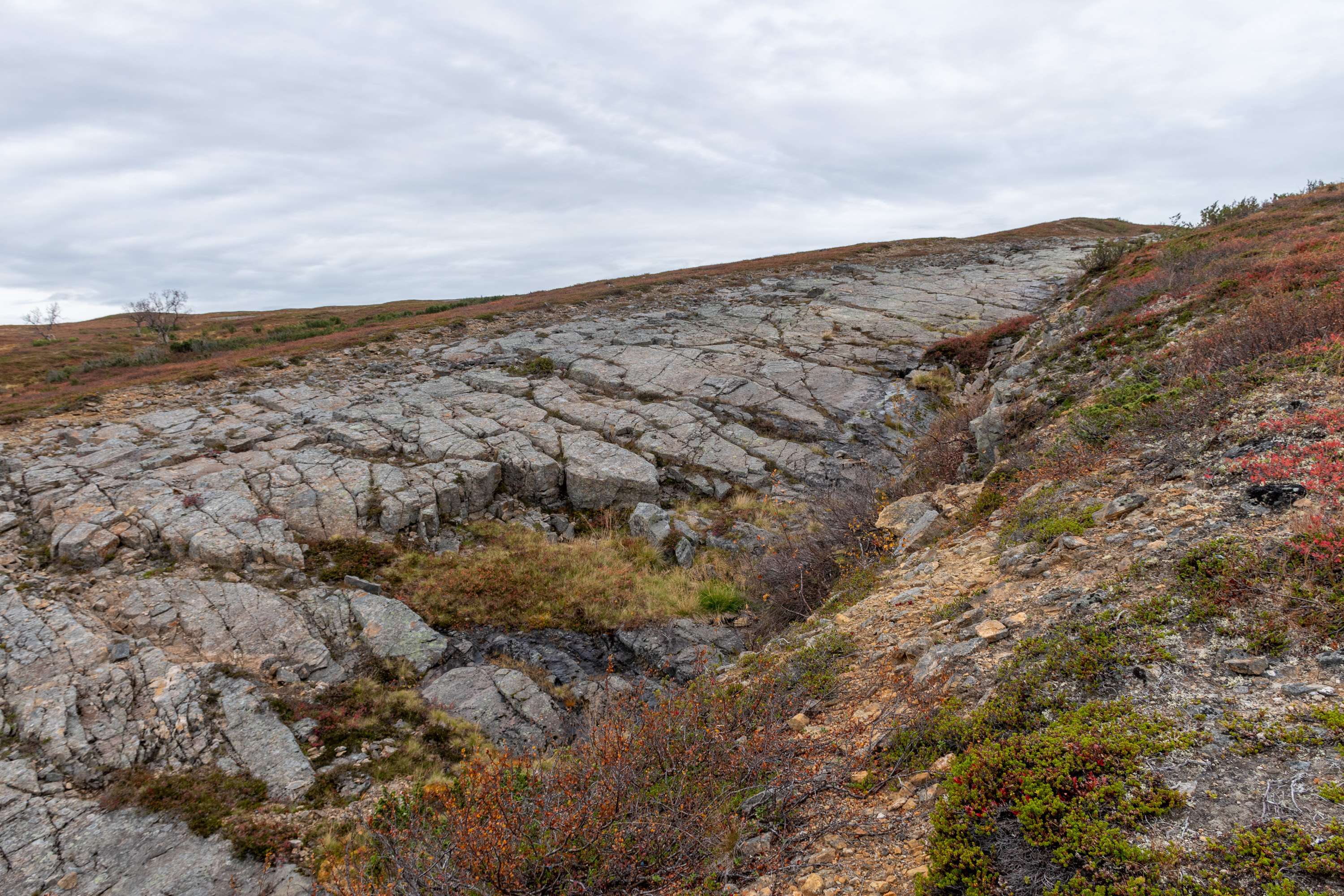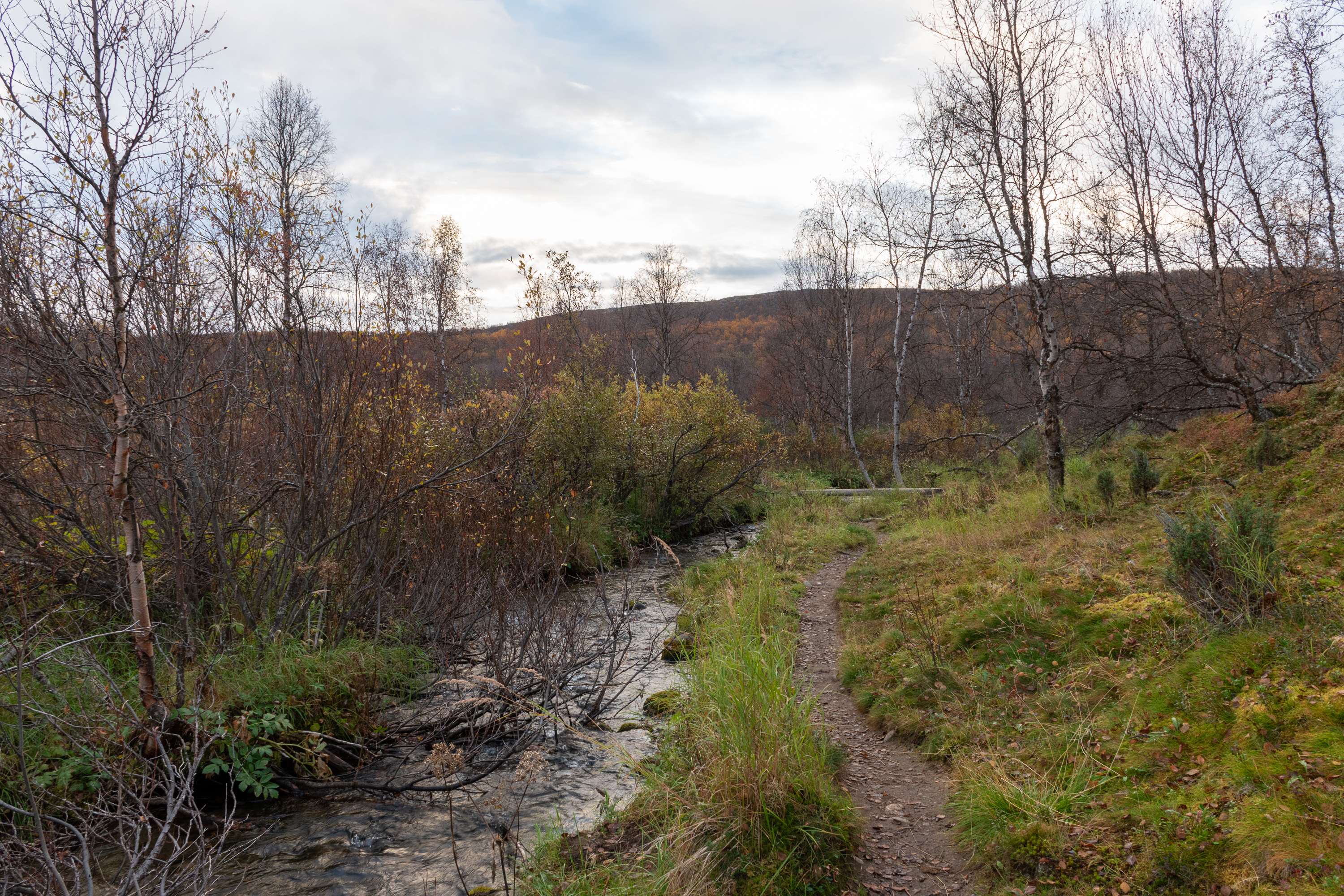 33. Видом со Стены Кево можно любоваться долго, но надо продолжать. Небольшой участок тропы дальше идет по краю каньона, но вскоре отходит снова в сторону — вынужденно — край каньона очень неровный, и идти по нему было бы местами вовсе почти невозможно. Проходим бывшее место стоянки Гасккамуш-Суохпашайя (Gaskkamuš Suohpášája, саам. ручей Среднего Брода).