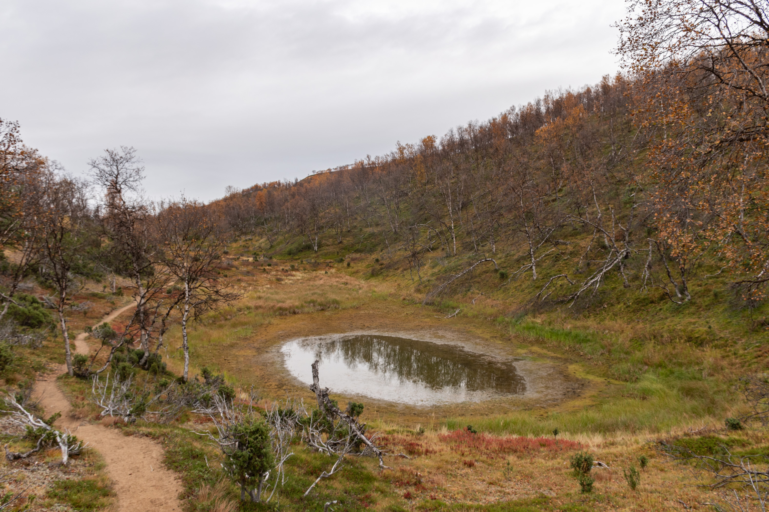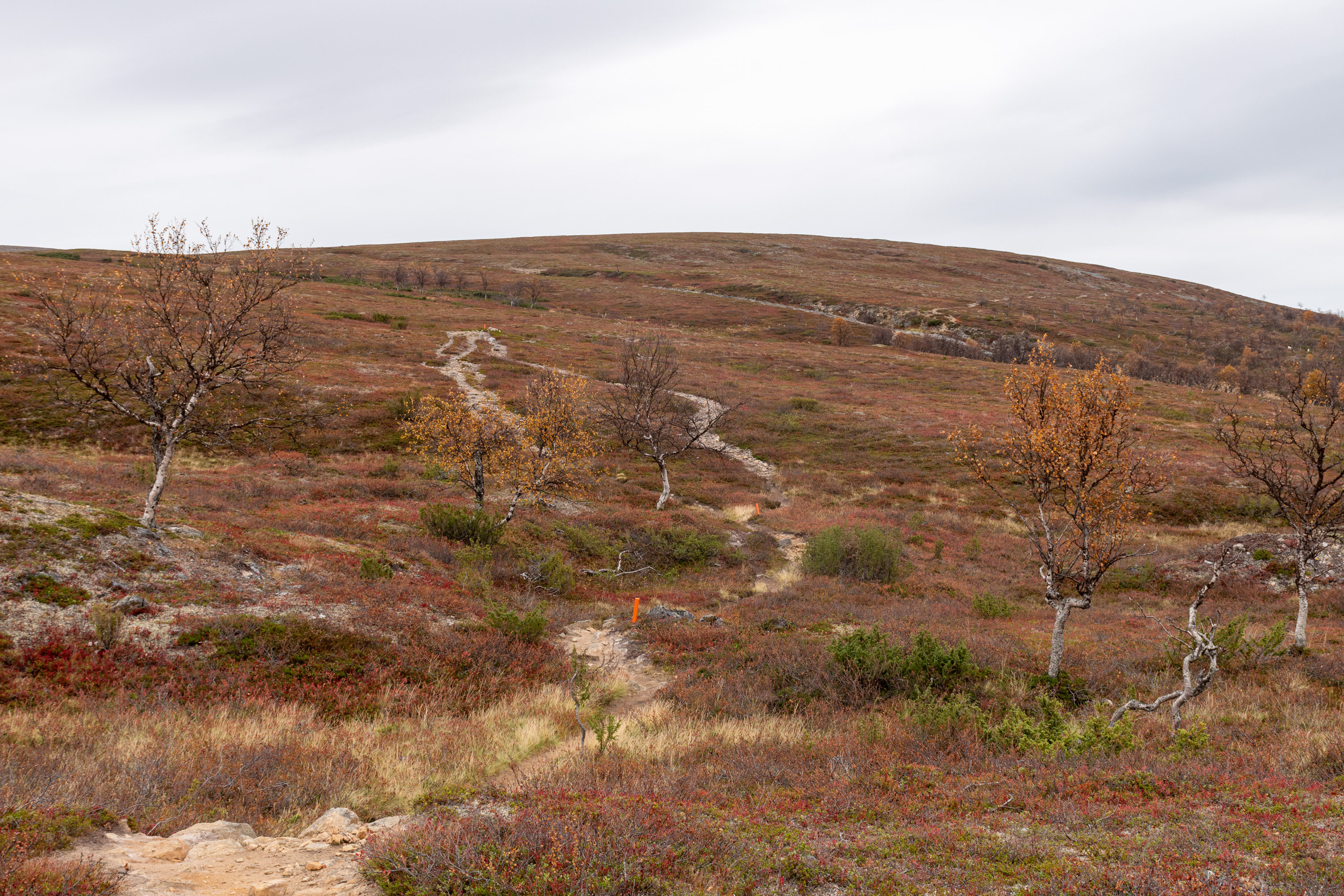 21. И от этого озерца нас наконец ждет первый подъем в тундры, за линию деревьев, на пологие склоны сопок Геаввогеашоайввит и Суохпашоайви. В такие пейзажи тропа в дальнейшем будет подниматься и опускаться обратно в каньон несколько раз.
