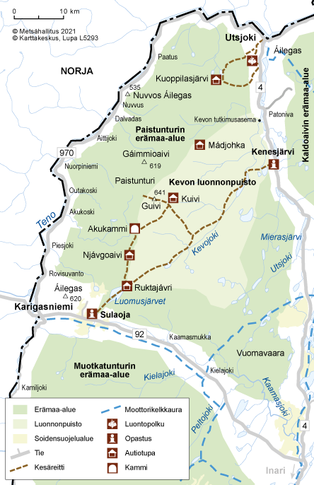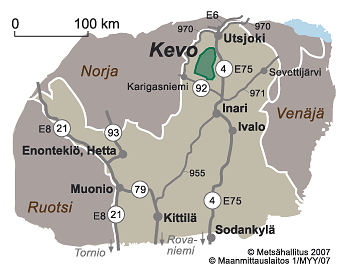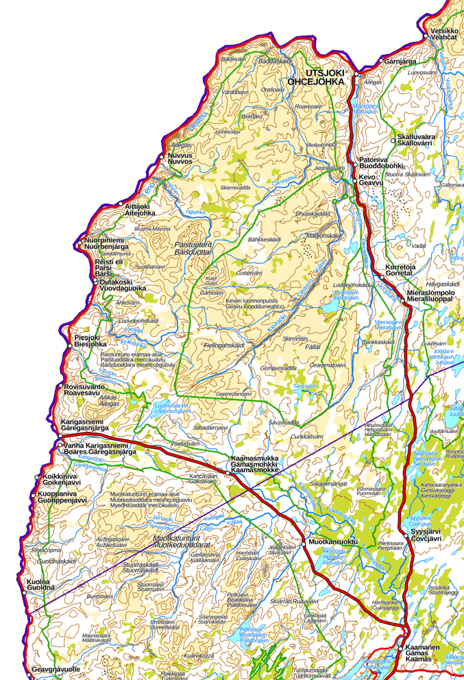 Кево, как видно, находится в "голове" Финляндии, между двумя ведущими в Норвегию дорогами — трассой 92 на Каригасниеми и трассой 4 на Утсйоки. Он почти целиком "вложен" в другую охраняемую природную территорию, значительно менее строгого статуса — заповедную территорию Паистунтури (Paistunturin erämaa-alue). Поход по состоящей в основном из тундровых плато Паистунтури я показывал тогда в посте про Утсйоки. Большую часть Кево занимают тоже подобные плато и возвышающиеся над ним отдельные сопки-тундры, самая высокая из который — Куйви (Kuivi, саам. Guivi), 641 м. Но главная достопримечательность — рассекающий это плато с юго-запада на северо-восток огромный каньон Кево, в котором течет река Кевойоки (Kevojoki), она же Геавву (Geavvu). Каньон заметен на топографической карте даже такого масштаба: