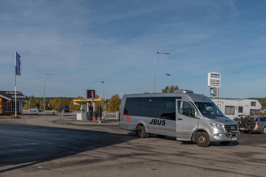Предыдущие две ночи я ночевал в Северной Норвегии, в гостинице в Лаксэльве. Первым делом нужно было оттуда отогнать машину до Кенесъярви. Это почти 200 км езды, автобус мой от Кенесъярви уходил в 10 утра, в Норвегии еще разница с Финляндией по времени в час, так что вставать пришлось в пять утра по норвежскому времени. По пути заехал к началу маршрута в Сулаойя и оставил там в укромном месте, на крутом пригорке рядом с придорожной стоянкой, рюкзак и походные палки, чтобы не таскать за собой весь день — с собой взял сворачивающийся до размеров яблока дневной рюкзак (daypack) с камерой и другими ценными вещами. В Кенесъярви оставил верный "Дустер", пошел на остановку — столб у дороги посреди ничего; со мной ехала отсюда еще пара молодых людей с рюкзаками и прочим, не сразу определившихся, в каком направлении им нужна остановка (нужное, на юг на Инари — дальше от стоянки, за мостиком через речку). Они, впрочем, с похода, видимо, уже возвращались, больше их не встречал. Немного переживал, придет ли автобус вообще и остановится ли — мне как-то не приходилось раньше ловить единственный автобус в день на столь пустынной остановке — но пришла таки нужная "газель" Нуоргам-Ивало, местного перевозчика JBUS, и по давно купленному онлайн билету меня благополучно пустили. Народу было не так и мало, причем не только туристы, впрочем, толком не разглядывал. Часа полтора, и я вывалился из этой газели на парковку К-Маркета в Инари.