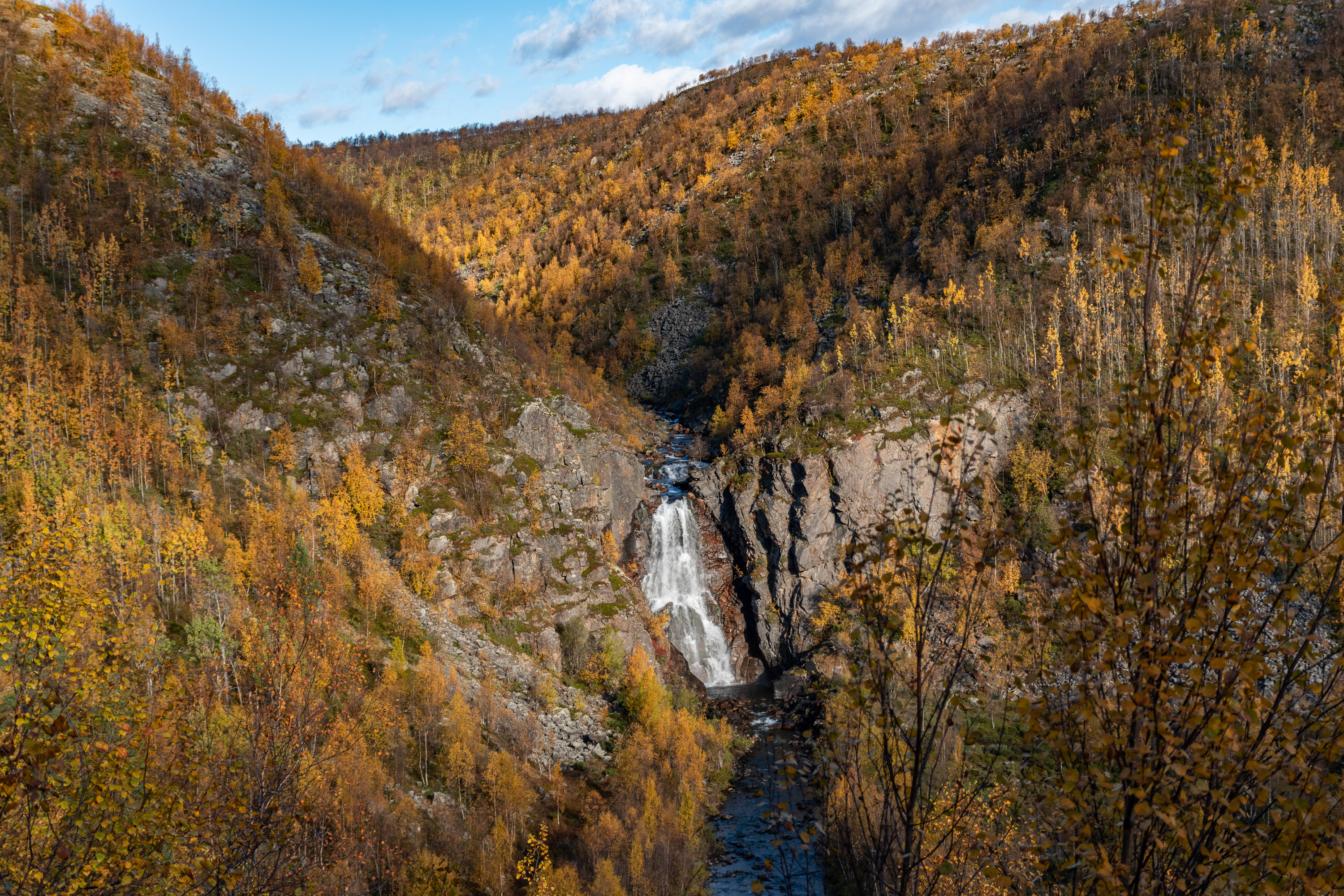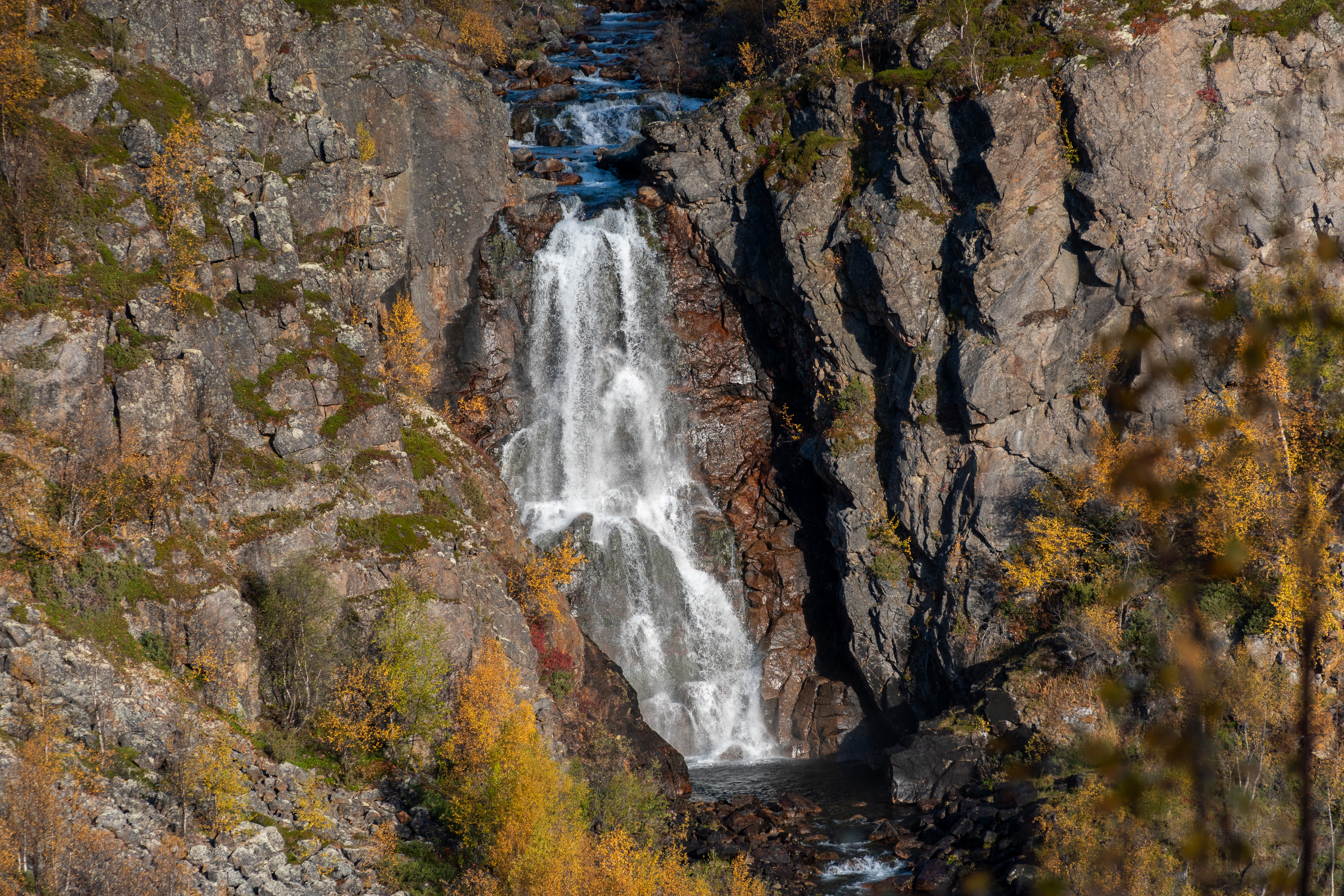 40. А по левую руку вскоре открывается вид на вторую главную достопримечательность всего машршрута — водопад Фиеллогоржи (Fiellogorži), или Фиеллу (Fiellu). Этот водопад высотой в 26 м, в две ступени, считается одним из самых больших и красивых водопадов всей Финляндии — но также и одним из самых труднодоступных, здесь в 30 км от цивилизации; лишь Пихтсускёнгяс (Pihtsusköngäs), "Ниагара Финляндии", по пути на гору Халти, еще труднодоступнее из известных.