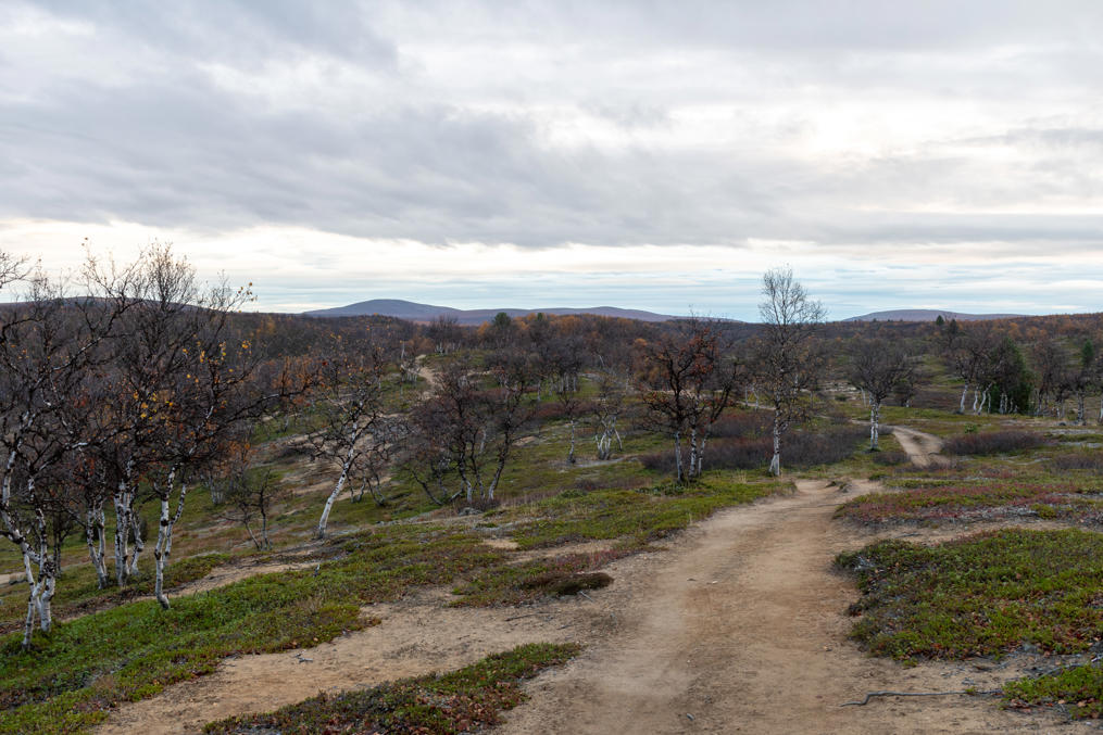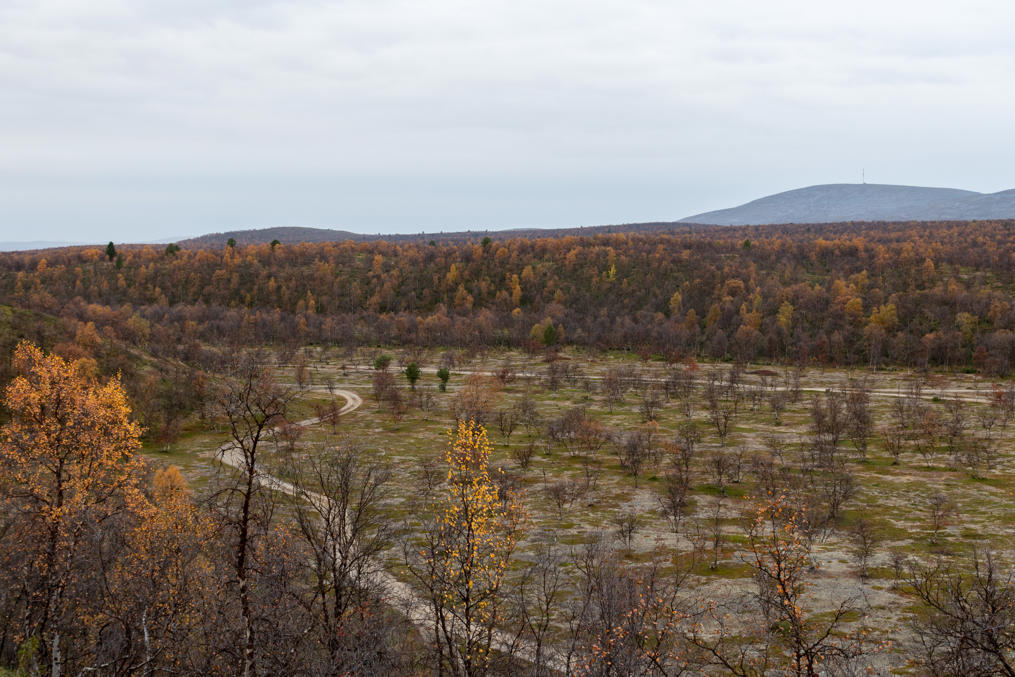 12. Дальше пошла тропа снова по поросшим горной березой грядам, весьма легкопроходимая, несмотря на мелкие подъемы и спуски. На западе по долине Луопмошйохки вьется грунтовка и расходящиеся от нее колеи, на заднем плане сотовая вышка на горе Айлегас (одной из трех гор Верхней Лапландии под таким названием) раздает интернет. Отсюда, со стоянки Луопмошйохка, начинается заповедная территория Паистунтури, но до собственно заповедника еще далеко. Граница на местности никак не отмечена.