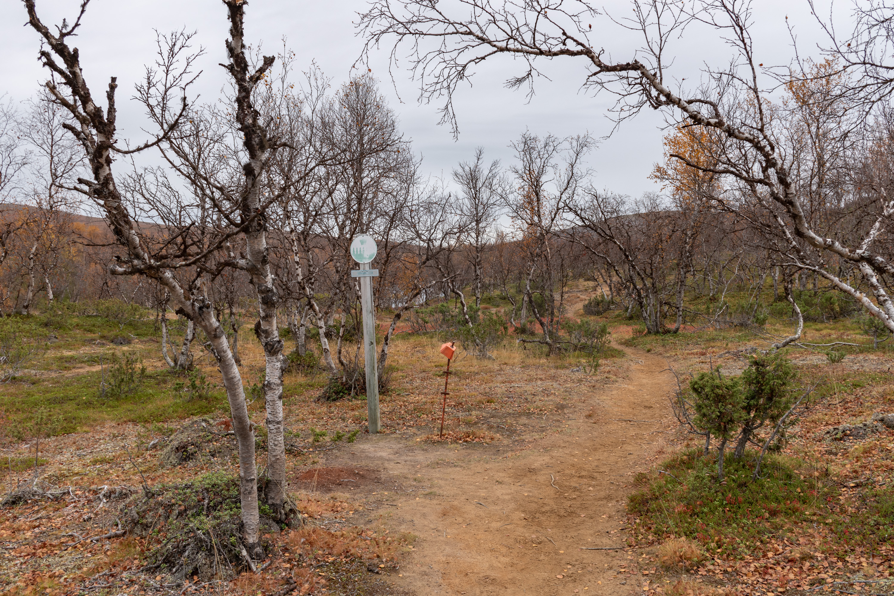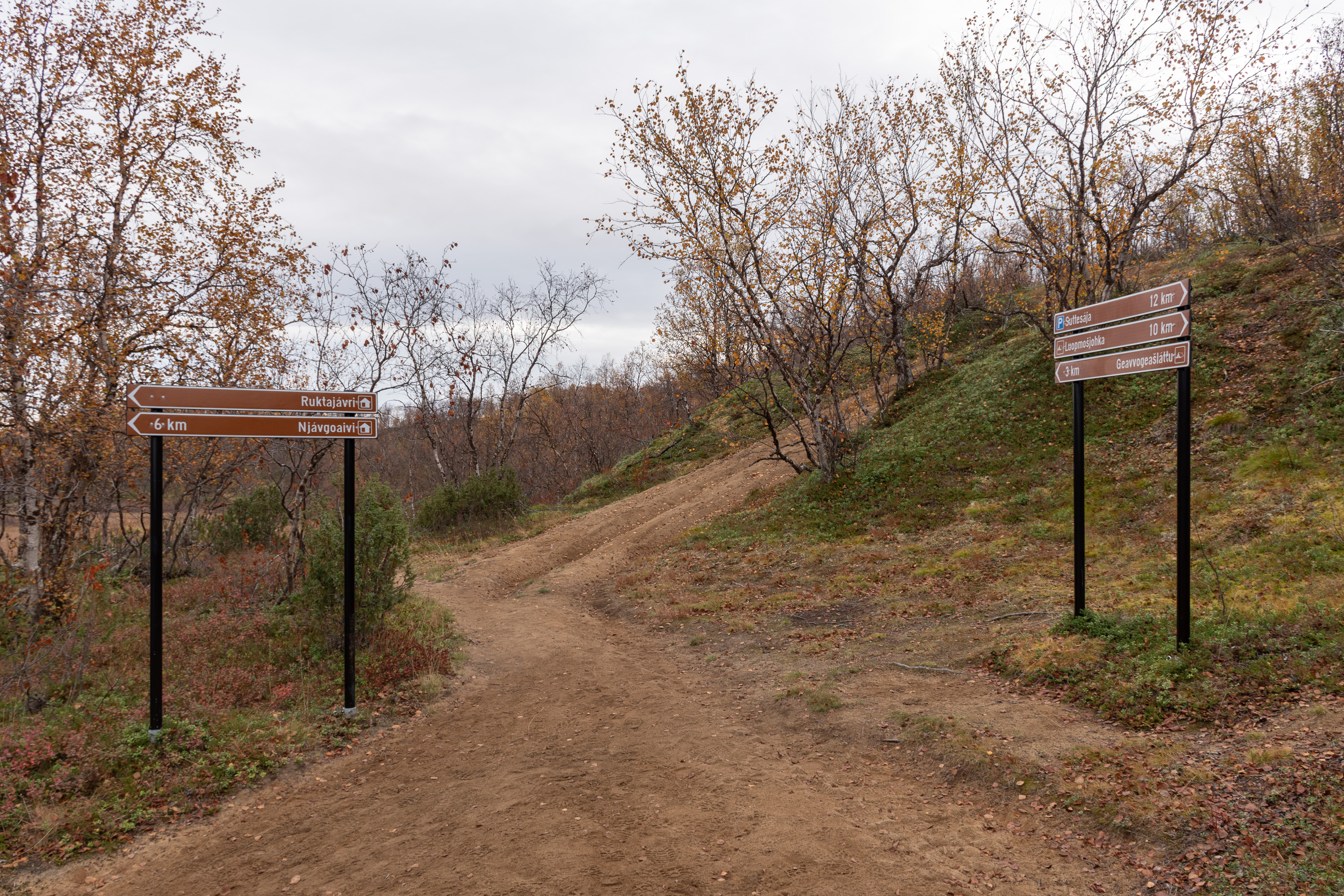 17. Стоянка Руктаяври (Ruktajávri), у одноименного маленького озерца с топкими берегами, лежащего за теми большими. 10 км от предыдущей, и единственная стоянка вдоль маршрута Кево 63 км с хижиной для ночевки (autiotupa). К Руктаяври примыкает один из концов петли маршрута Куйви 87 км — на указателе хижина Ньявгоайви (Njávgoaivi) находится именно на нем. Ну а нам — прямо.
