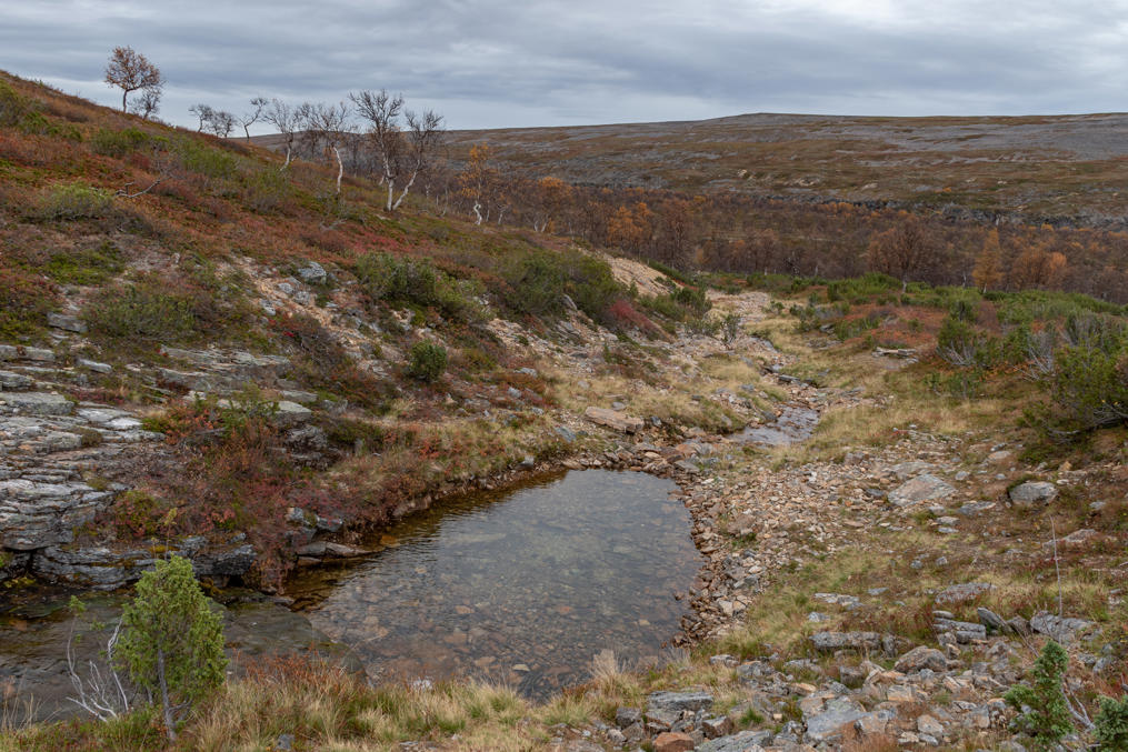 10. Проснулся окончательно я после шести утра. Планировал выйти как можно быстрее — световой день составлял всего 12.5 часов, и я, зная, каким довольно медленным может быть передвижение в сложной местности с рюкзаком, и как лично мне довольно часто приходится останавливаться передохнуть каждые несколько километров, даже опасался, успею ли до заката — за второй день нужно было пройти 21.5 км. Опасения оказались в итоге совершенно беспочвенными, но вышел я таки раньше почти всех, в 7:30. Сразу же перешел Луопмошйохку, которая действительно оказалась почти ручьем — видимо, в тот мегародник Сулаойя вся вода из нее уходит выше по течению.