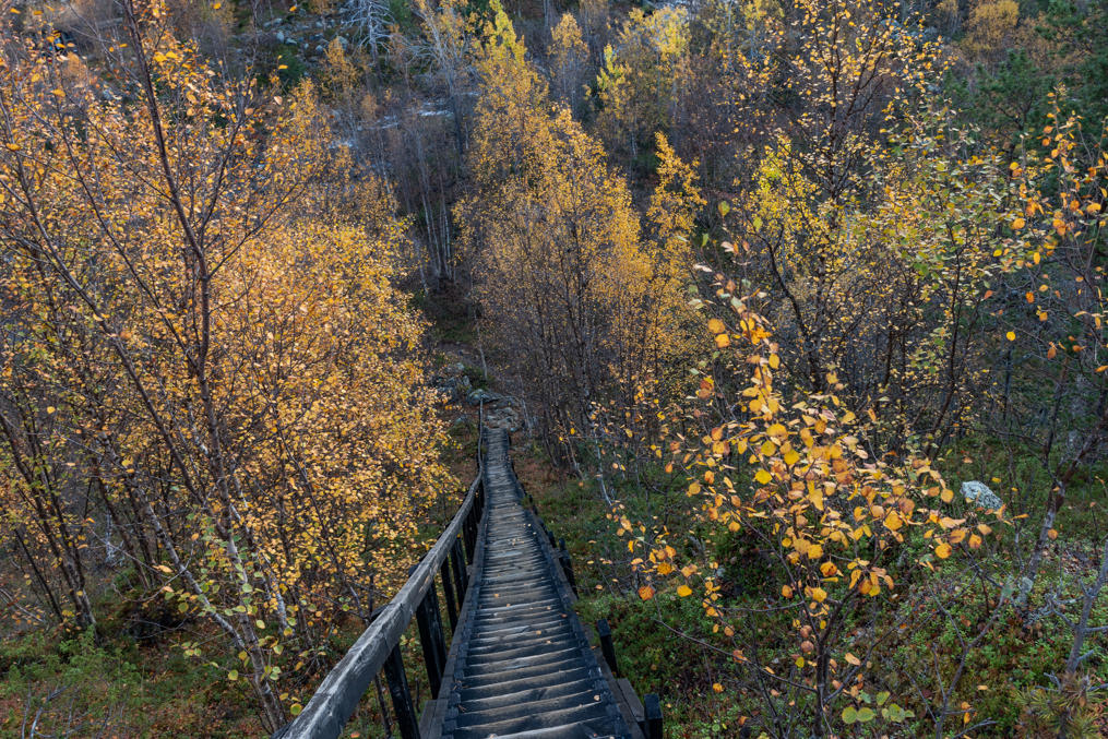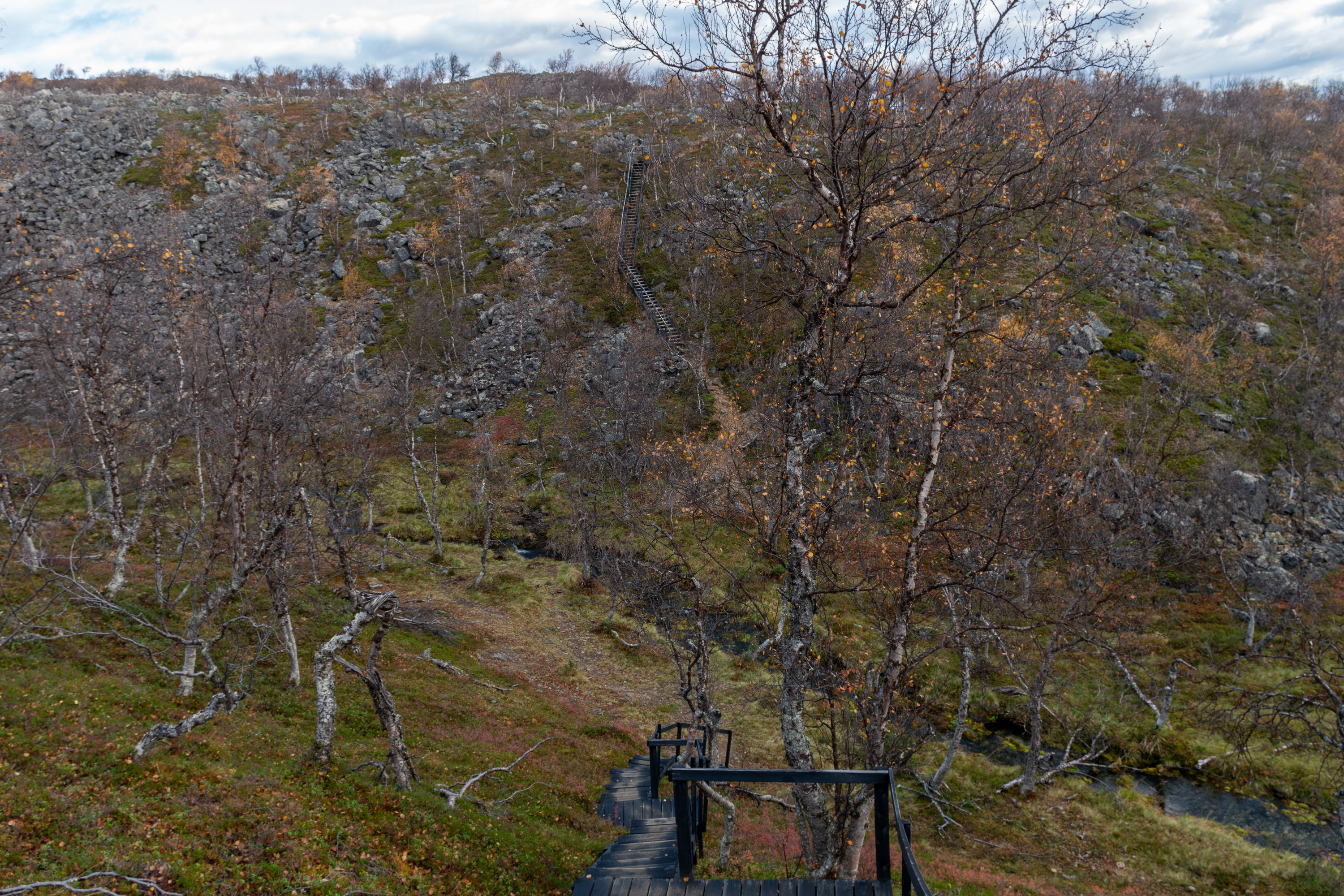 Но тропа, как я уже сказал, считается в целом сложной. Хотя она и не забирается на горы как таковые, вдоль каньона есть множество перепадов высот — придется много раз спускаться и подниматься как в сам каньон, так и в образованные впадающими в него ручьями небольшие ущелья — хотя почти все крутые подъемы и спуски оборудованы лестницами. Местами тропа очень сильно каменистая. Четырежды придется пересекать реки вброд, хотя это не очень сложно, есть тросы, за которые можно держаться, и помимо этих бродов других сырых мест практически нет. Ну и главное, конечно, удаленность от цивилизации; связь вдали от начала и конца тропы плохая и нестабильная, возможности сойти с маршрута на полпути нет, а также, в отличие даже от нац. парка Урхо Кекконена, практически нет хижин для ночевки (всего одна на основном маршруте). Ночевать нужно исключительно самостоятельно в палатке, так что следует быть мало-мальски уверенным в собственных силах и экипировке. Разумеется, палатку ставить тоже можно не где угодно, но стоянки вдоль тропы по крайней мере размещены достаточно часто, через 2-11.5 км, все, разумеется, оборудованные туалетами и местами для костра, некоторые — хижинами для привала (не ночевки).