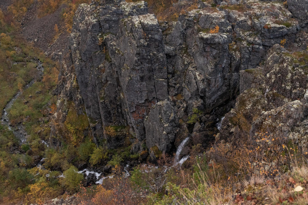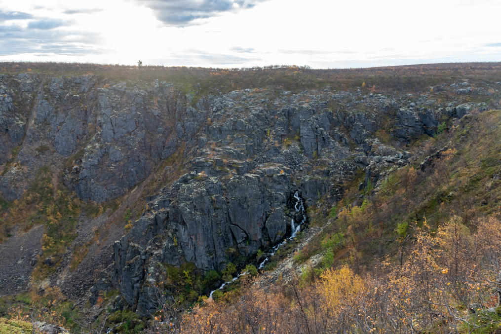 32. Из верхнего течения река Кевойоки — на самом деле, конечно, тут еще скорее ручей, чем река — падает в этот большой каньон водопадом. Водопад высотой в 45 м зовется Кеволинкка (Kevolinkka), хотя не уверен, что это название не придумано автором сайта о водопадах Финляндии. Linkka — редко встречающееся в топонимах диалектное слово для водопадов в северной части Лапландии.