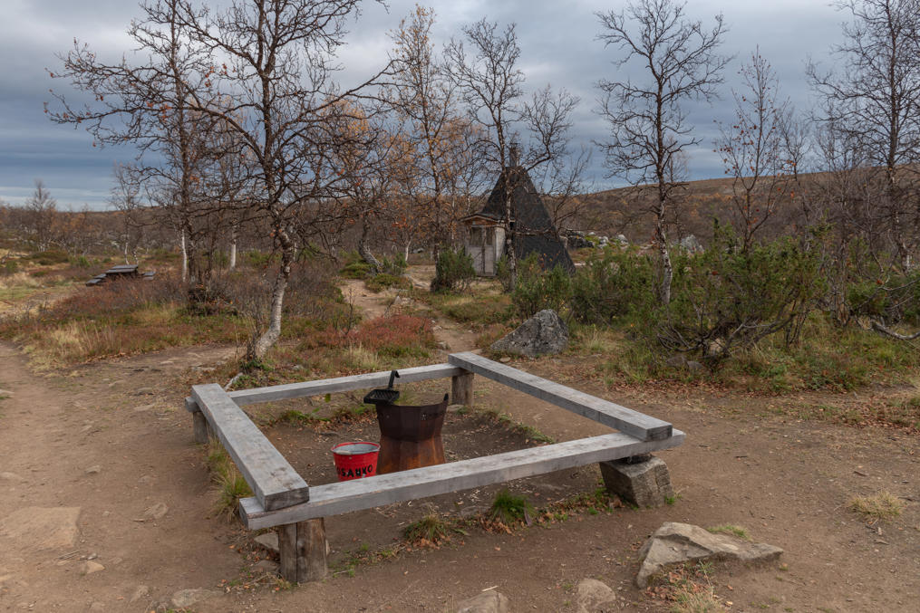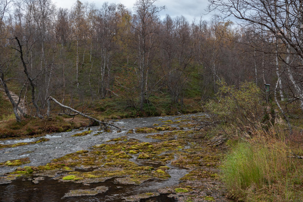 43. Стоянка Фиеллогахйохка (Fiellogahjohka) — самая популярная на всем маршруте, хотя если начинать вечером, как я, то по времени заночевать тут получится вряд ли. Тут еще многие только собирались в дорогу, хотя я уже от своего места ночевки 6.5 км успел пройти. Для привала (не ночевки) тут есть землянка.