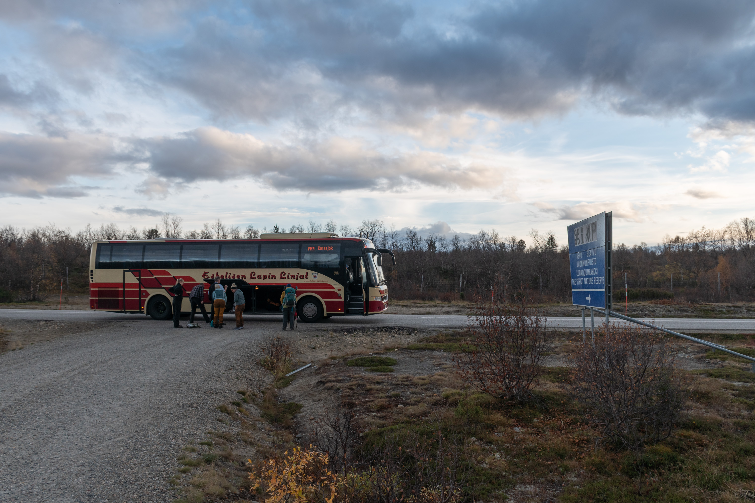 2. Еще час, и этот автобус таки довез до точки начала маршрута, Сулаойя, остановившись на трассе 92 на Каригасниеми-Карашок прямо посреди проезжей части у своротки на парковку. Eskelisen Lapin Linjat главный междугородный перевозчик в Лапландии и между Лапландией и Северной Норвегией, постоянно их автобусы в Лапландии видишь на дорогах, но прокатиться на таком довелось впервые. Со мной выгрузилось еще несколько пар туристов — наверное, удивились, что я никакого рюкзака из багажа не достал, а вместо этого бодро потопал со своим дневным рюкзачком и пакетом еды куда-то вдаль. Ну, мой основной рюкзак, оставленный тут под березкой с утра, конечно, был на месте в полном порядке, я переупаковал в него еду и прочее, забрал, и где-то в 18:25 наконец можно было приступить.