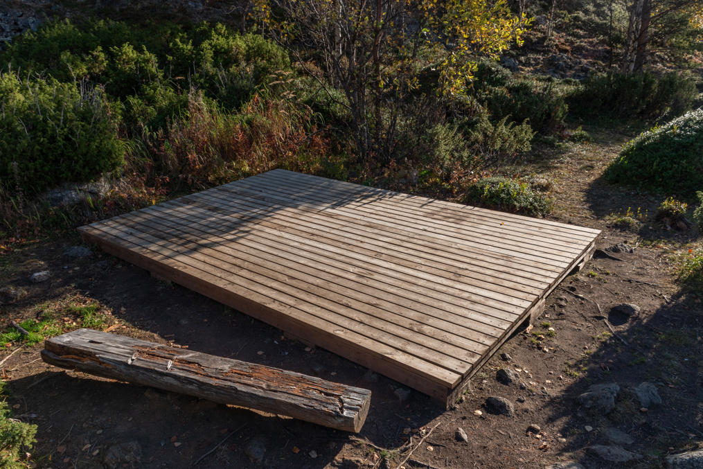 44. На этой и некоторых других стоянках местность достаточно неровная, что для палаток предлагаются вот такие вот небольшие помосты. Опционально, они лежат под навесом в сторонке, этот из двух секций составлен. Не встречал такого раньше.