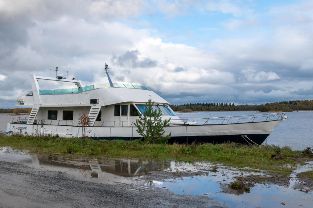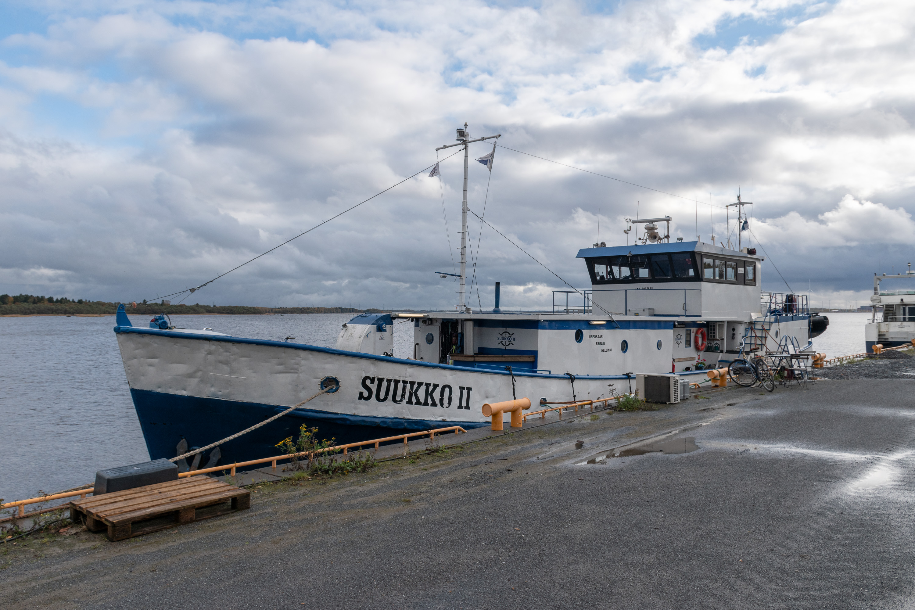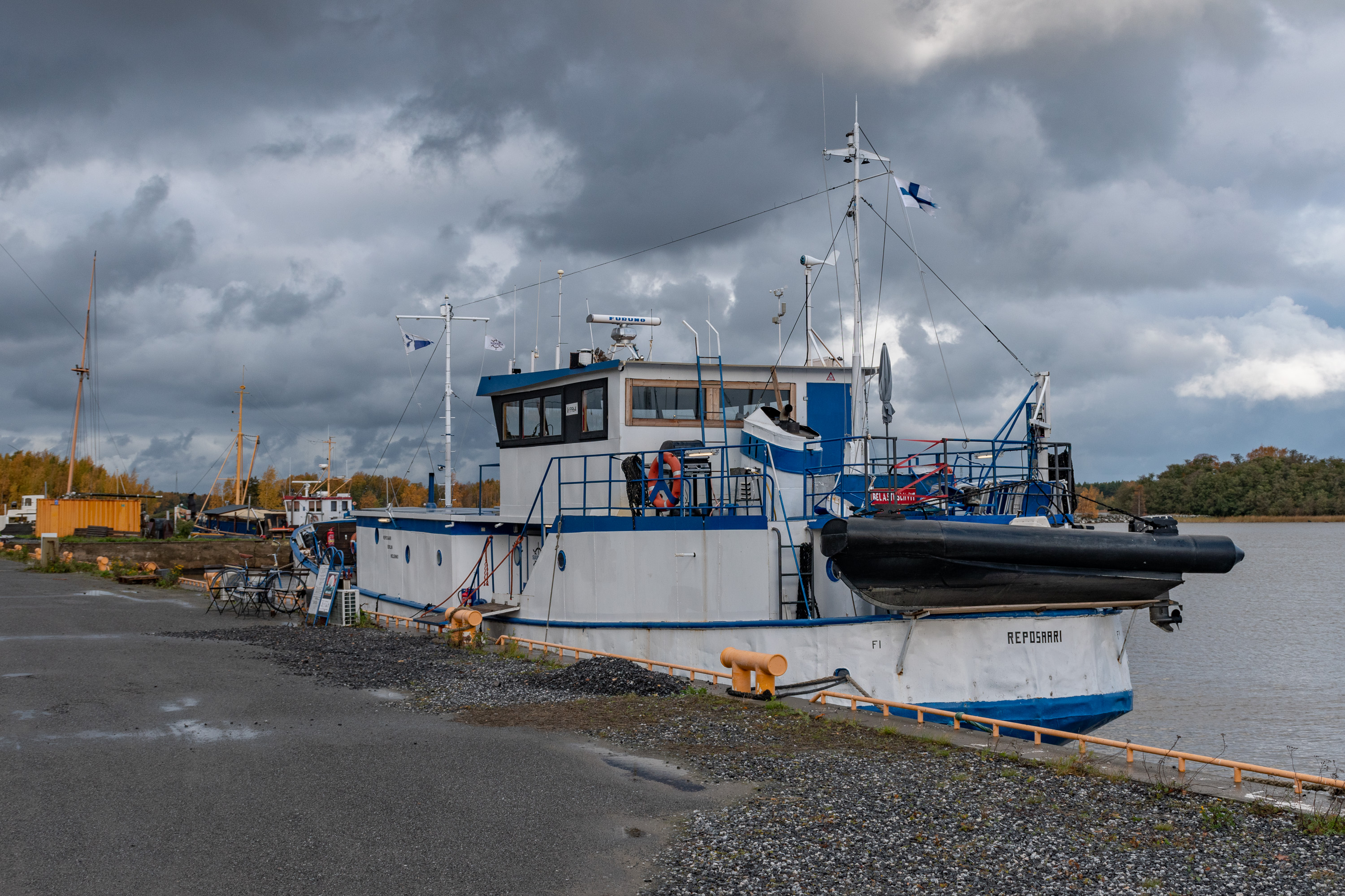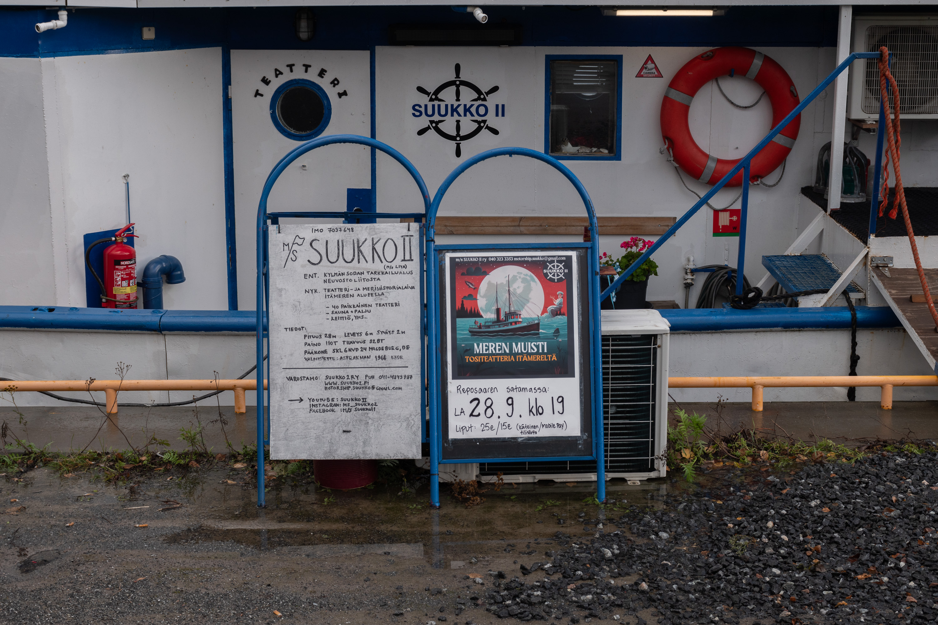 7. Особого внимания достоин Suukko II — "Поцелуй-II". Это бывший советский шпионский траулер; у СССР, да и у современной России предположительно, был/есть целый флот лже-траулеров, которые на самом деле занимались различной разведывательной деятельностью у чужих берегов. Это судно построено в 1966 в Астрахани, и, как выяснилось после снятия слоя краски в ходе последнего ремонта, проходившего тут же на Репосаари, раньше звалось "Лия" и было приписано к порту Таллинна. Внешне оно выглядело как рыболовецкий траулер, но люки в трюм были заварены, а вместо баков для рыбы там были помещения экипажа. Точная история судна неизвестна, у него было несколько владельцев в Финляндии, у которых оно в основном просто стояло на приколе, а реставрировали и начали активно им пользоваться нынешние владельцы, Буман-Пенттинены, купившие его в 2020. "Поцелуй-II" по крайней мере раньше служил им жилищем (до этого первый "Поцелуй" у них был с 2013, тоже лжетраулер), на нем перемещались между Репосаари и Берлином, где хозяева живут; не очень понятно, занимаются ли этим до сих пор, но сейчас это плавучий театр, заходящий в несколько портов Ботнического побережья Финляндии.