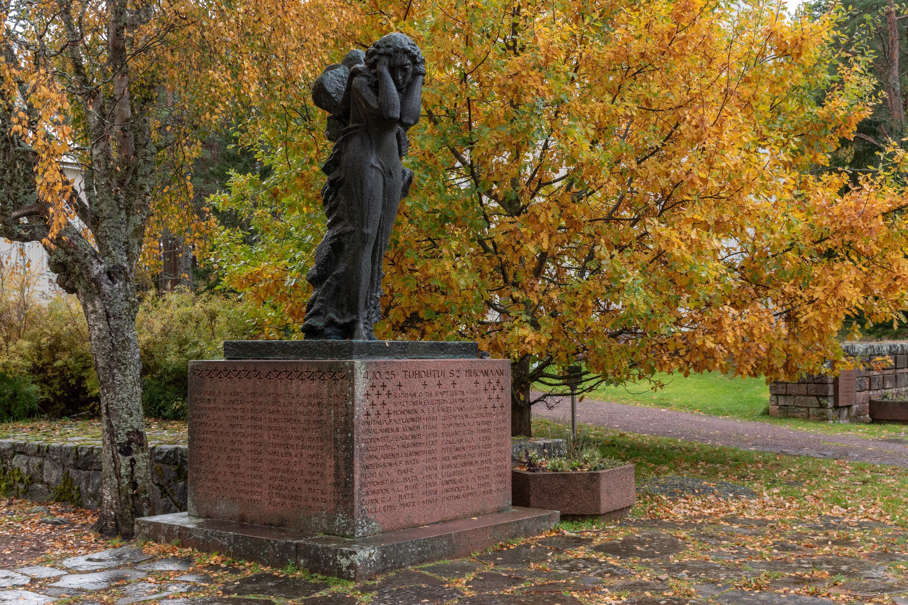 29. И еще памятник — экипажу потопленных в 1942 пароходов Вернера Хаклина, Jussi H и Betty H (он называл их в честь членов семьи, а H, соответственно, означало Hacklin). "Юсси" был построен во Франции в 1910, куплен Хаклином в 1937, 11.9.1942 повез стройматериалы и другие грузы из Раумы в Кёнигсберг (Калининград который), и был торпедирован на следующий день севернее Аландов советской подлодкой С-13 — одной из десятка, отправившихся в августе на охоту в западную часть Финского залива и дальше в Балтику — С-13 в частности залезла аж в Ботнический. На пароходе взорвались котлы, из 23 членов экипажа выжил лишь 18-летний кочегар, которому посчастливилось выбраться на какой-то островок, где его нашли спустя три дня. С-13 впоследствии командовал знаменитый Маринеско, и она заняла в итоге первое место среди всех советских подлодок по тоннажу потопленных судов.