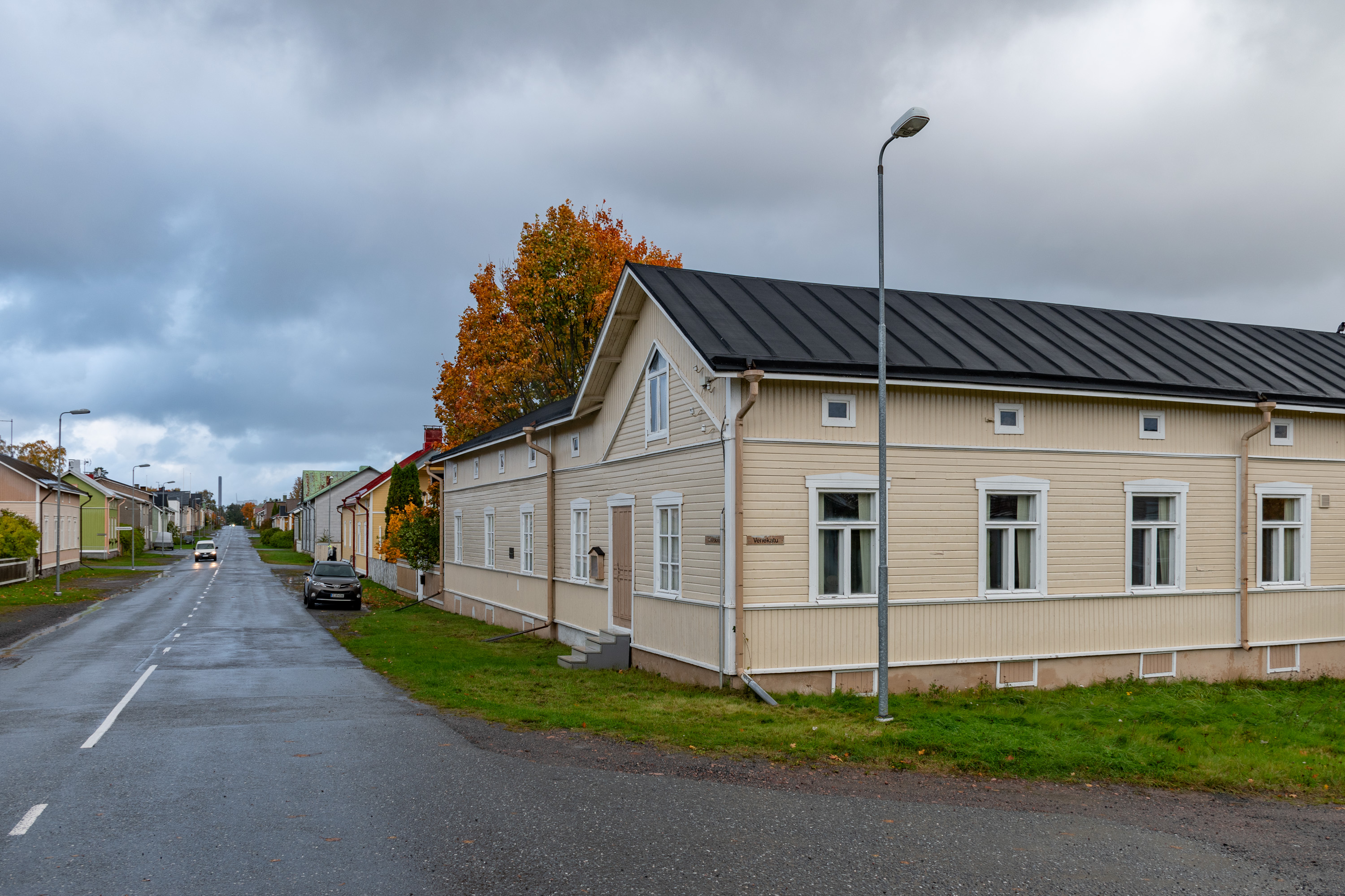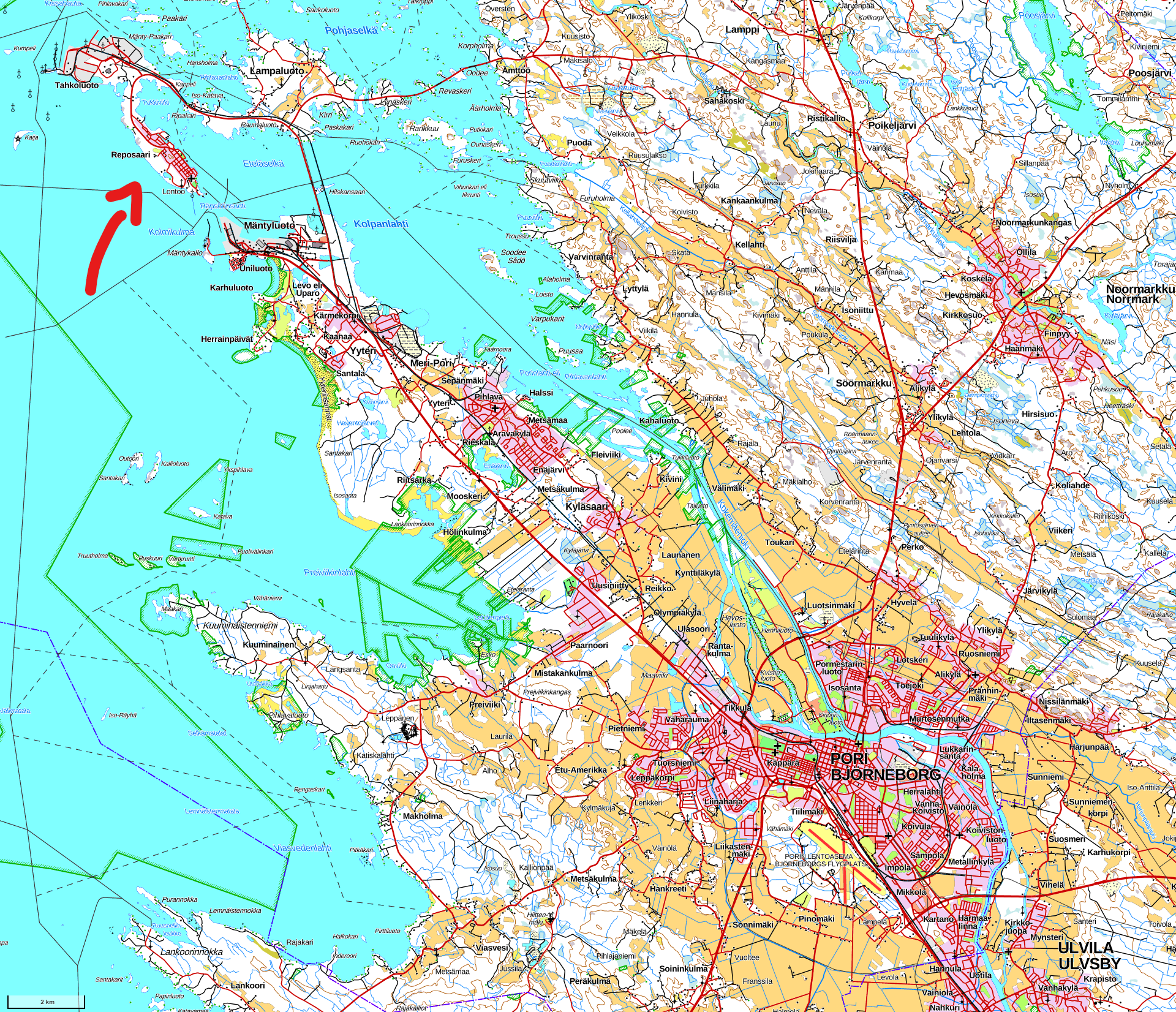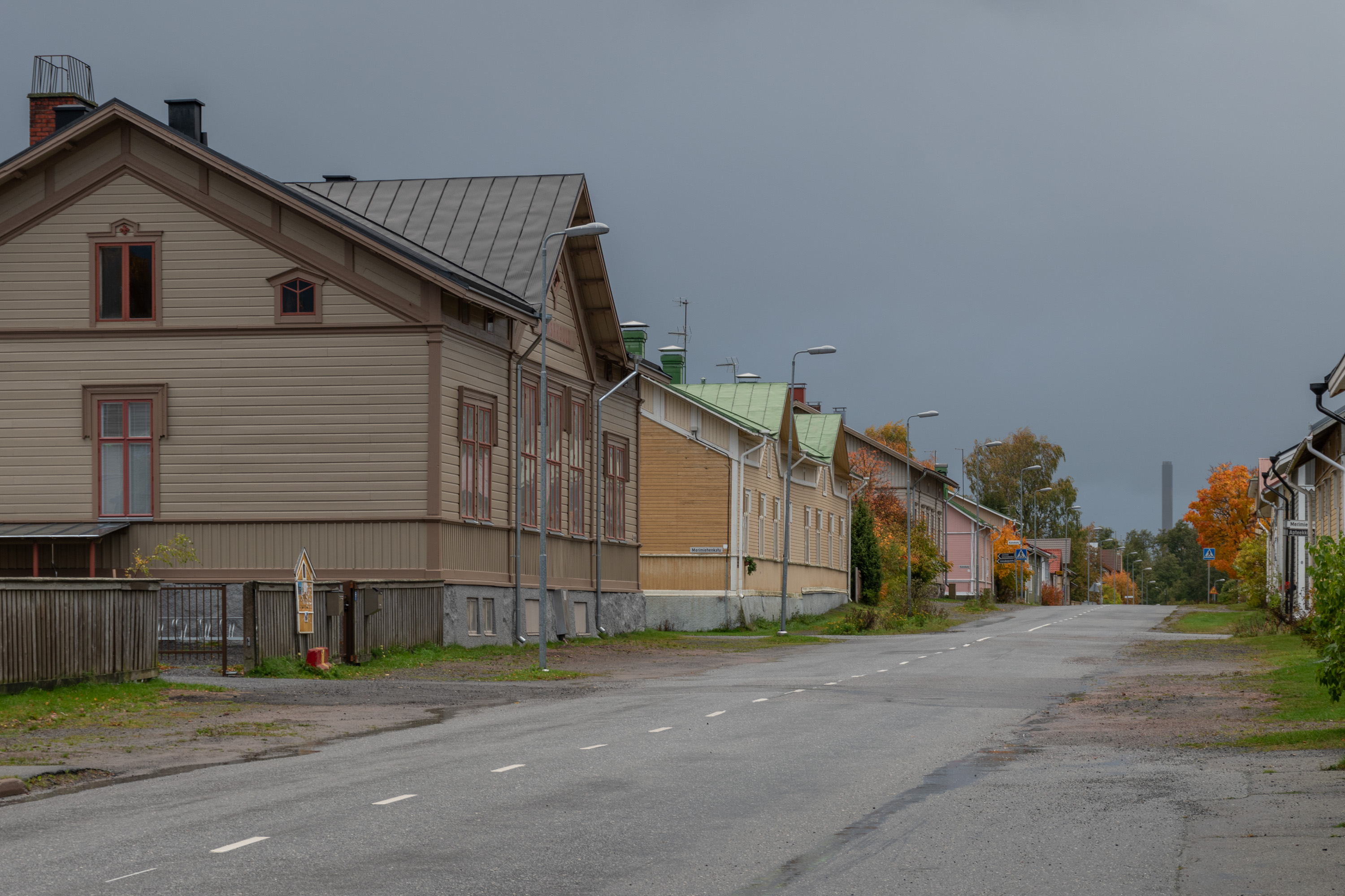 34. Видная далеко слева, в перспективе Церковной улицы, труба довольно высокая — она находится уже не на Репосаари, а в нескольких километрах дальше, на Тахколуото (Tahkoluoto, фин. Точильный риф; на острове предположительно когда-то добывались камни, подходящие под использование как шлифовальные). На этом давно сросшемся с Репосаари острове находится не только другой район современного грузового порта Пори, но и ТЭС Мери-Пори (Meri-Porin voimalaitos) компании Fortum. Это последняя построенная в Финляндии угольная электростанция (в 1994) и самая мощная, 560 МВт. Большинство угольных электростанций Финляндии уже закрыты и снесены, включая располагавшуюся там же рядом ТЭС Тахколуото другой компании (235 МВт, построена в 1976, закрыта в 2015, снесена к 2020); эту тоже хотели, находилась уже в резерве, но ввиду войны в Украине и прекращения поставок энергии из России отложили. Она использовалась для коммерческой генерации электричества с конца 2022 до начала 2024, теперь снова переведена в резерв, в котором будет пребывать как минимум до конца 2026. Хорошо, что не успели снести.