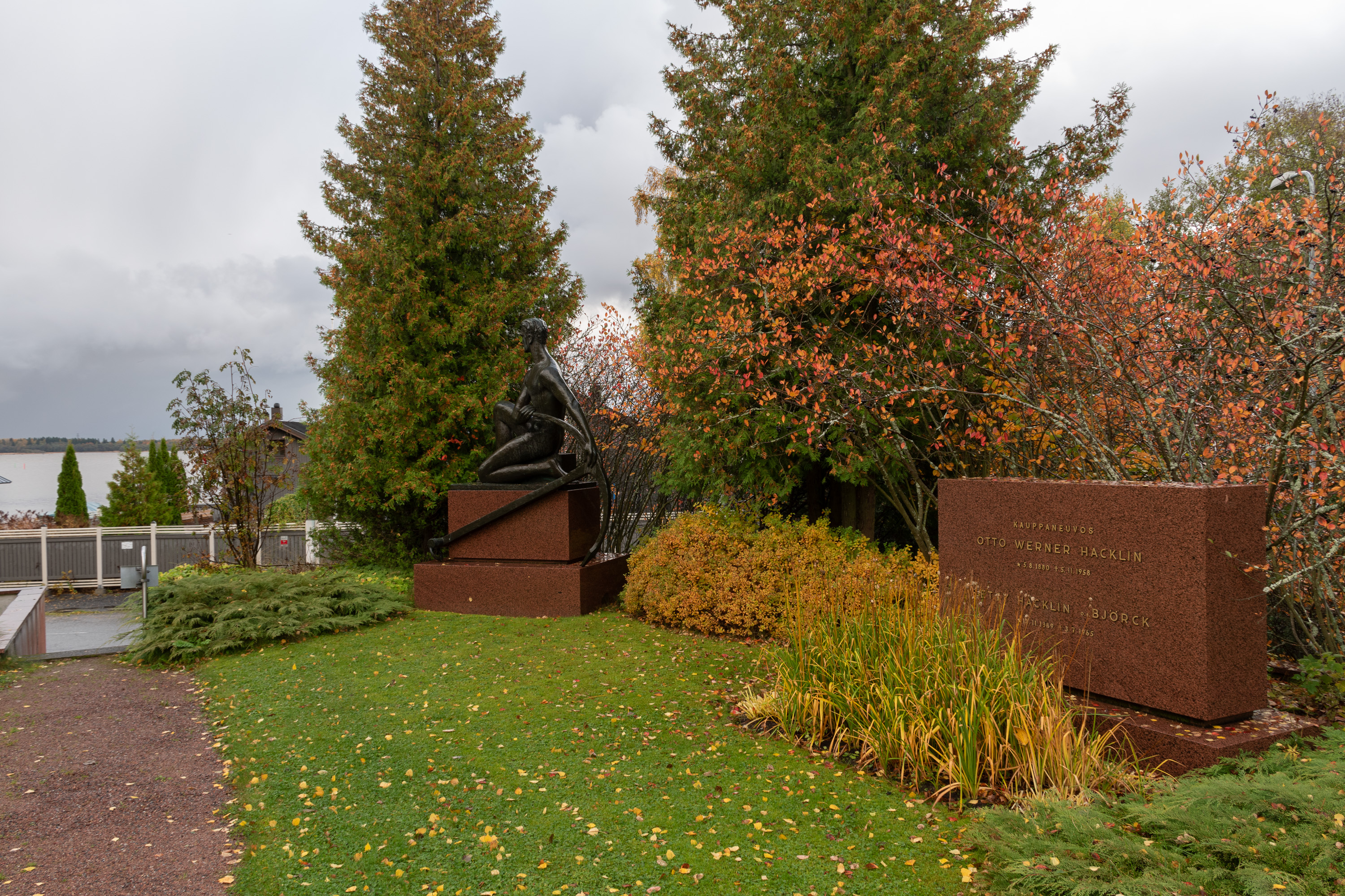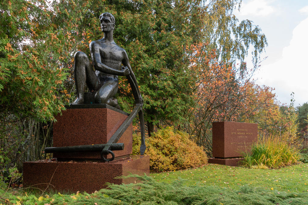 23. От дач можно подняться через дорогу на кладбище, где нас сразу встречает мемориал "Юноша и якорь" на могиле Вернера Хаклина. Отто Вернер Хаклин (Otto Werner Hacklin, 1880-1958), сын смотрителя маяка, сколотил в 1902-1905 в Америке немного деньжат, вернулся на родной Репосаари и основал здесь стивидорную (по погрузке судов) компанию, с 1915 и сам стал судовладельцем, со временем крупнейшим на Репосаари, а в 1925 выкупил ту самую судоверфь после смерти Валрооса и ею тоже до самой смерти владел, в том числе в период ее расцвета, когда строили репарации СССР. Компания Hacklin существует до сих пор, теперь ее главной офис находится в Эспоо, и она оказывает стивидорные услуги в Хельсинки, Котке и Хамине.