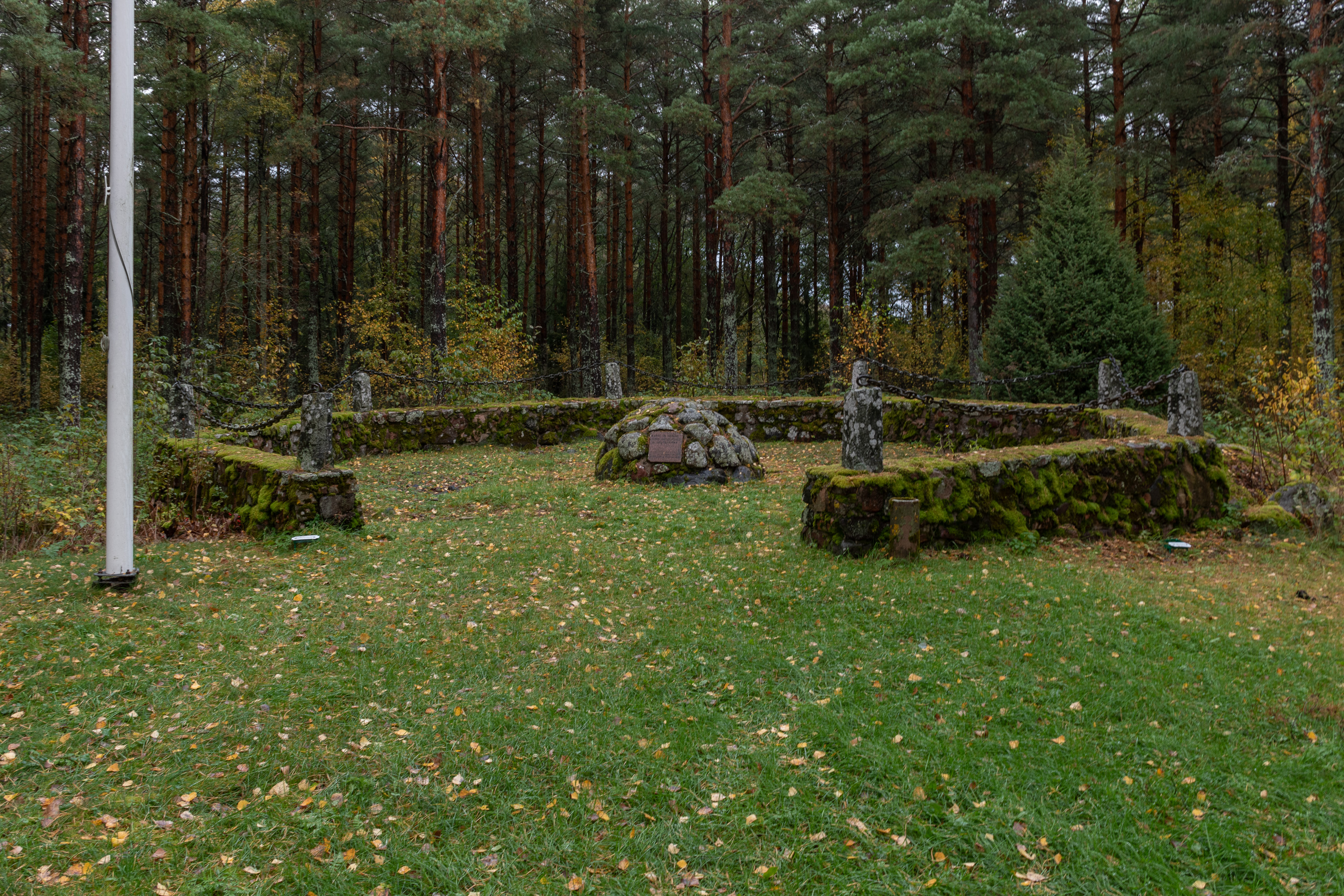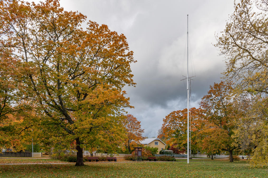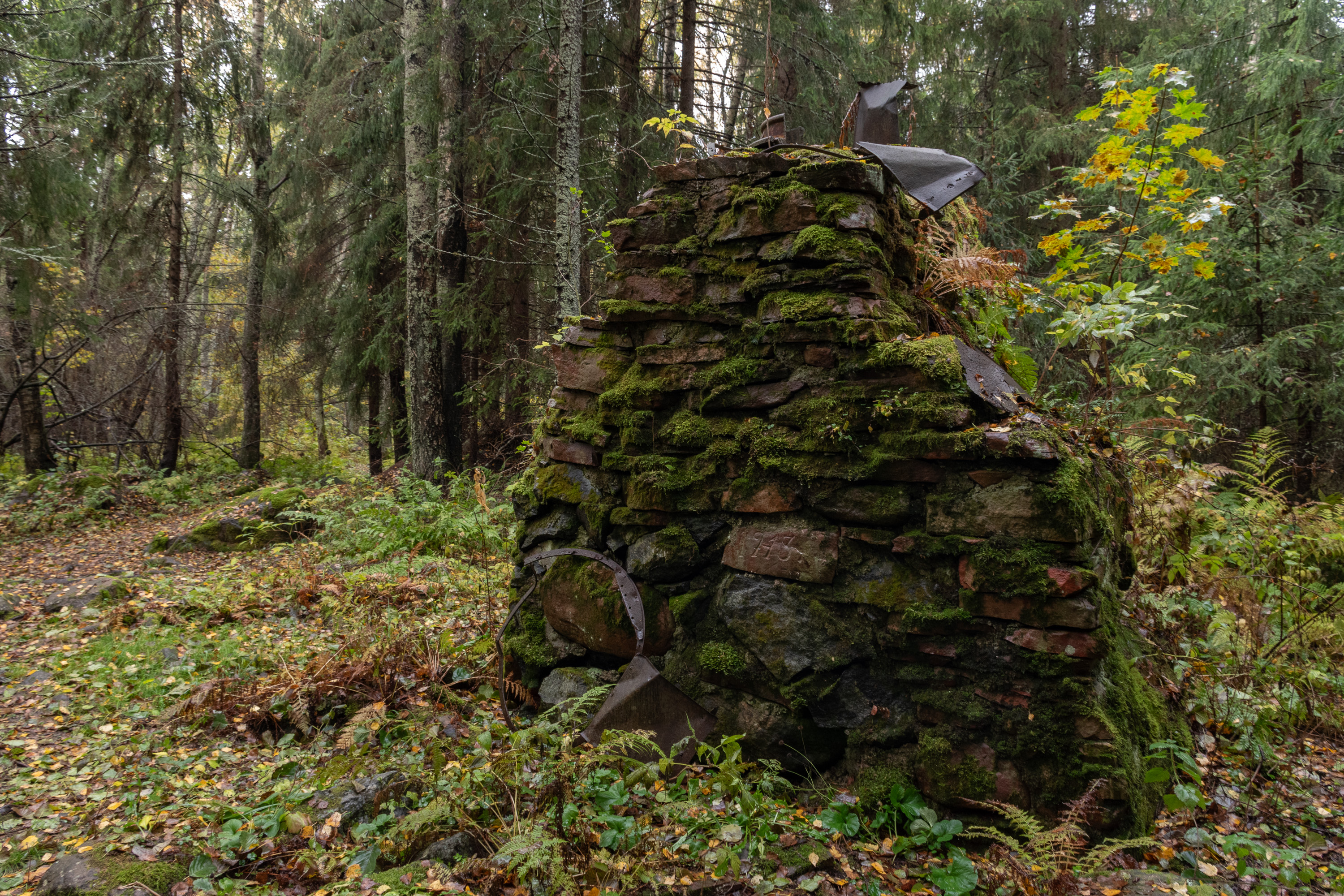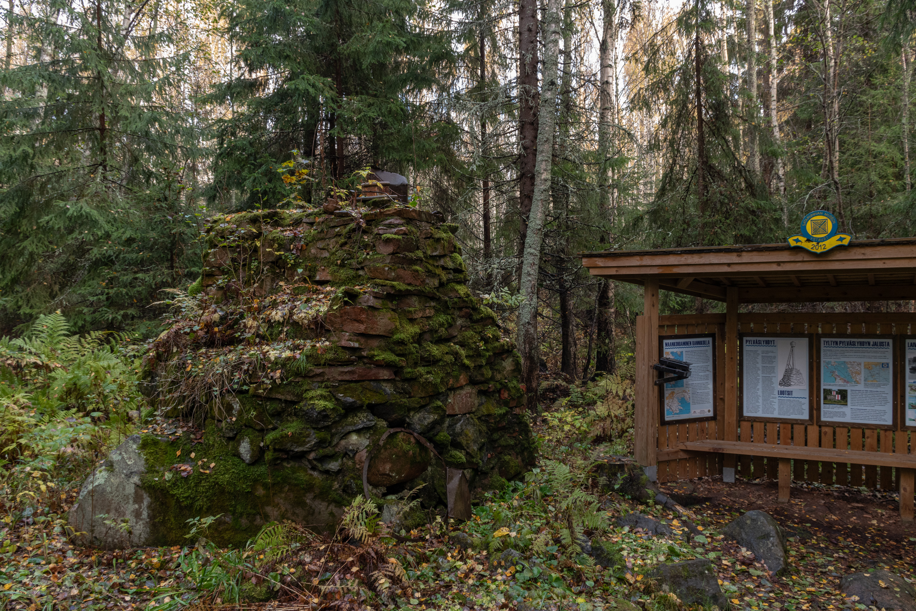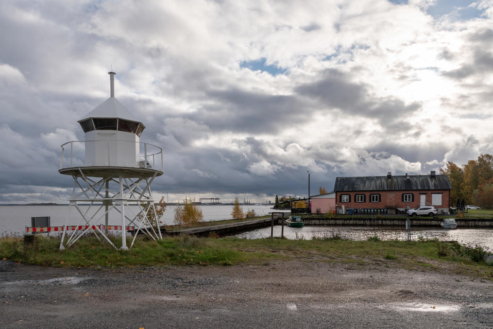 69. Дальше, на острове Раумалуото, у поворота на другую архипелаговую дорогу — фундамент бывшего маяка. Ну или по крайней мере навигационного знака (pylväslyhty, букв. фонарь на столбе) — маяком назвать сложно, просто была большая масляная лампа на высоте 7.3 м. Это был один из створных знаков, указывавших путь из устья реки Кокемяэнйоки в море; он действовал в 1913-1960, сейчас заменен современными створными знаками — большими щитами с вертикальными полосами и электрической подсветкой. Нетипичная достопримечательность, не видел такого раньше. От маленькой придорожной стоянки сюда через симпатичный лес ведет тропа в несколько сот метров; на указателе на стоянку написано Muinaisjäännös — "археологический памятник" — так обычно какие-нибудь могилы каменного века отмечают, а не что-то от 1913 года :)