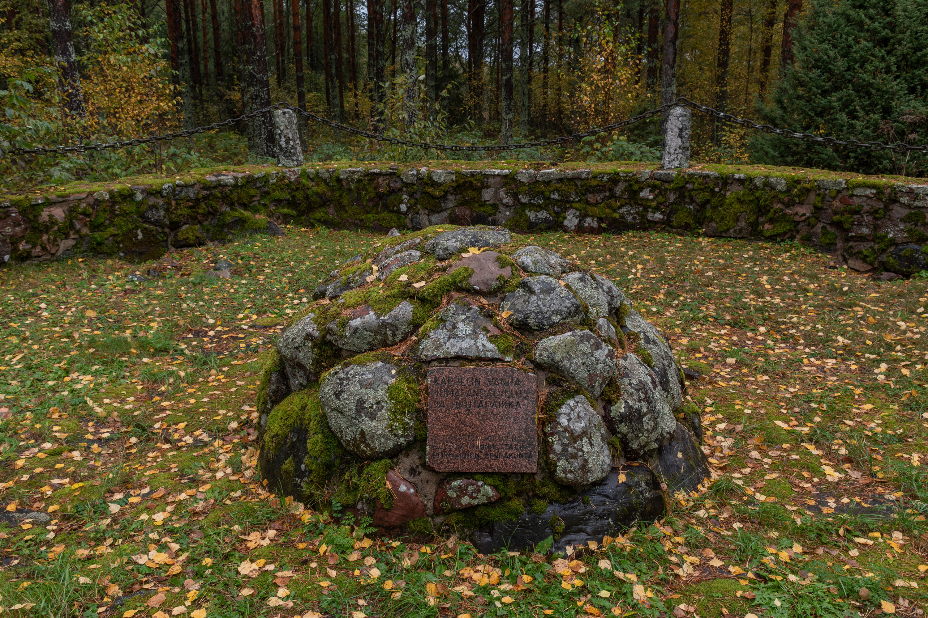 68. Ну, пора возвращаться с Репосаари — можно было б еще в сторону бывшей лесопилки пройтись, там тоже старые дома есть, но не дошел. По дороге с острова — трассе 269 — есть тем не менее еще пара достопримечательностей. Проехав поворот на порт и промзону Тахколуото, можно свернуть в сторонку на следующем острове, тоже сросшемся с предыдущими — Каппелинлуото (Kappelinluoto). Kappeli означает часовня, и здесь предположительно когда-то действительно была некая часовня моряков, хотя ее следов найти не удалось. Но богослужения тут действительно проводились до самых пор, пока не построили в 1876 ту "норвежскую" церковь Репосаари; когда-то здесь также было кладбище. От старого облика острова ничего не осталось — в числе прочего его позже использовали под склад для лесопилки (с тех пор снова заросло лесом уже, конечно) — но все же Репосаарский приход поставил здесь такой памятничек предполагаемой часовне на самом высоком месте острова.