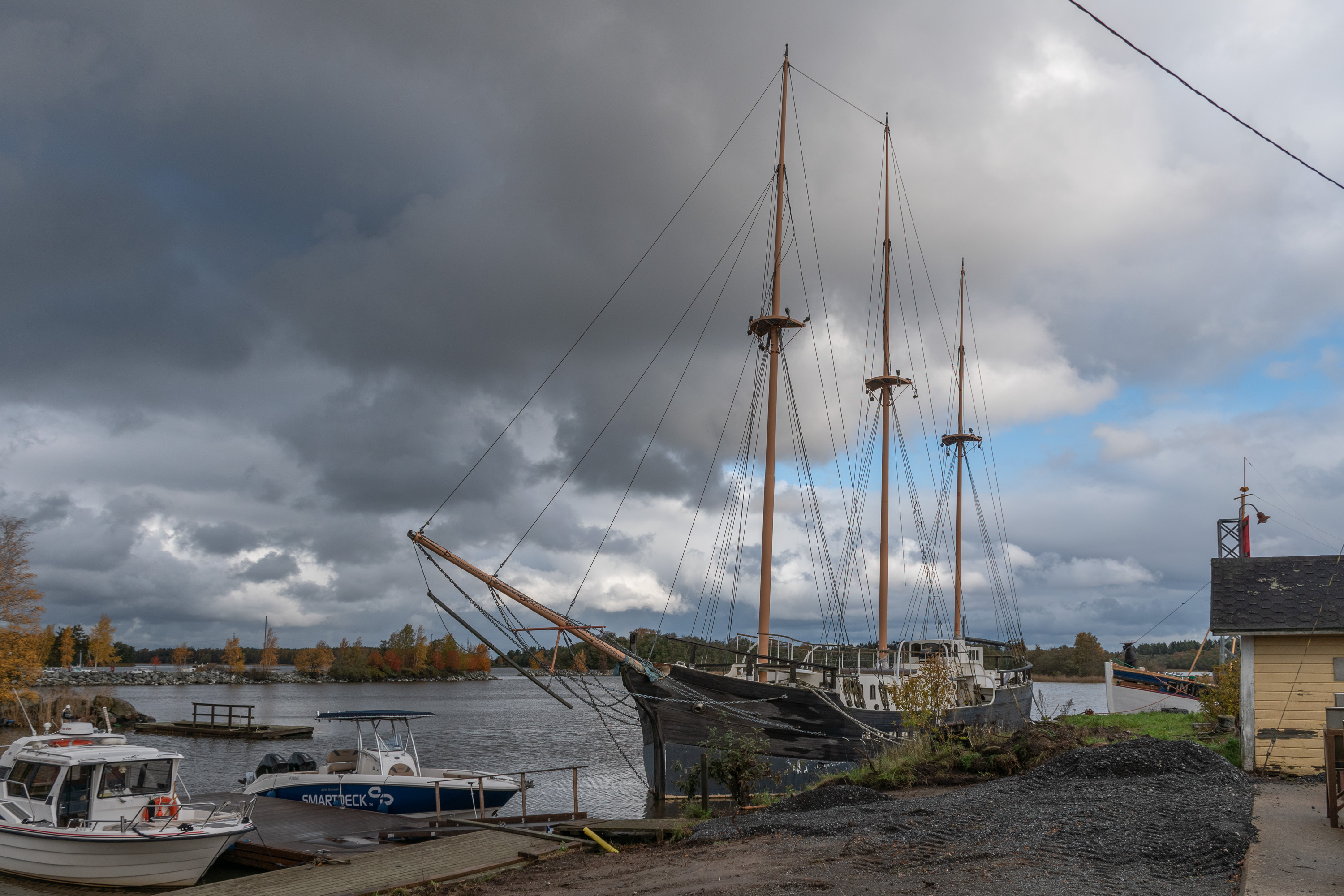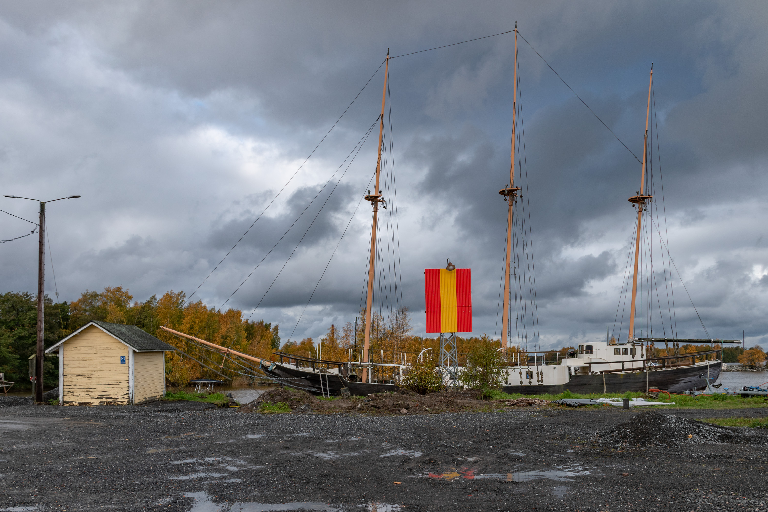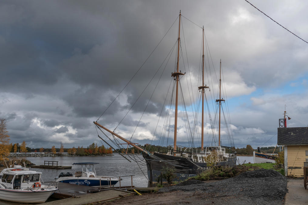 19. После верфи где-то здесь с 1980-х до 2000-х стоял остов шхуны "Койвисто" (Koivisto), одной из последних построенных в Финляндии деревянных парусных шхун (с мотором, конечно) — еще, собственно, под Койвисто, современным Приморском на Карельском перешейке — оттуда недостроенным успели спасти и после войны в 1946 уже в Рауме достроили. На тот момент небольшие деревянные грузовые суда еще достаточно широко использовались, для СССР в рамках репарации тоже строили. "Койвисто", переменивший несколько названий и купленный португальской компанией, в 1963 потерпел кораблекрушение на пути в Ливерпуль в районе Утё, во внешней части территориальных вод Финляндии. Его отбуксировали в Турку, сняли с него все, что можно, корпус выбросили где-то под Маску, и с 1980-х его начали пытаться отремонтировать энтузиасты, для чего территория бывшей верфи Репосаари подходила неплохо. Но за несколько десятилетий так и не осилили — то ли денег не хватило, то ли сил. "Койвисто" в итоге затопили в 2007 году в море в районе Лувии, тоже не очень далеко от Пори.