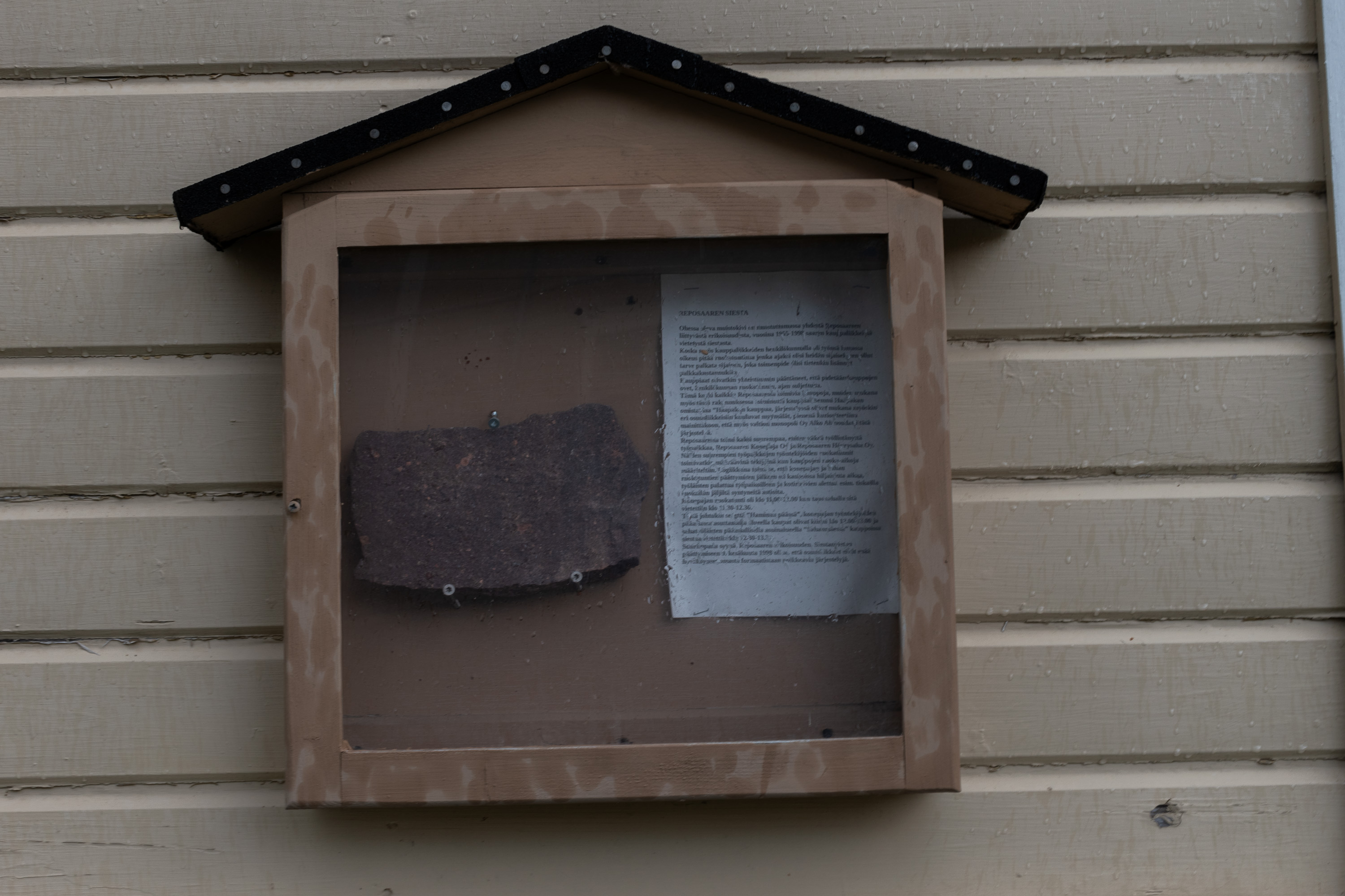 36. На другом доме, бывшем магазине, памятный камень репосаарской сиесте. Фото вышло плохо, но суть в том, что в 1955-1998 году на Репосаари была традиция "сиесты" — все магазины, коих тут раньше было немало, одновременно закрывались на обед на час — договорились друг с другом, что так проще, чем лишних работников нанимать, даже в государственном "Алко" (когда-то тут был самый маленький "Алко" Финляндии, сейчас уже давно нет, конечно) согласились примкнуть к договоренности. Здесь в центре "сиеста" была в 12:00-13:00, потому что у главного работодателя, верфи, был перерыв на обед в 11:00-12:00; а в дальнем районе у лесопилки, соответственно, "сиеста" в 12:30-13:30, потому что на лесопилке был перерыв на обед в 11:30-12:30. На камне написано Siesta 1955-98 Never Forget, краска уже выцвела. Традиция в конце концов закончилась, когда магазинов стало мало, а оставшиеся относились в основном к крупным кооперативам, которые больше не хотели одобрять нестандартные часы работы.