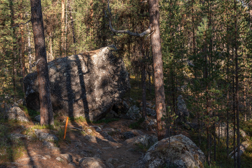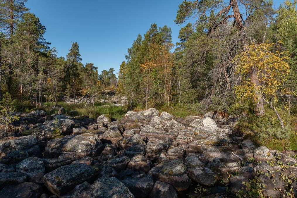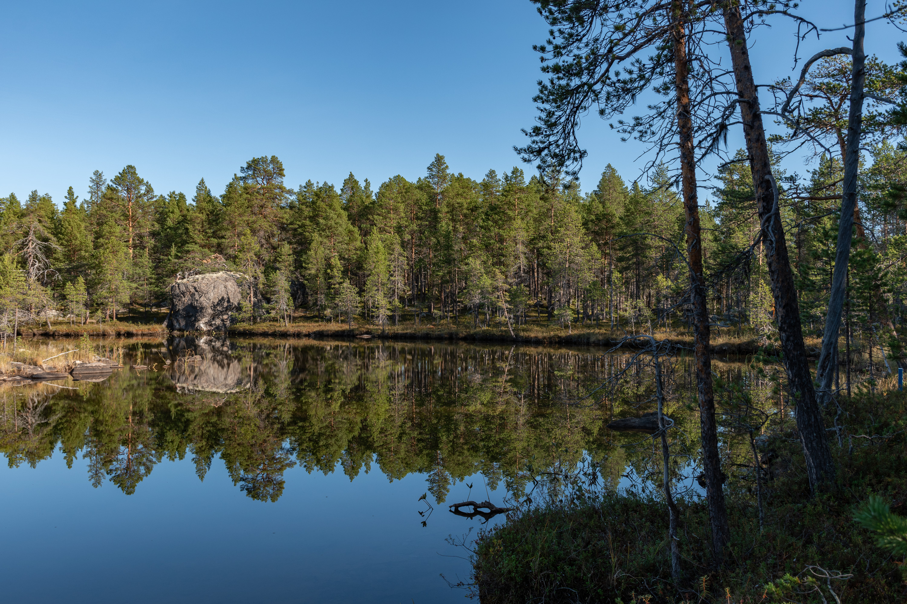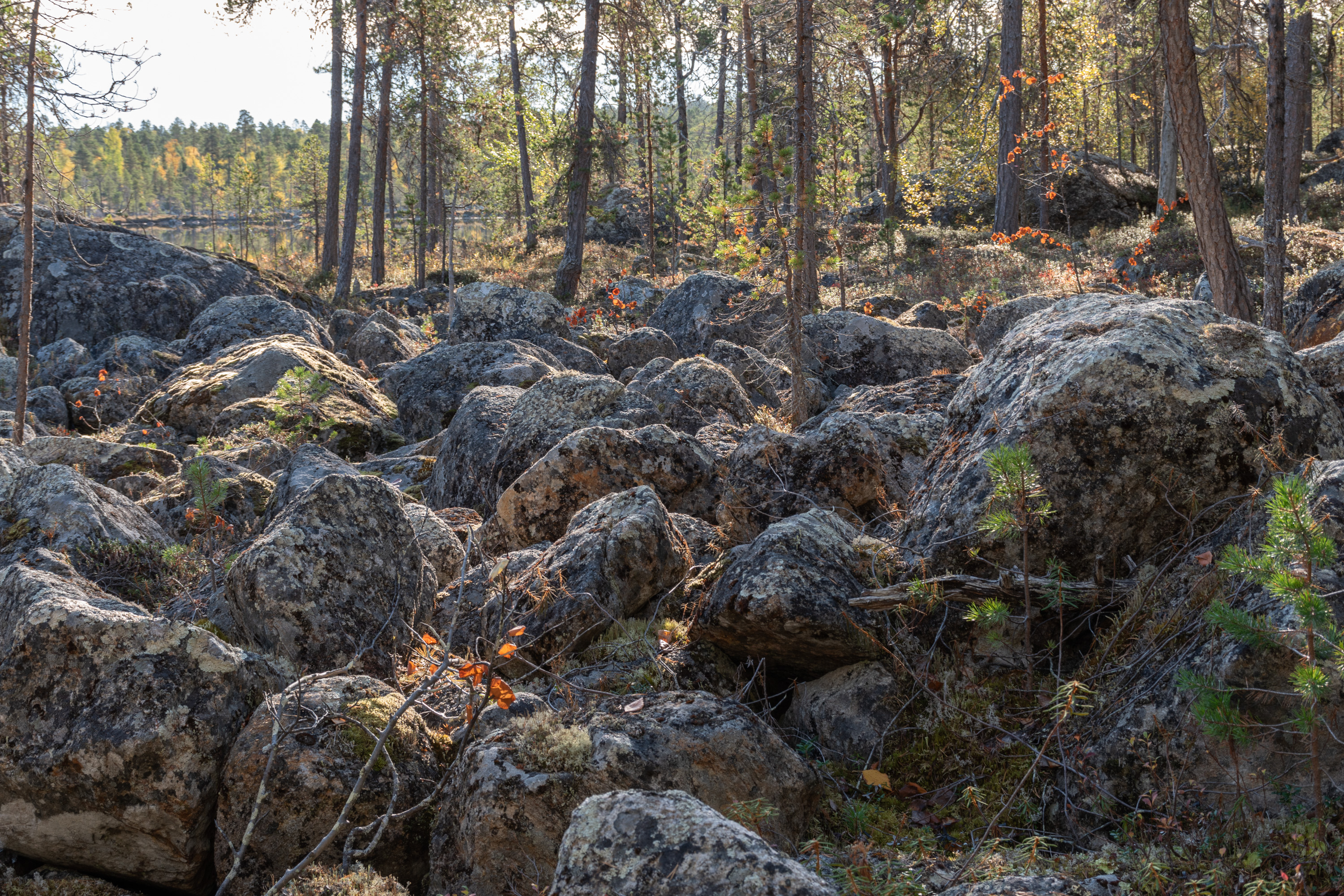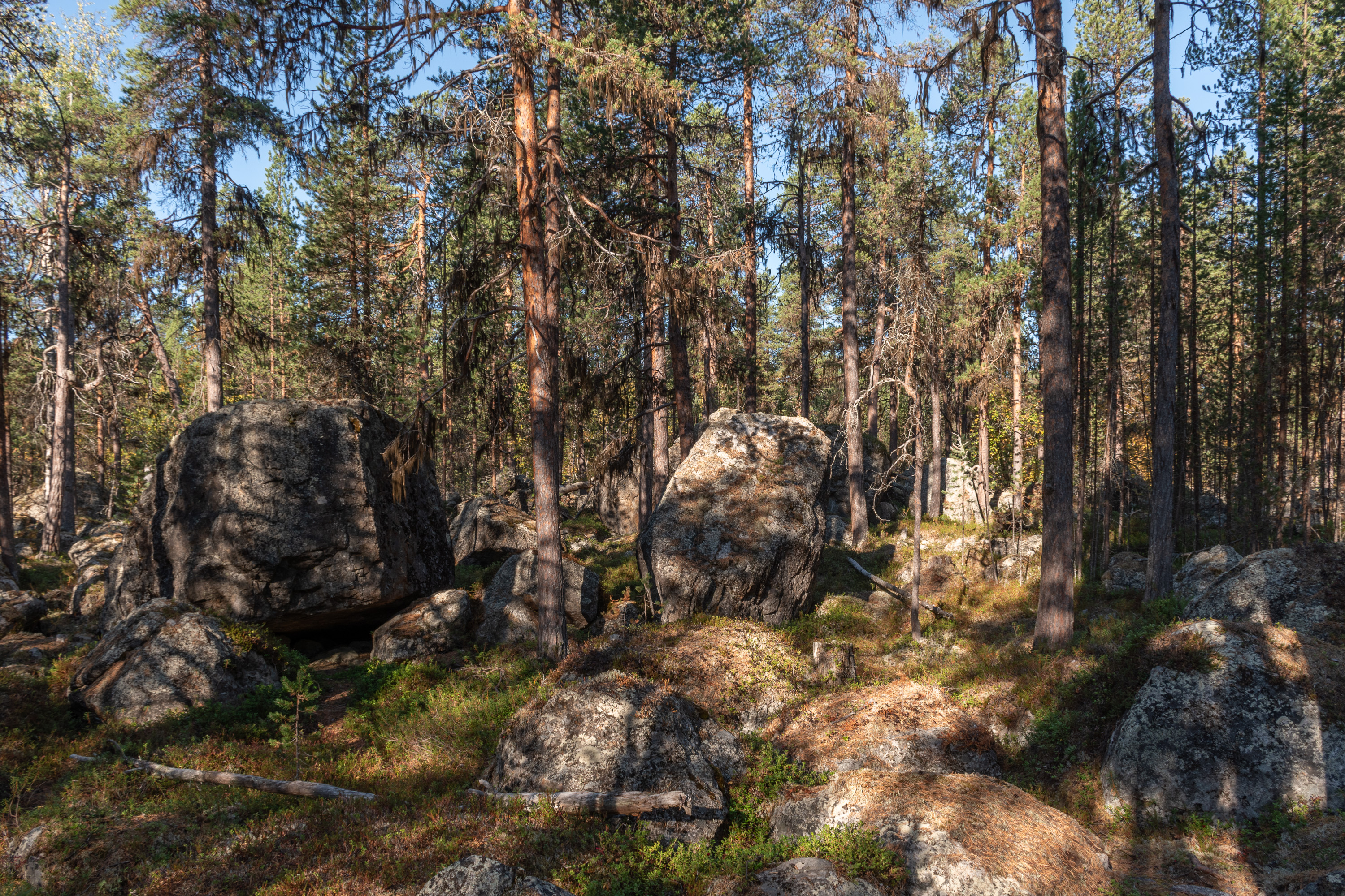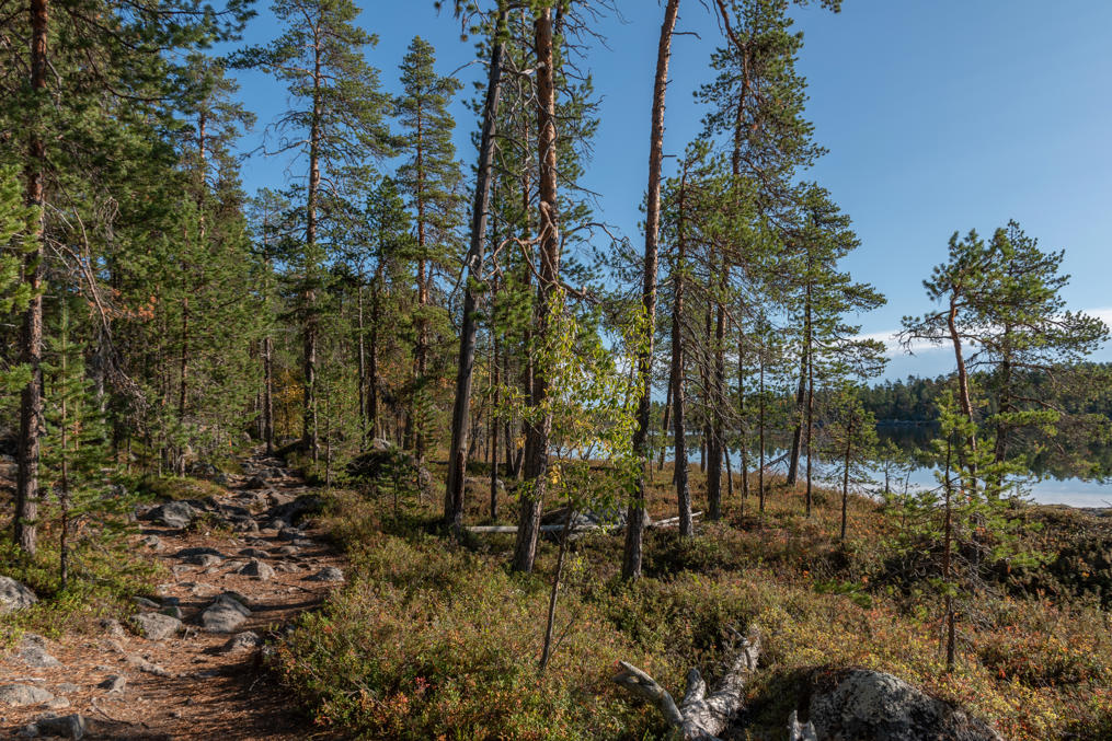 В наши дни пеший маршрут от окраины Инари до церкви поддерживается Лесным управлением и формально относится к так называемой рекреационной территории Инари (Inarin retkeilyalue) — по факту это набор из нескольких разрозненных маршрутов в окрестностях села, например, на гору Отсамо, которую я показывал в старом посте. От маршрута я ничего особо интересного не ожидал, но он оказался довольно красивым — через лес с большими валунами, берегом нескольких мелких озер. Берега Инариярви не только сильно расчленены (его заливы даже традиционно зовутся фьордами — vuono по-фински), но и вокруг оно почти со всех сторон окружено лабиринтом из намного более мелких озер; вот и эта тропа идет берегом Пунтсиярви, Малого и Большого Пиелпаярви.