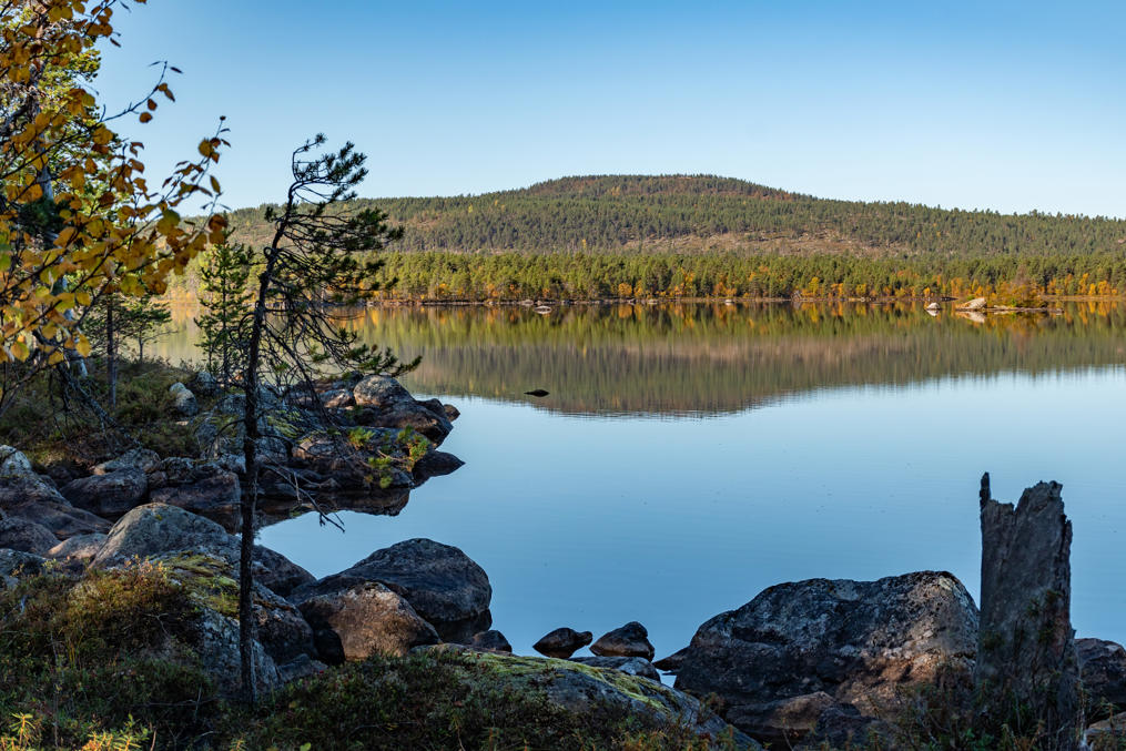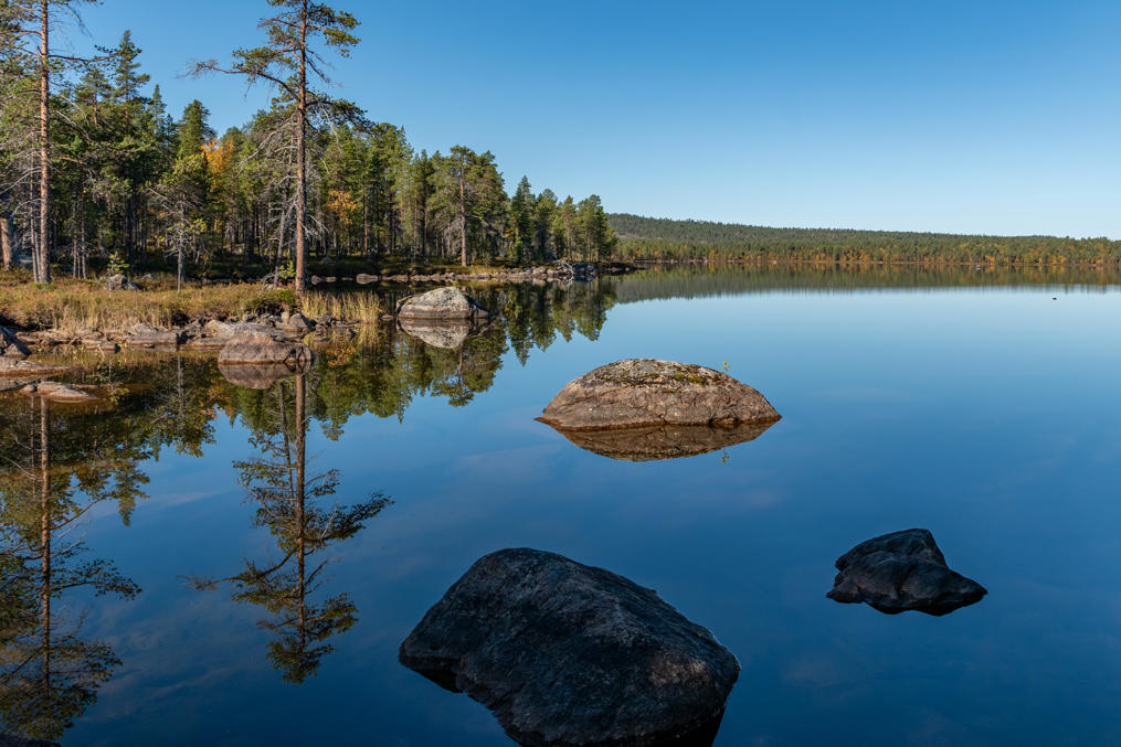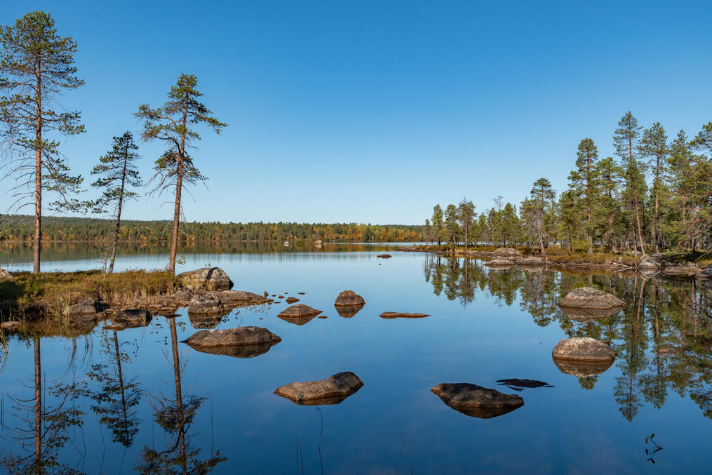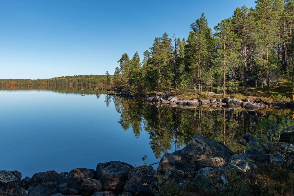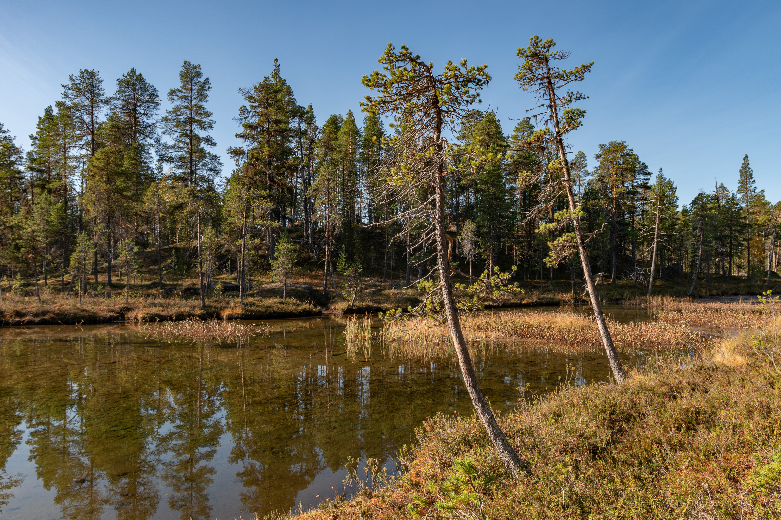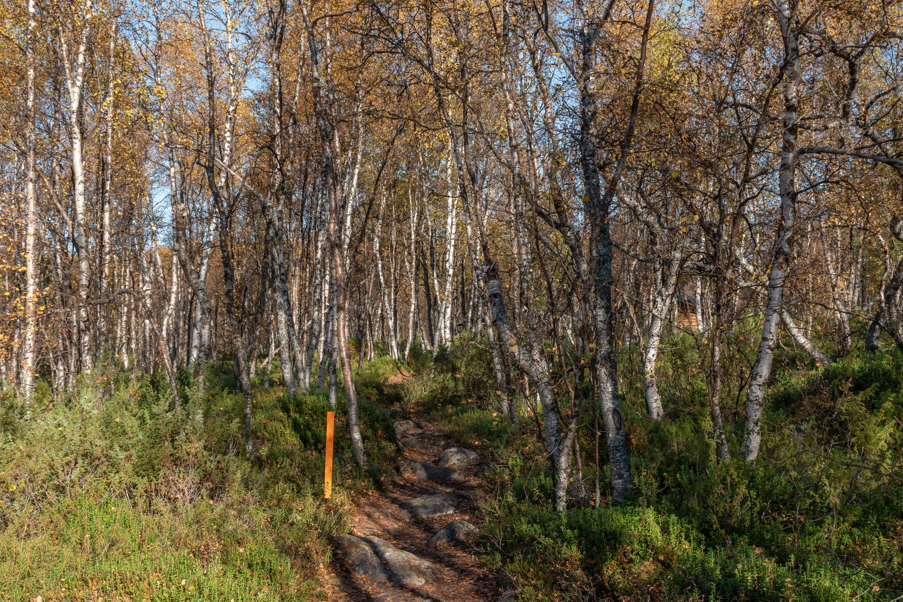 В наши дни пеший маршрут от окраины Инари до церкви поддерживается Лесным управлением и формально относится к так называемой рекреационной территории Инари (Inarin retkeilyalue) — по факту это набор из нескольких разрозненных маршрутов в окрестностях села, например, на гору Отсамо, которую я показывал в старом посте. От маршрута я ничего особо интересного не ожидал, но он оказался довольно красивым — через лес с большими валунами, берегом нескольких мелких озер. Берега Инариярви не только сильно расчленены (его заливы даже традиционно зовутся фьордами — vuono по-фински), но и вокруг оно почти со всех сторон окружено лабиринтом из намного более мелких озер; вот и эта тропа идет берегом Пунтсиярви, Малого и Большого Пиелпаярви.