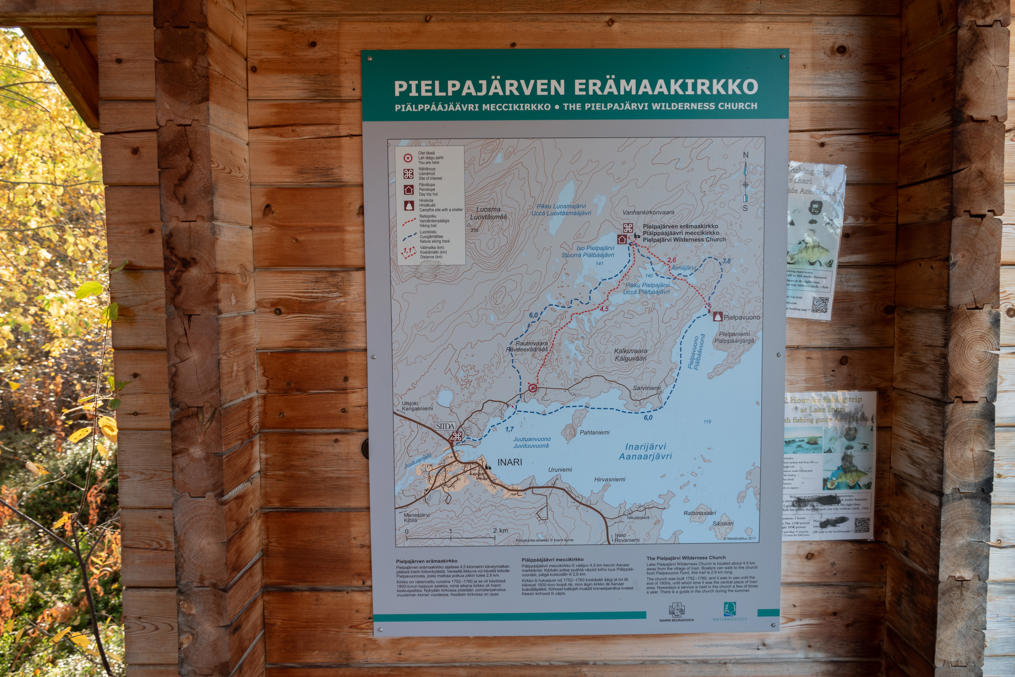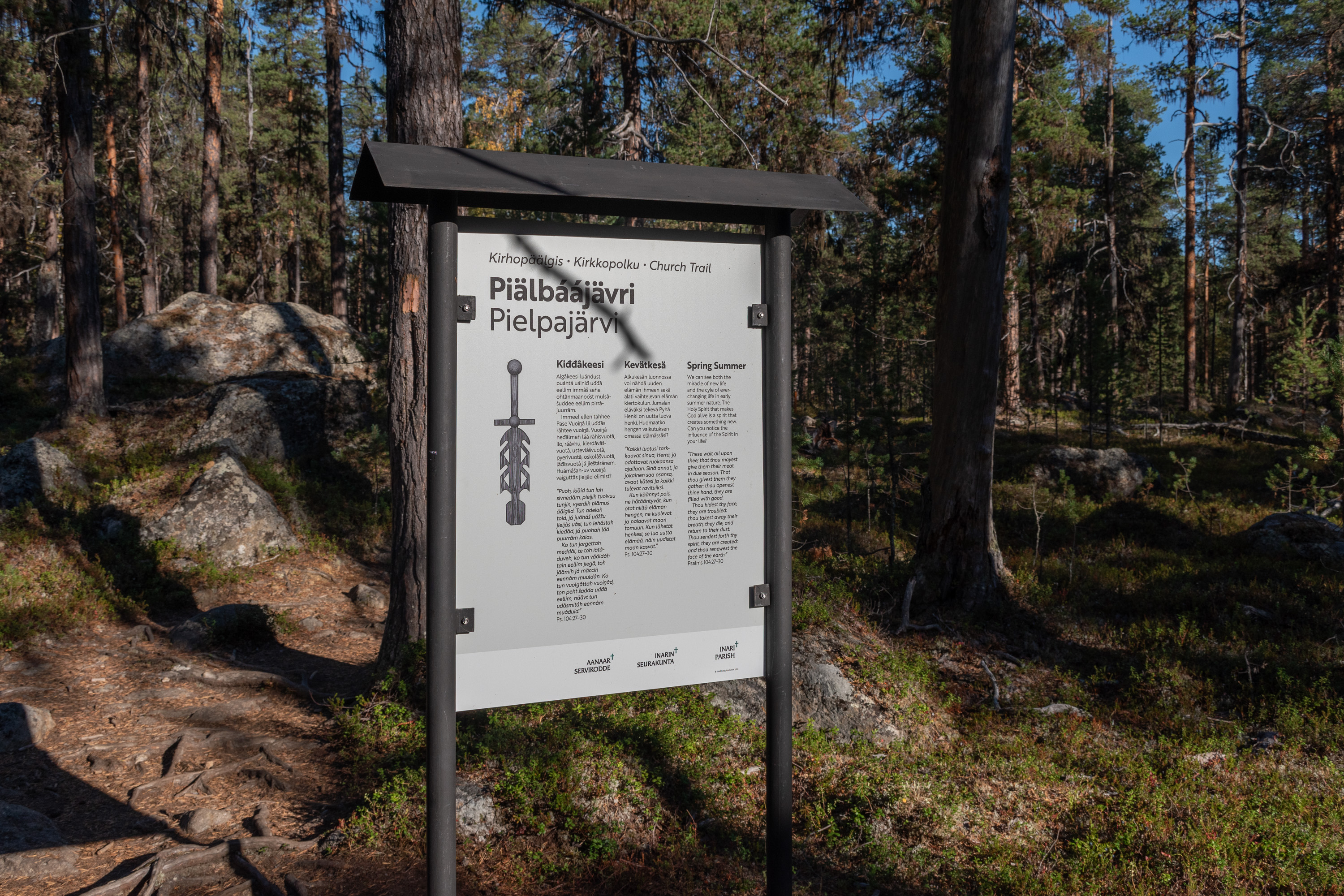Информационные таблички на тропе рассказывают не только о временах года в местной природе, но и предлагают подумать о вечном. Тропа не является кольцевой — обратно нужно возвращаться той же дорогой; впрочем, от церкви она продолжается дальше к берегу Инариярви. По озеру Инариярви проводятся круизы (в сезон 2024 было с 10.6 до 15.9), с которых опционально могут высадить как раз к этой тропе, то есть можно из центра Инари поплыть в круиз, посмотреть на острова, потом высадиться, пройти по тропе к церкви и потом от церкви дальше пешком вернуться в центр Инари. Ну, я такой вариант не пробовал.