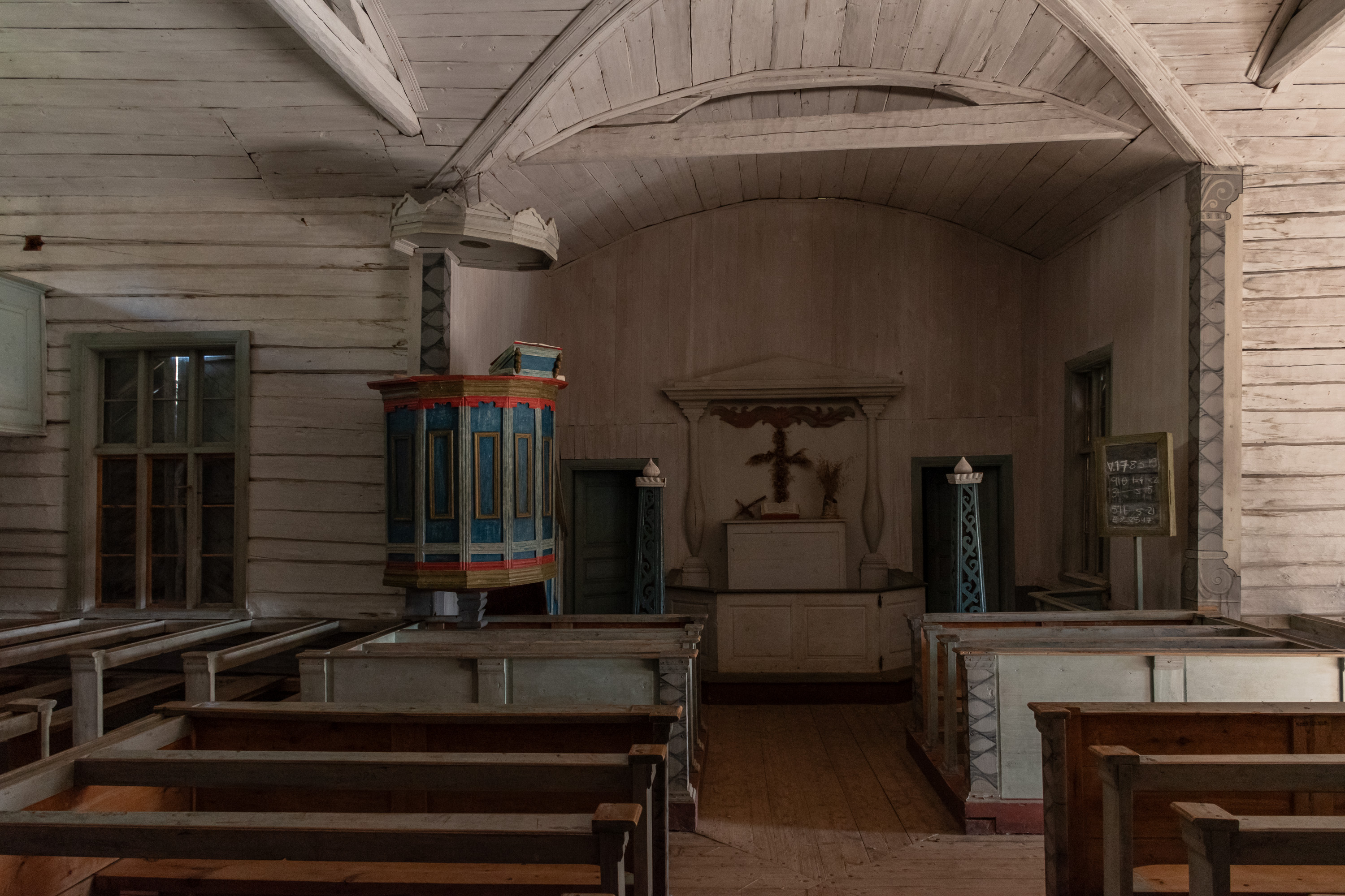Но вторая церковь в итоге пережила третью — именно благодаря своему отдаленному расположению. В Зимнюю войну в 1940 Инари бомбили, и новая церковь сгорела дотла. Старую заброшенную кое-как подлатали и начали в ней проводить богослужения хотя бы на Юханнус (Иванов день). Современную церковь в Инари, т. н. Саамскую церковь (Saamelaiskirkko), построили после войны в 1952; хотя лично мне она кажется менее интересной, чем многие другие церкви эпохи послевоенной реконструкции Лапландии. Ну а традиция в старой церкви проводить летние богослужения так и осталась, и в 1970-х ее капитально отреставрировали, вернув облик из 1840-х.