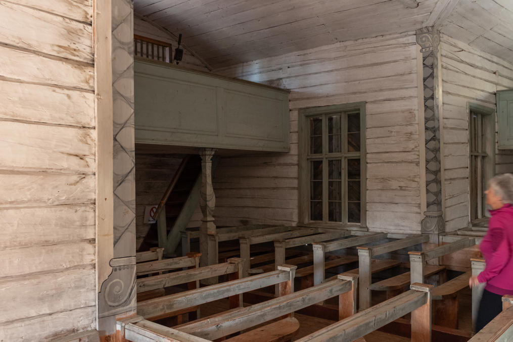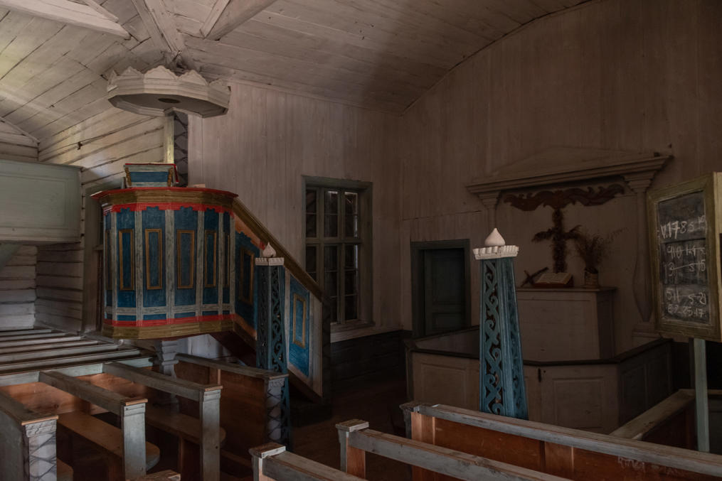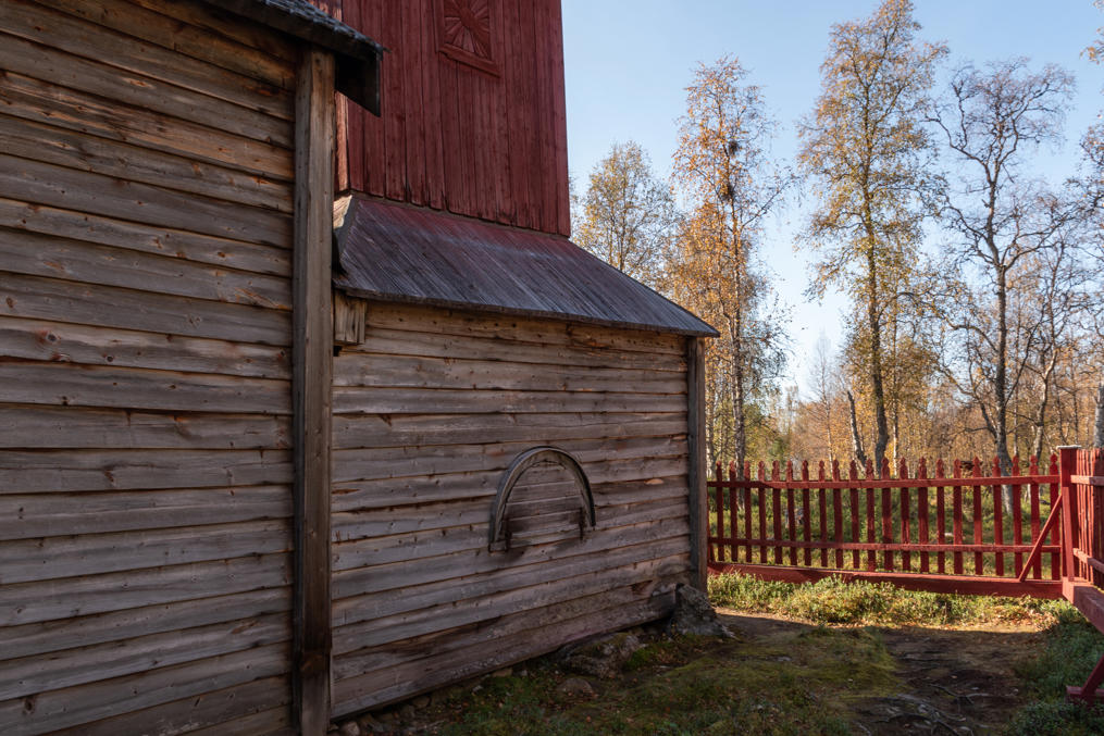 Ну а церковь действительно интересная, конечно, довольно небольшая и неказистая. Кто ее проектировал — не знаю, но строили под началом Андерса Хелландера (Anders Hellander, 1718-1757), первого священника из находившегося еще дальше на север, в долине Таны, Утсйоки; приход Инари тогда стал подчиненным по отношению к Утсйоки. Рядом с церковью нет никакого кладбища, покойных в Инари традиционно хоронили на островах Инариярви. Впрочем, про колокольню есть старая байка, что там под полом работница когда-то похоронила младенца; никаких следов такого захоронения при реставрации не нашли, но все равно говорят, что иногда слышат, как в колокольне ребенок плачет.