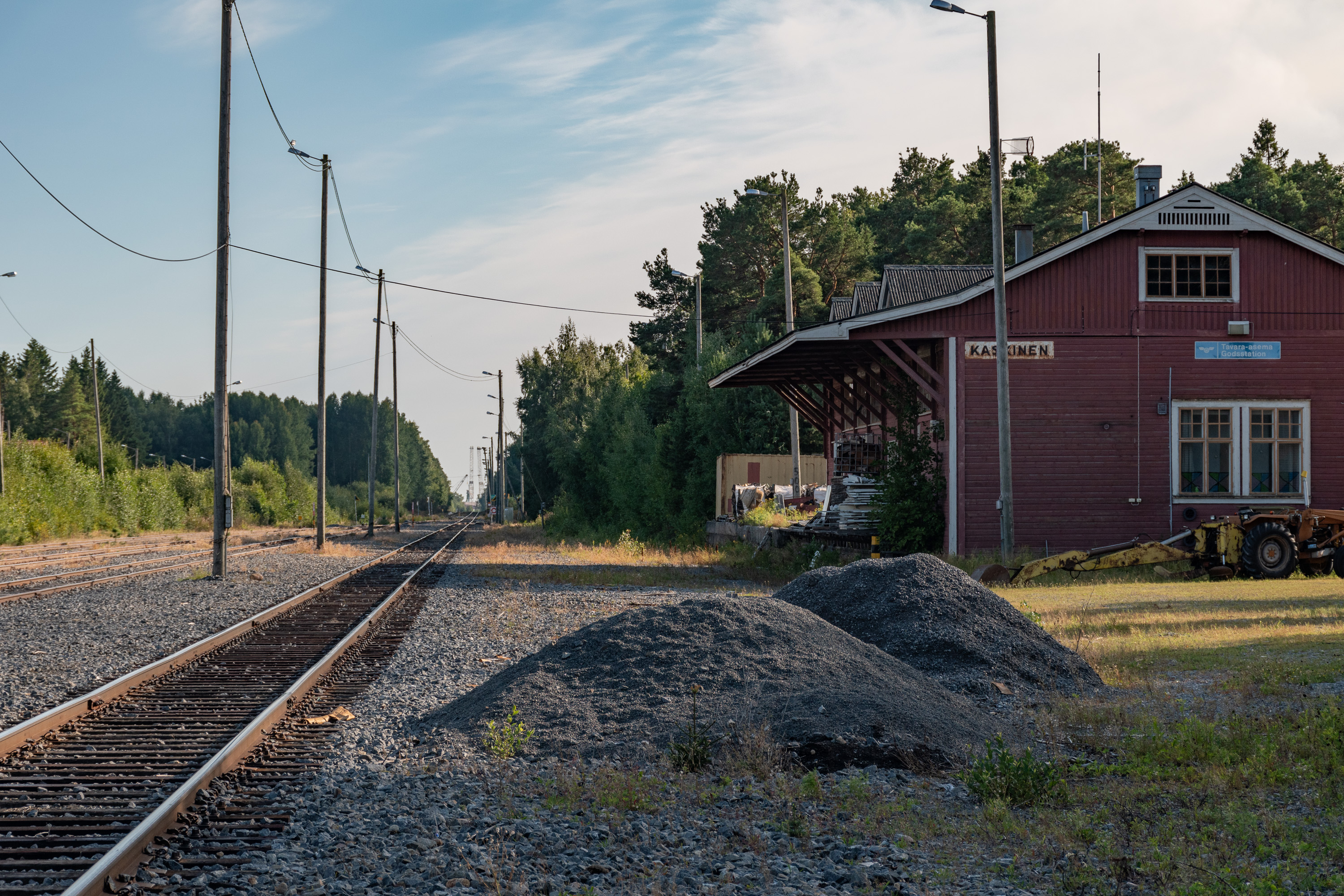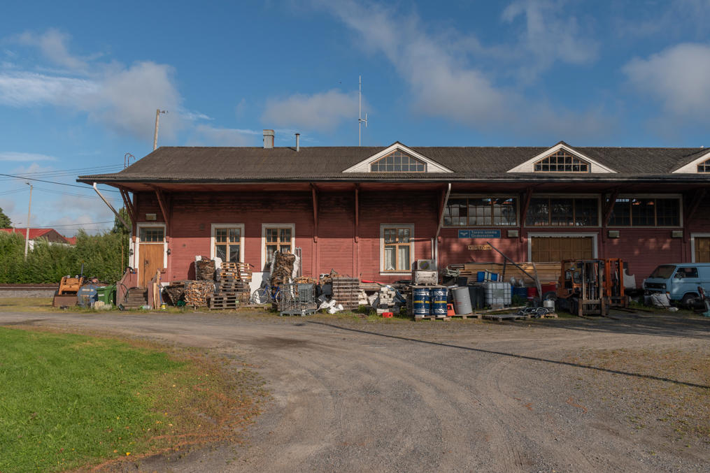 24. В паре сот метров от вокзала сохранилось и здание товарной станции, по-видимому, использующееся теперь как какой-то склад и заваленное хламом. Еще осталось небольшое паровозное депо, которое я не снимал. От станции ж/д продолжается дальше на юг подъездными путями в порт и на комбинат Metsä Fibre.